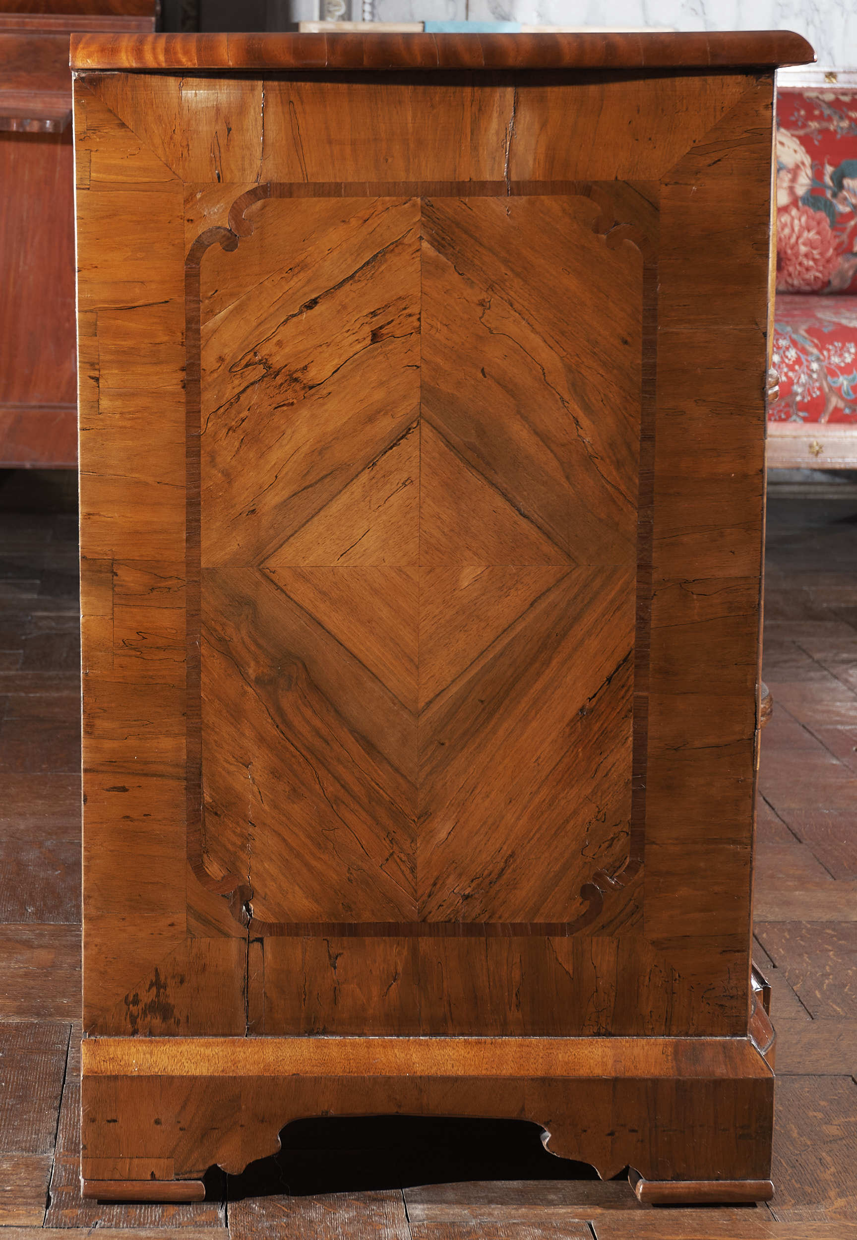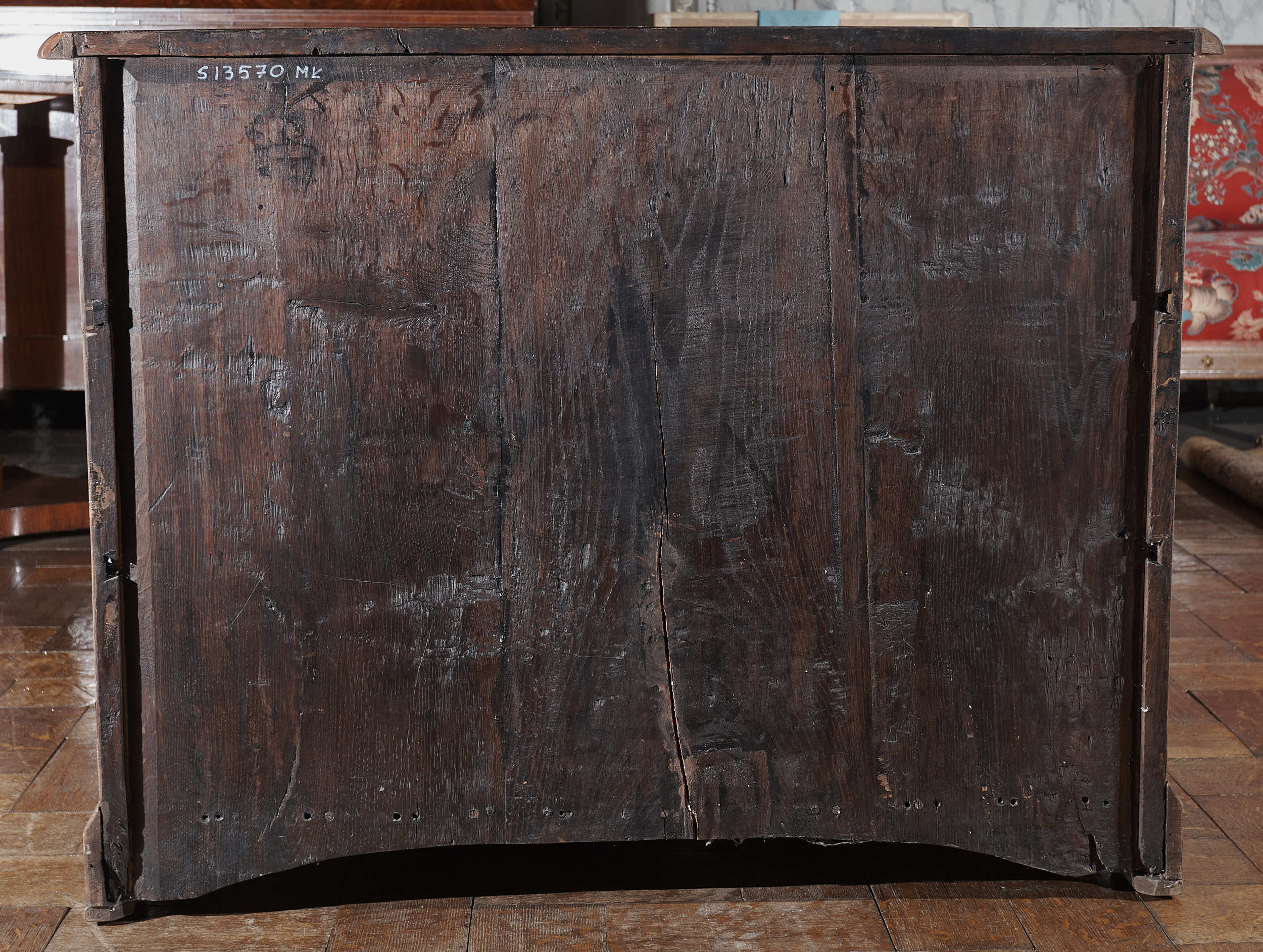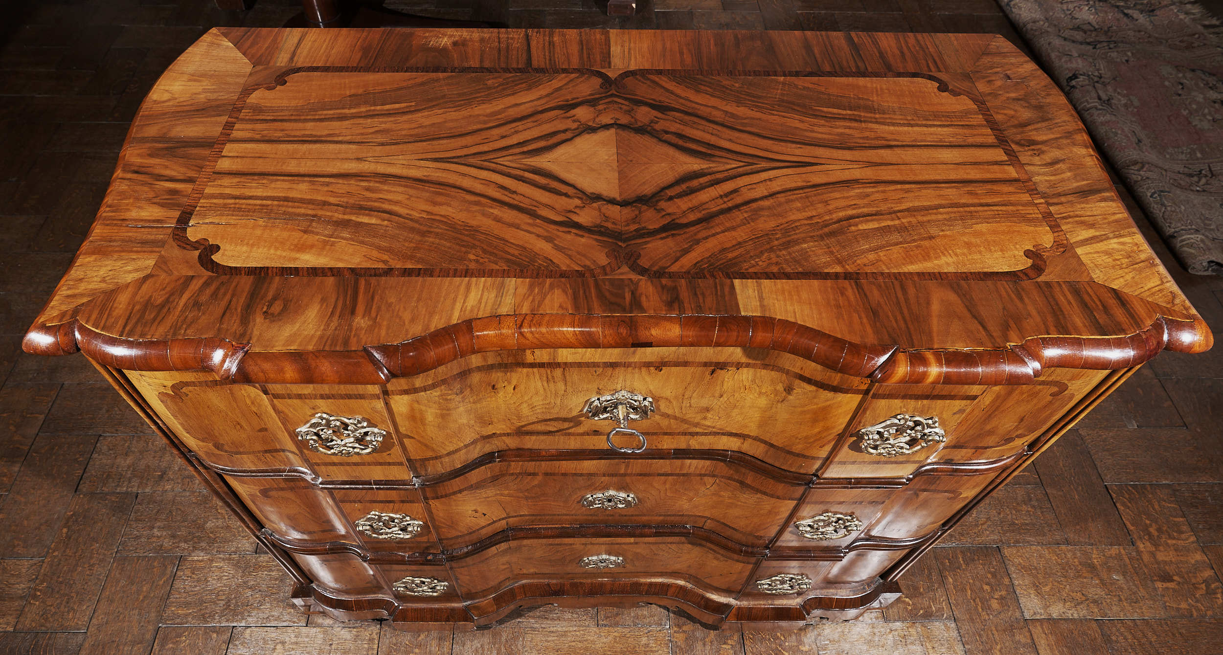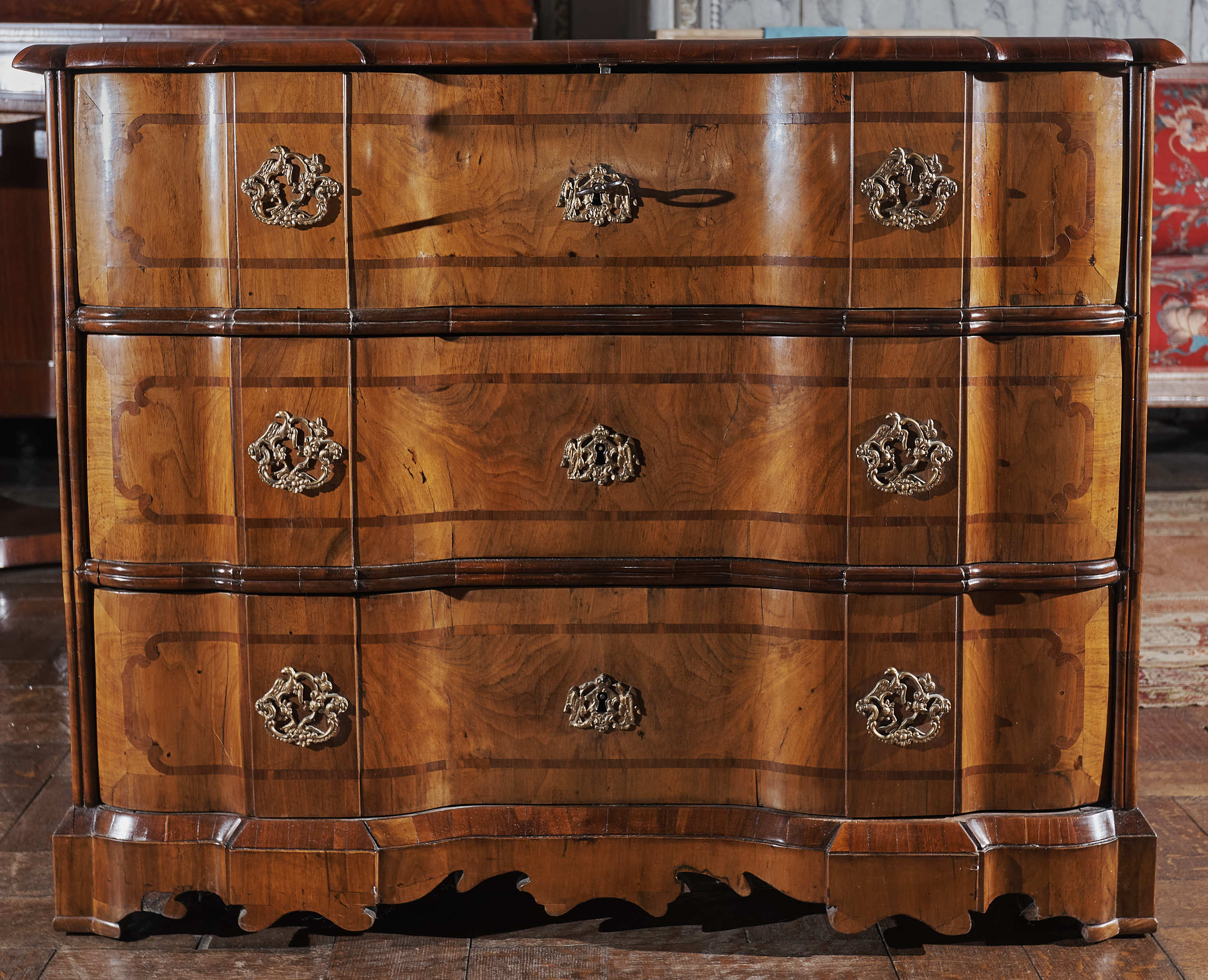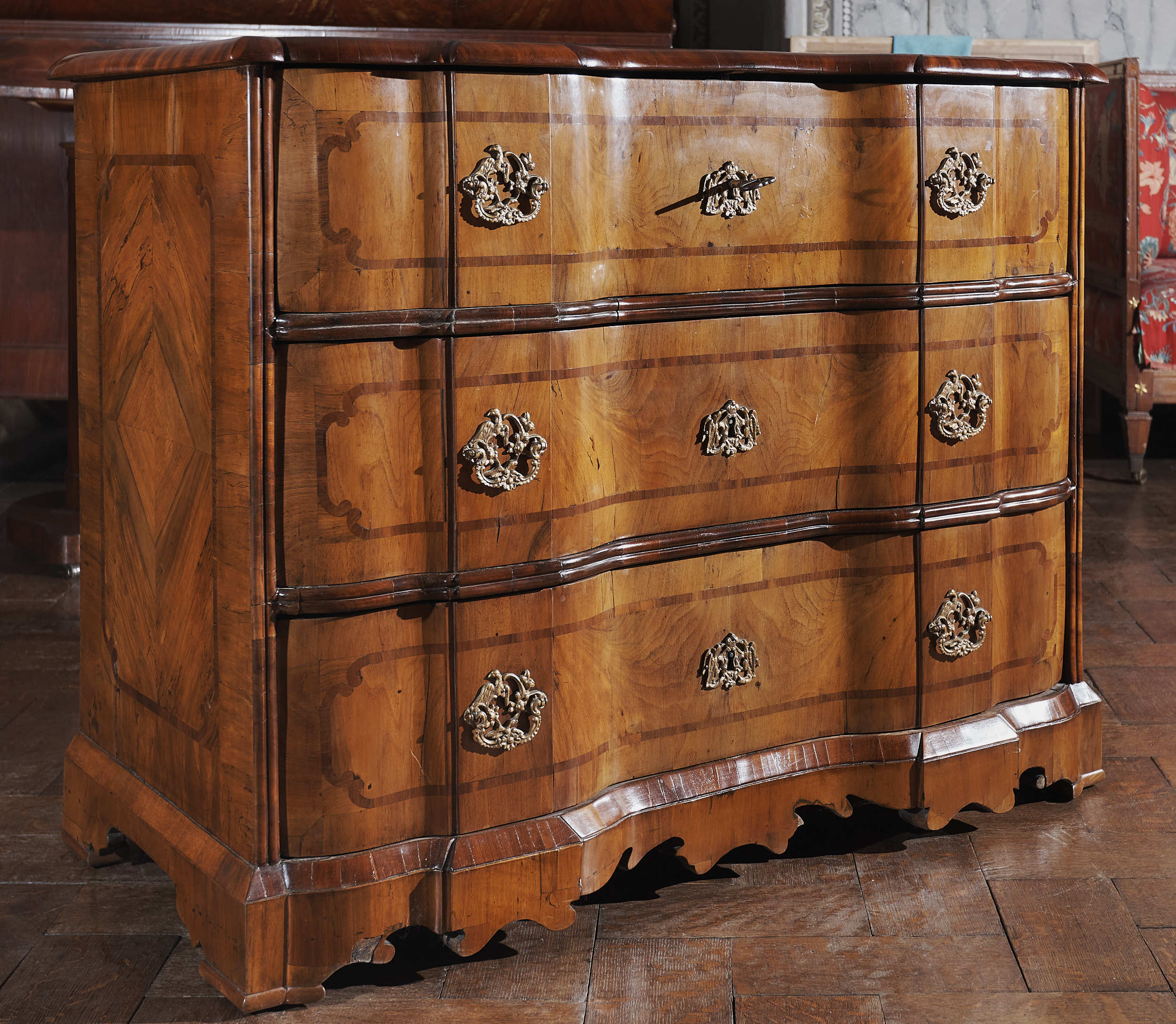 Komoda z XVIII wieku, datowana na lata 1740-1760. Posiada proste boki i falujący front z trzema szufladami. Przednie nogi konsolowe przechodzą w dekoracyjnie wycięty fartuch, który przesłania prześwit pod meblem. Fornir intarsjowany wykonano z różnych odmian orzecha i mahoniu. Lica szuflad, boki i blat zdobione intarsją w postaci zgeometryzowanej wstęgi. Blat obwiedziony dekoracyjnym ćwierćwałkiem z uskokami. Pomiędzy szufladami zastosowano poziome, rozdzielające półwałki. Szuflady posiadają brązowe okucia ozdobione rocaillami. Każda z nich posiada dwa uchwyty po bokach oraz ozdobne mniejsze okucie na środku przysłaniające dziurkę od klucza.