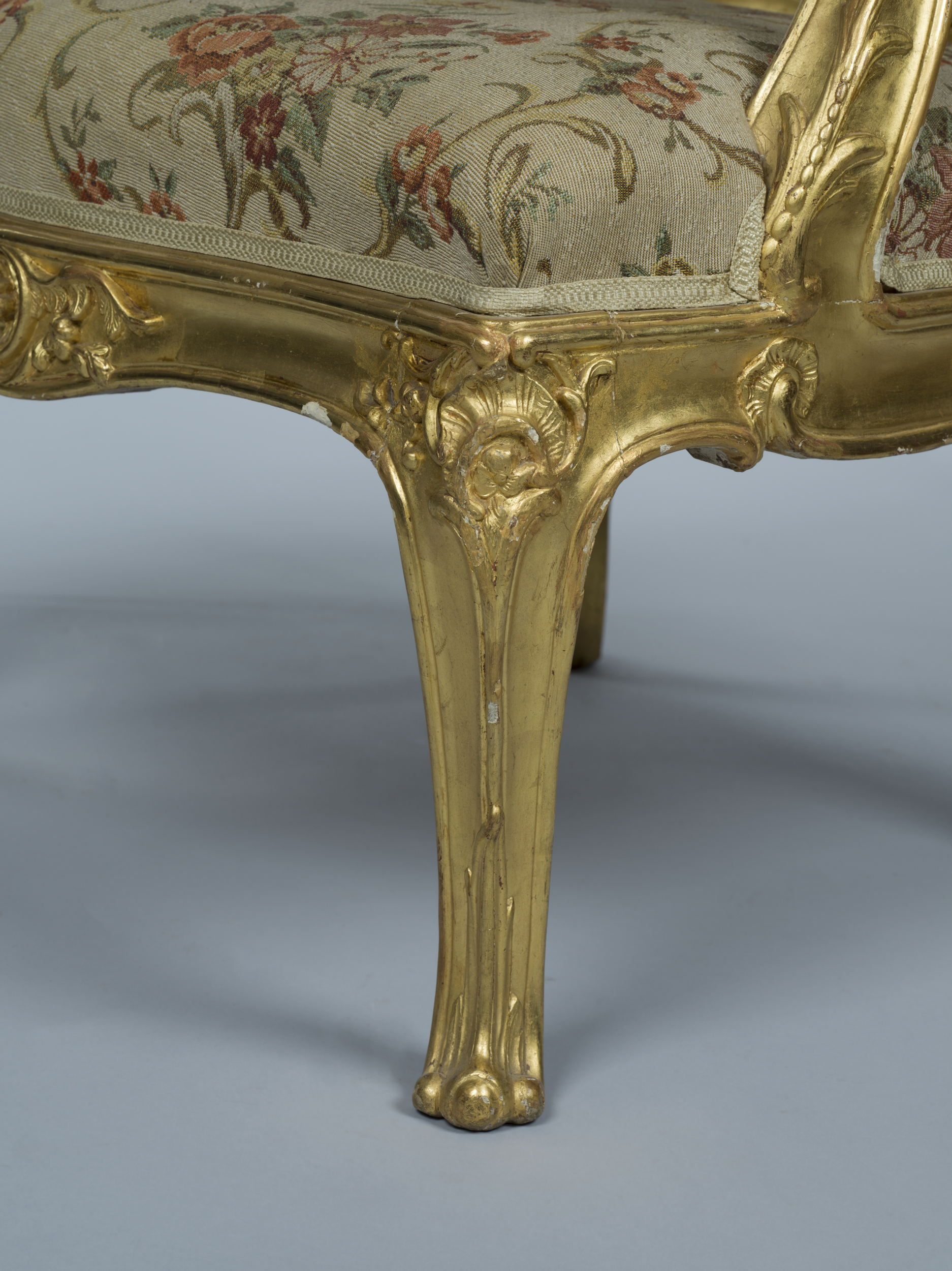 Rokokowy fotel w stylu Ludwika XV, z wolnym oparciem pleców w kształcie trapezu o zaokrąglonych narożach oddzielonym od siedziska wspartego na czterech wygiętych nogach en cabriole reprezentuje typ francuskich mebli noszących cechy stylu przejściowego wywodzących się od regencyjnych foteli à la rain cieszących się popularnością od lat 20. XVIII w. zdobionych motywami zapowiadającymi rokoko. Oparcie pleców oddzielone od siedziska, zachowało jeszcze barokowy kształt prostokąta o lekko sfalowanej górnej krawędzi. Falista forma pozostałych elementów zaciera linie konstrukcyjne mebla; zapowiada nadchodzące rokoko. Siedzisko fotela wsparte jest na czterech wygiętych nóżkach typu cabriole zakończonych ograniczonymi do minimum zwierzęcymi pazurami. Widoczne części drewnianej konstrukcji pokrywa rzeźba z muszlami, drobnymi, pojedynczymi kwiatkami oraz małżowinami akcentującymi podziały kompozycyjne. Tapicerowane oparcie i siedzisko zapewnia komfort użytkownikom.