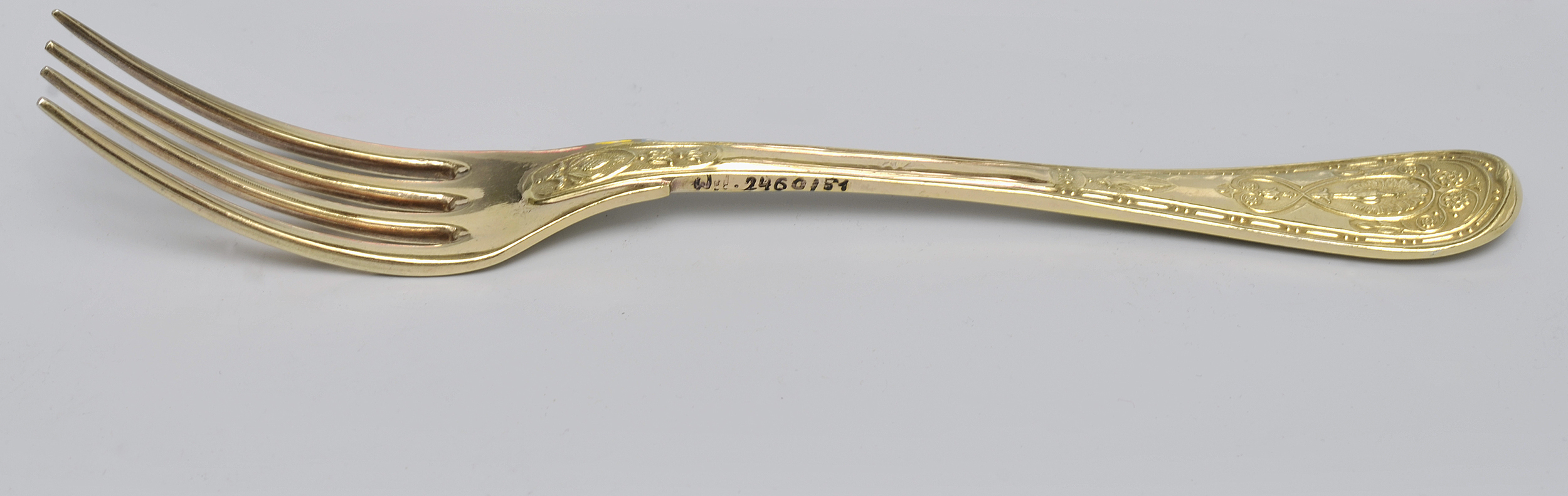 Czterozębny, deserowy widelec jest jednym z siedemdziesięciu dwóch widelców zachowanych w wilanowskiej kolekcji. Co ciekawe, komplet na 72 osoby wykonany został przez dwóch złotników. Łyżki i widelce wykonał Dominique F. Naudin, a noże Martin G. Biennais.