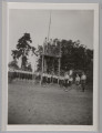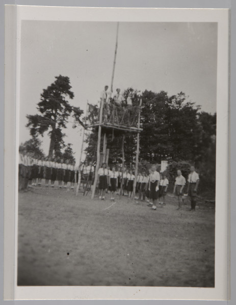 Fotografia przestawia grupę młodzieży w strojach galowych stojącą w półokręgu. Wszyscy mają na sobie jasne koszule i ciemne spodnie/spódnice. Pośrodku stoi drewniana konstrukcja z drabiną i podestem na zwieńczeniu. Na podeście stoi kilka osób.