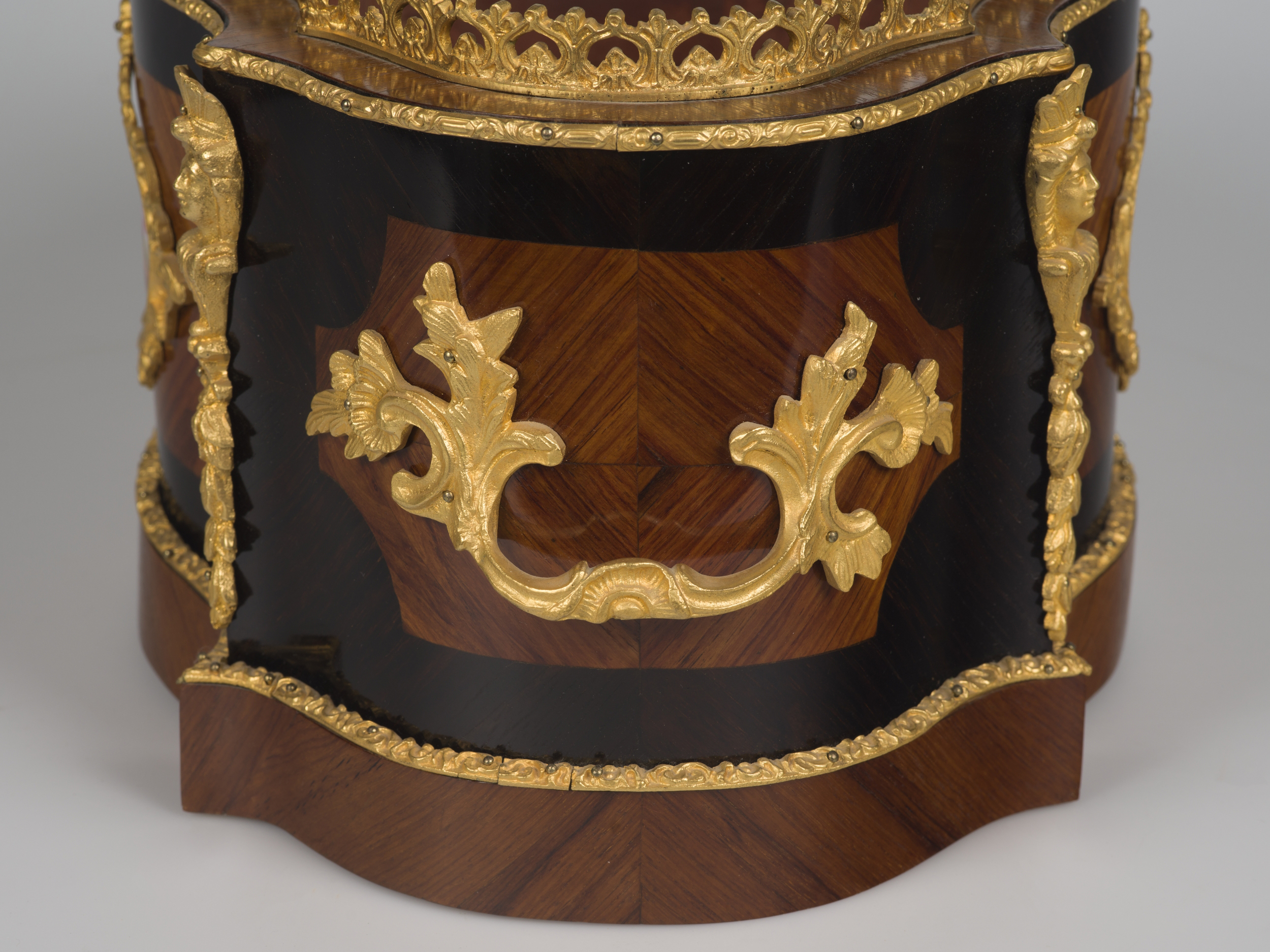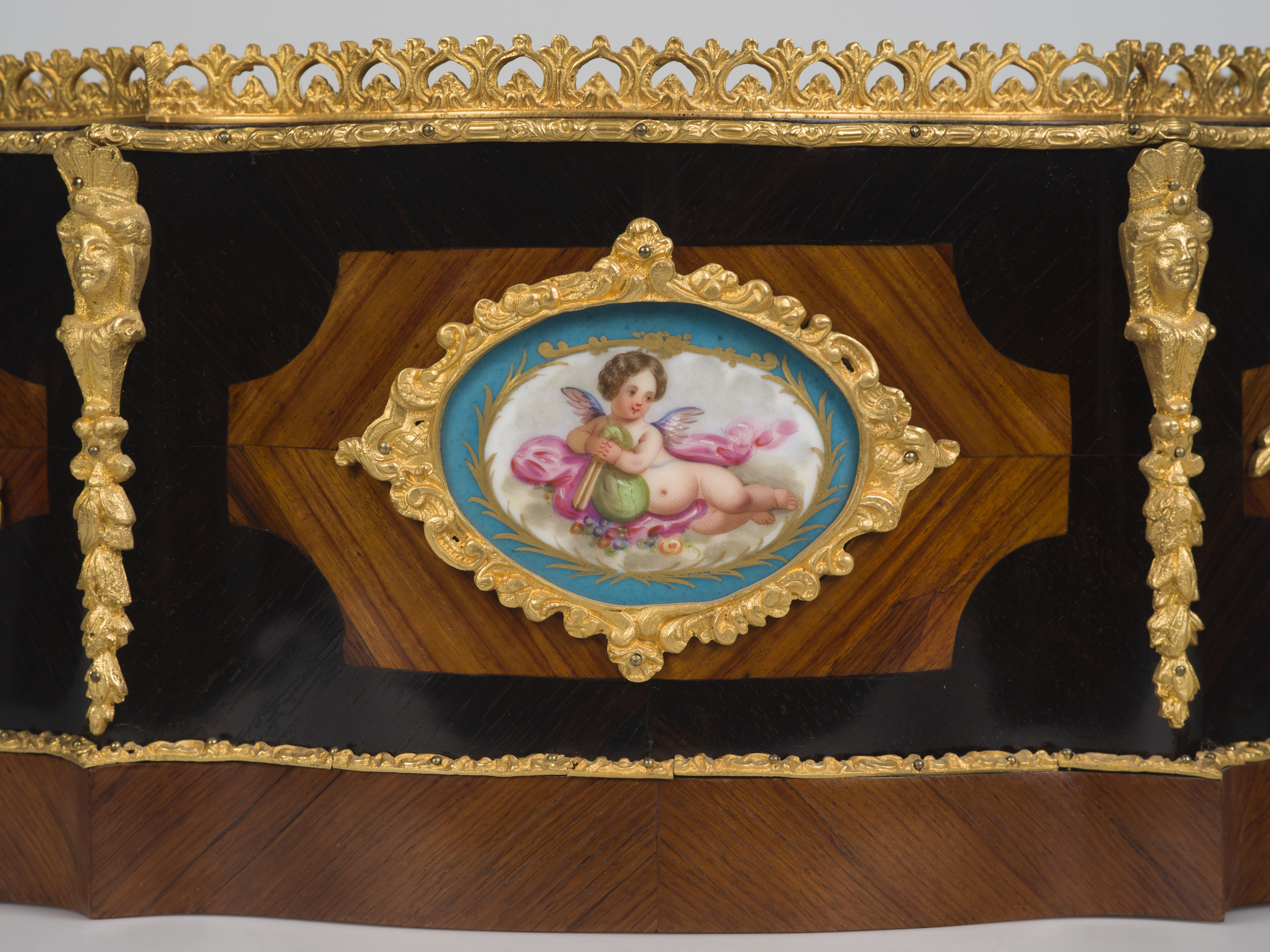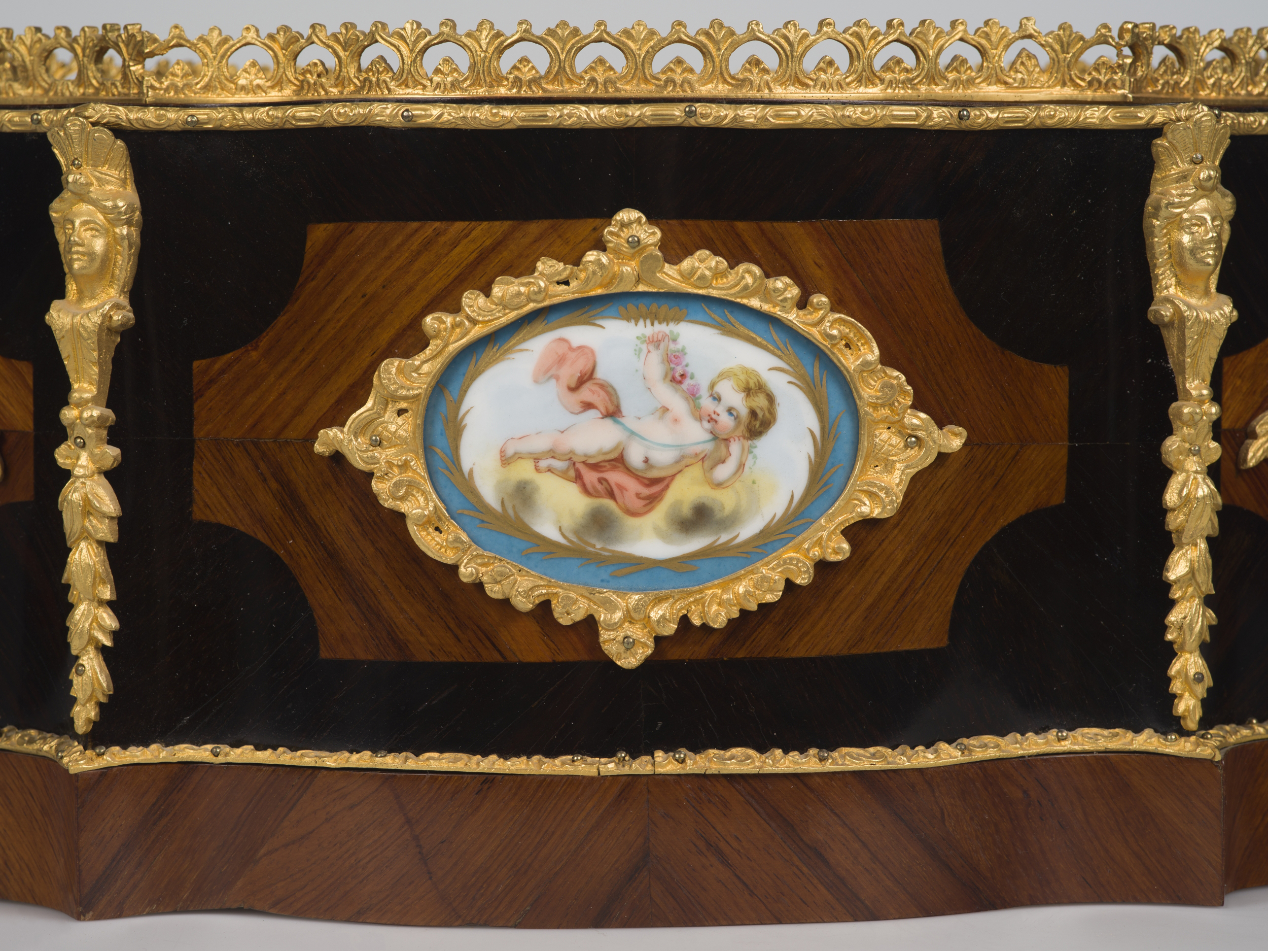 Prezentowana żardiniera to dekoracyjny pojemnik na kompozycje kwiatowe tworzone z roślin doniczkowych, któremu nadano formę meblową. Ma kształt otwartej skrzyneczki o owalnej, płaskiej podstawie z lekkimi ryzalitami oddzielającymi płaszczyzny boków. Wnętrze wyposażone jest w wyjmowaną, blaszaną wanienkę, powtarzającą kształt żardiniery zabezpieczającą ją przed wilgocią podlewanych kwiatów. Powierzchna korpusu pokryta jest dekoracyjnym układem forniru z akcentowanymi kolorystycznie rezerwami zdobiącymi boki oraz niski cokół. Istotną rolę odgrywają rzeźbione elementy z brązu złoconego. Dekoracyjne listwy akcentują poziome linie kompozycyjne:oddzielają cokół od ścianek, ujmują górną krawędź żardiniery. Górny otwór otacza ażurowa, misterna galeryjka. Pionowe linie krawędzi ryzalitów zdobią okucia z plastycznymi główkami kobiecymi i podwieszonymi festonami kwiatów. Boczne dekoracyjne rezerwy forniru są miejscem zamontowania dekoracyjnych uchwytów w formie ukwieconych gałązek. Najbardziej atrakcyjną dekoracją żardiniery są owalne plakietki z sevrskiej porcelany z malowanymi leżącymi amorkami w błękitnym obramowaniu zamontowane na dłuższych bokach. Płytki ujęte są w złocone, ażurowe ramki z brązu.
