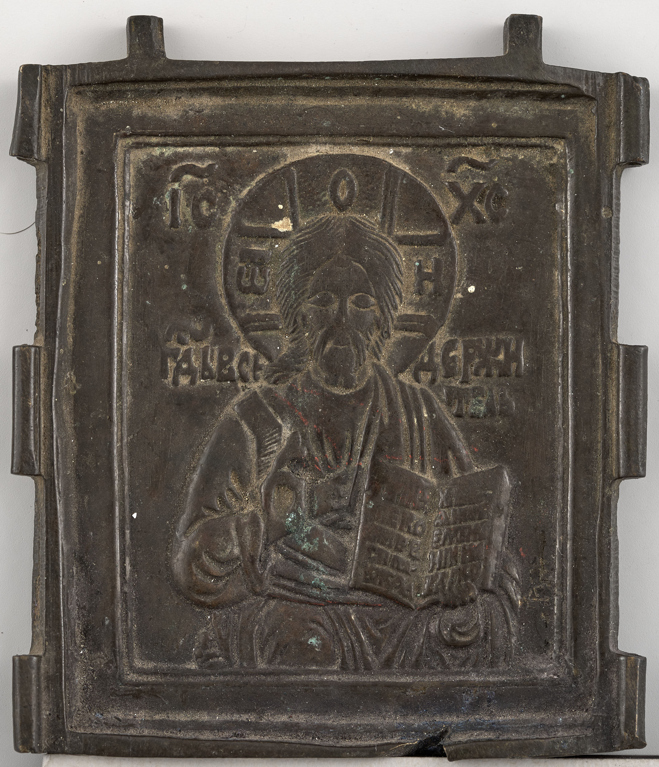 Prezentowany wizerunek Chrystusa w typie Pantokratora Wszechwładcy (patrz S.12819MŁ) stanowi środkowe skrzydło składanej na zawiasach ikony z przedstawieniem Deesis oznaczającego po grecku błaganie, prośbę (patrz S.12787MŁ; S.12802MŁ). Pojęcie to od wczesnych wieków chrześcijaństwa ukształtowało się w oparciu o teksty liturgiczne, wśród nich eucharystyczna modlitwa dziękczynna i modlitwy błagalne, w których Kościół ucieka się do orędownictwa Bogurodzicy, Jana Chrzciciela, aniołów, apostołów, męczenników, świętych. Obrazowa forma Deesis, znana od VI-VII w., rozwinęła się w kilku wariantach, gdy po okresie obrazoburstwa zaprzestano zwalczać kult ikon w Bizancjum, skąd przedstawienie rozpowszechniło się na obszarze wschodniego chrześcijaństwa. W podstawowym wariancie ikonograficznym, oprócz centralnie umieszczonej postaci Chrystusa, występują: po prawicy Bogurodzica, po lewicy Jan Chrzciciel – najwięksi orędownicy ludzkości (patrz S.12824MŁ). Układ postaci zawsze jest hierarchiczny. Na terenach Carstwa Rosyjskiego, utożsamiającego się ze spuścizną Rusi, od połowy XVII w. wzmagał się ruch przeciwników reform liturgicznych zapoczątkowanych przez patriarchę Nikona. Prześladowani zwolennicy dawnej tradycji, nazywani staroobrzędowcami lub starowiercami, rozwinęli własne ośrodki wytwarzające przedmioty kultu, między innymi odlewane w metalu ikony składane czyli składnie. Wśród różnorodnej tematyki obrazowej składni znajdowały się przedstawienia Deesis. Prezentowana ikona jest przykładem wizerunku, w którym półpostacie Chrystusa z adorującymi Bogurodzicą i Janem Chrzcicielem umieszczono pojedynczo na każdym ze skrzydeł tryptyku (boczne nie zachowane). Ikony takie, używane często w podróży, mocowano rzemieniami do górnych bolców i noszono bezpośrednio na ciele.