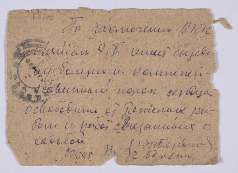 Zaświadczenie o niezdolności do ciężkiej pracy fizycznej Emilii Leibel z powodu choroby Basedowa (Gravesa-Basedowa), tj. zaburzeń czynności tarczycy. Tekst odręczny na karcie z przyciętego papieru pakowego – typowym nośniku nawet oficjalnych i ważnych zaświadczeń w okresie wojny w ZSRR.
