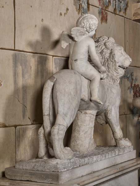 Grupa rzeźbiarska złożona jest z różnych elementów marmurowych: antycznego lwa wykonanego w Rzymie w 2 ćw. II w. oraz dodanych w XVIII w. przez restauratora obiektu: amorka, podpórki lwa i płyty pod antyczną bazę. Rzeźba przedstawia kroczącego lwa z siedzącym na niej amorkiem. W figurze lwa zwraca uwagę plastyczne opracowanie pyska zwierzęcia z otwartą paszczą oraz modelunek jego ciała doskonale oddający napięcie i grę mięśni. Gęsta grzywa zwierzęcia jest głęboko żłobiona długimi pociągnięciami świdra. Posąg lwa jest znakomitym przykładem antycznej, monumentalnej, rzymskiej sztuki dekoracyjnej. Amorek przedstawiony został jako mały, nagi chłopiec ze skrzydłami, z typowym dla boga miłości atrybutem – kołczanem ze strzałami zawieszonym na pasku przełożonym przez ramię (w rzeźbie obecnie brak jest kołczanu). Rzeźba zakupiona została przez księżnę Izabelę Lubomirską (1736 – 1816), właścicielkę zamku łańcuckiego, podczas jej podróży do Włoch w latach 1785-1786. Pierwotnie umieszczona była wraz z innymi antycznymi rzeźbami antycznymi zakupionymi przez Lubomirską we Włoszech, w Apartamencie Tureckim, gdzie odnotowana została jako „Lew stoiący, a na nim Kupidyn siedzący wyobrażający miłość upokorzoną”. W inwentarzach zamku łańcuckiego z lat 1854-55, 1862 odnotowana jest w Galerii Rzeźb mieszczącej się na pierwszym, reprezentacyjnym piętrze zamku, gdzie eksponowana jest do dziś. Galeria Rzeźb to jedno z najcenniejszych wnętrz łańcuckiego zamku. Urządzona została po 1792 r. z inicjatywy księżnej Izabeli Lubomirskiej. Wystrój Galerii zaprojektował francuski architekt Jean François Thomas de Thomon. Jej ściany i sufit pokrywa iluzjonistyczne malowidło ukazujące wnętrze antycznej ruiny przekrytej treliażem oplecionym winną latoroślą. W Galerii eksponowane są głównie antyczne i nowożytne rzeźby marmurowe z kolekcji Izabeli Lubomirskiej.