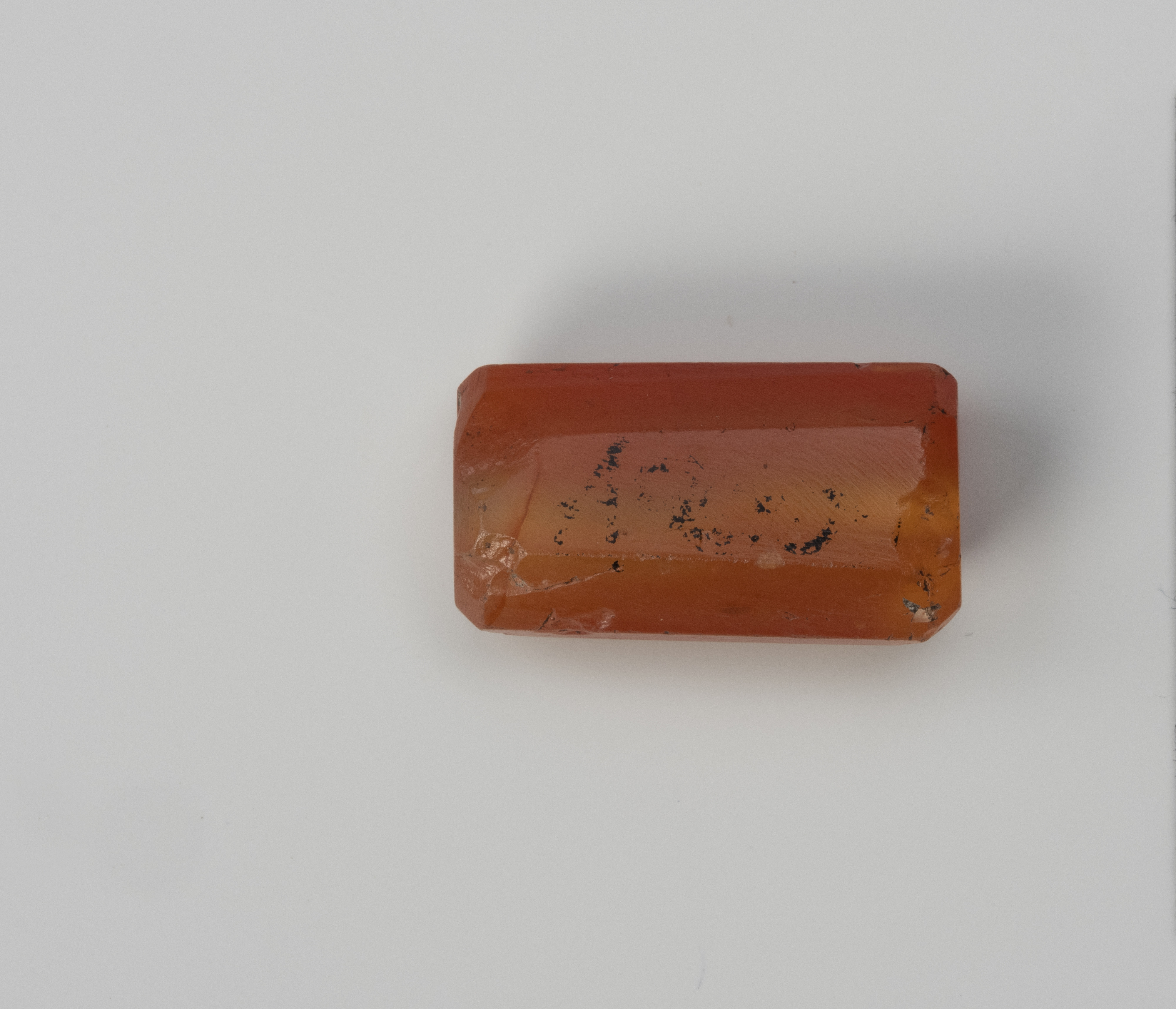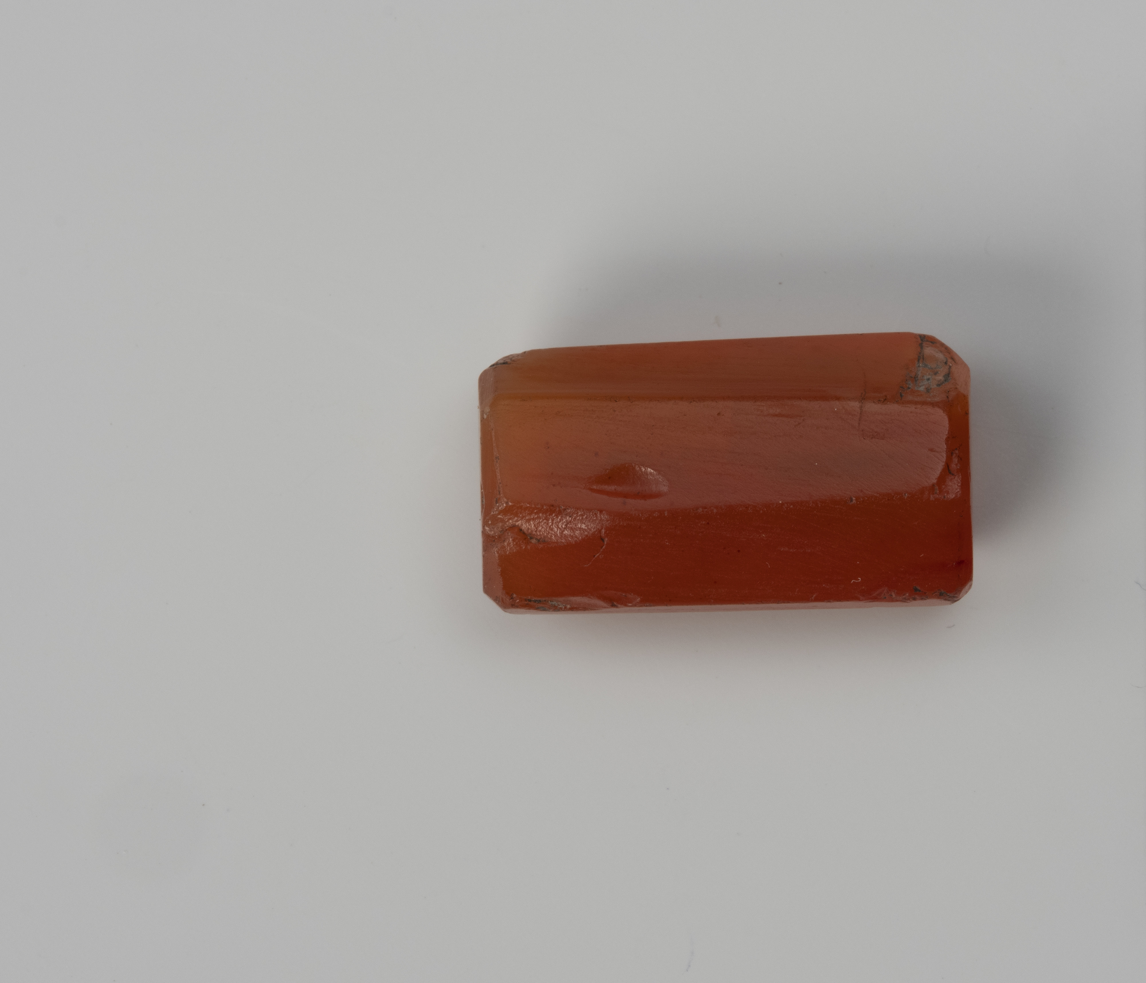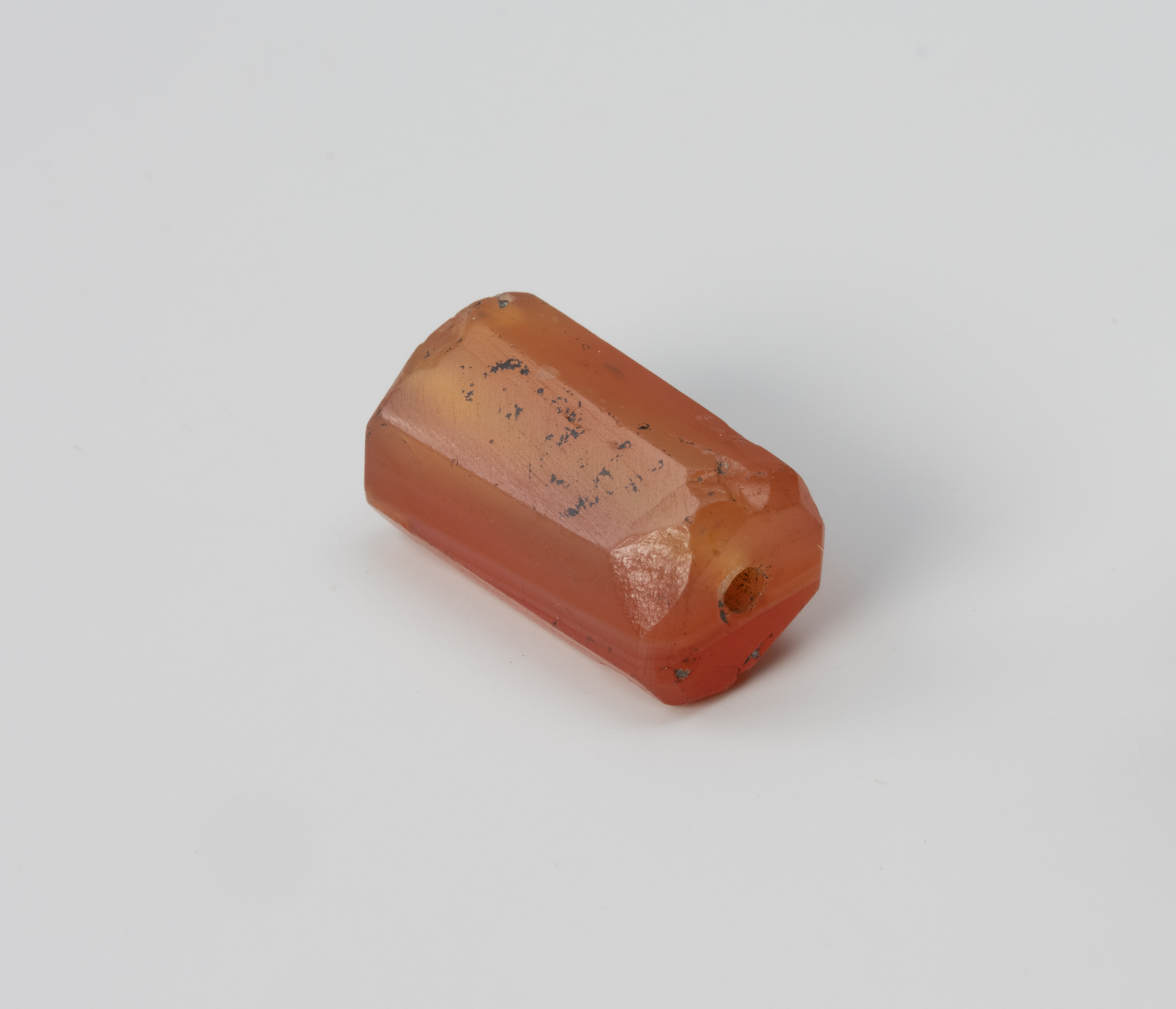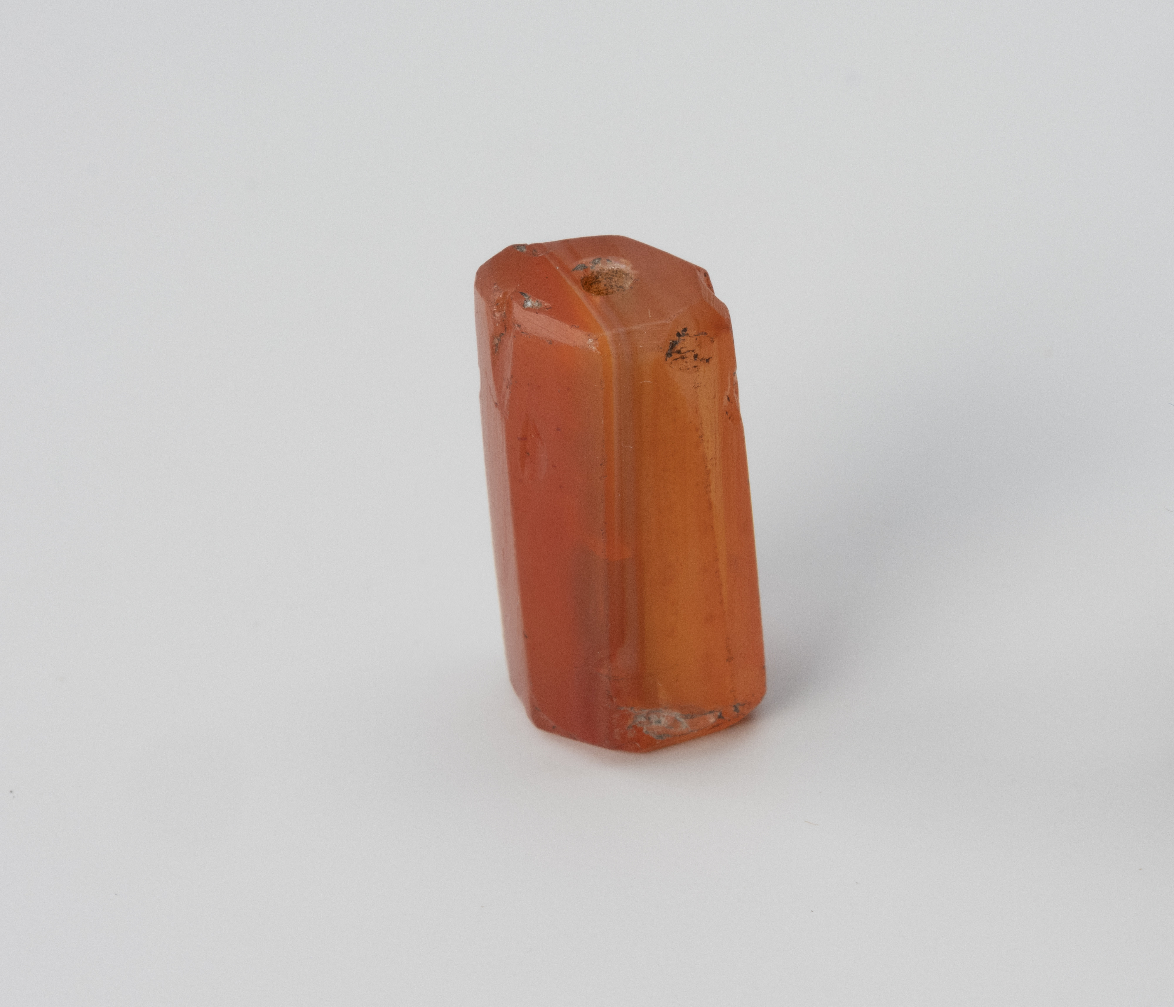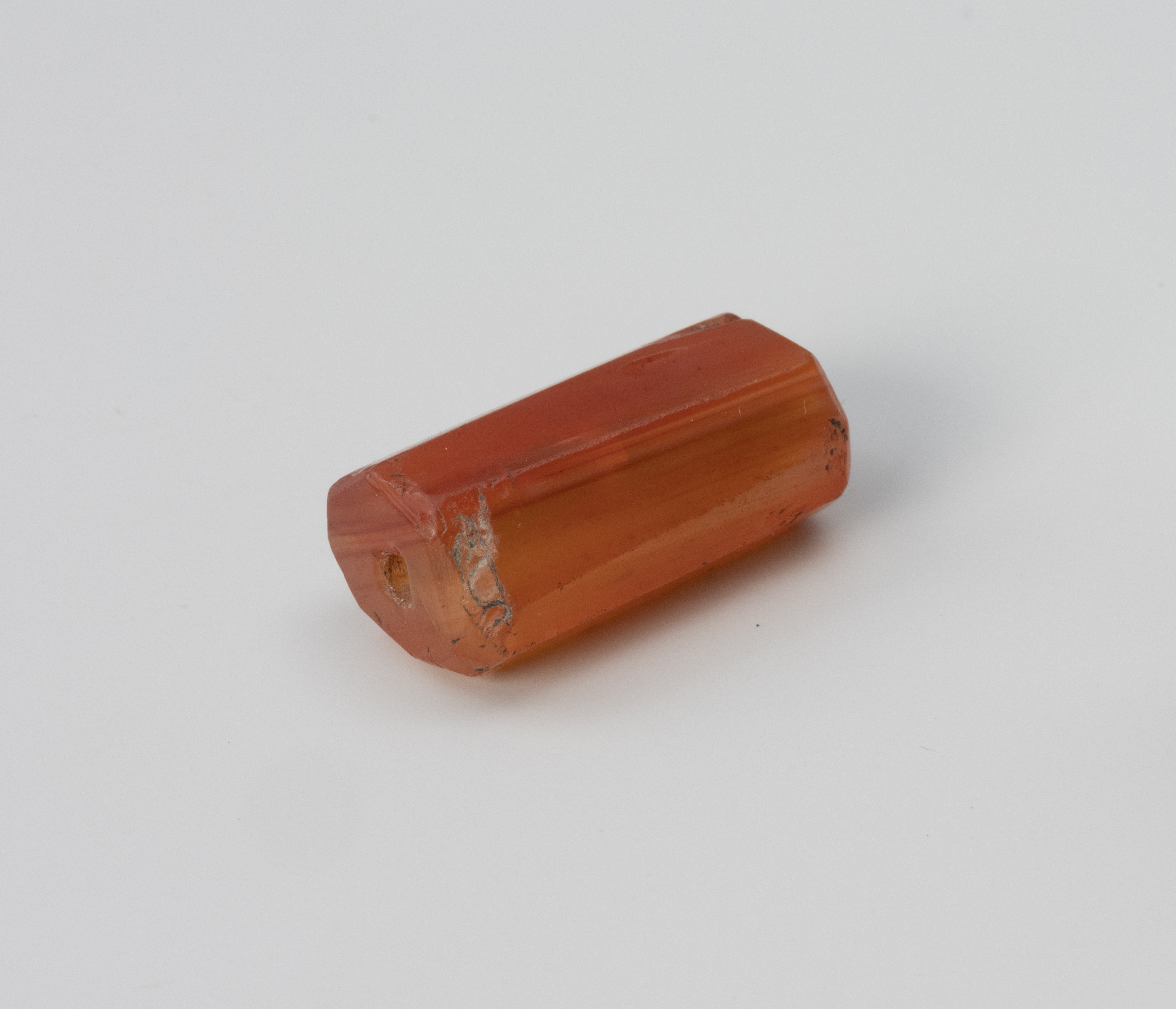 Karneol jest skałą kwarcową o pomarańczowoczerwonej barwie spowodowanej domieszkami minerałów żelaza. Z wyglądu może przypominać bursztyn, jednak charakteryzuje się mniej przejrzystą strukturą. We wczesnym średniowieczu karneol wykorzystywano głównie do wyrobu biżuterii, często łącząc w finalnych produktach wyroby z różnych materiałów. Paciorki z tego surowca formowano najczęściej na dwa sposoby: szlifem gładkim tworzono paciorki kuliste, natomiast szlifem fasetkowym egzemplarze prostopadłościenne, takie jak omawiany zabytek z Polic.
