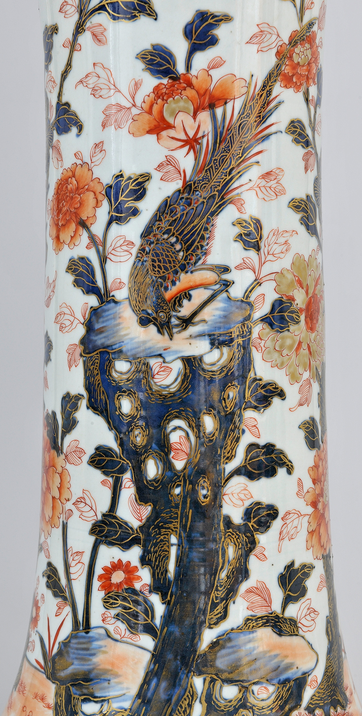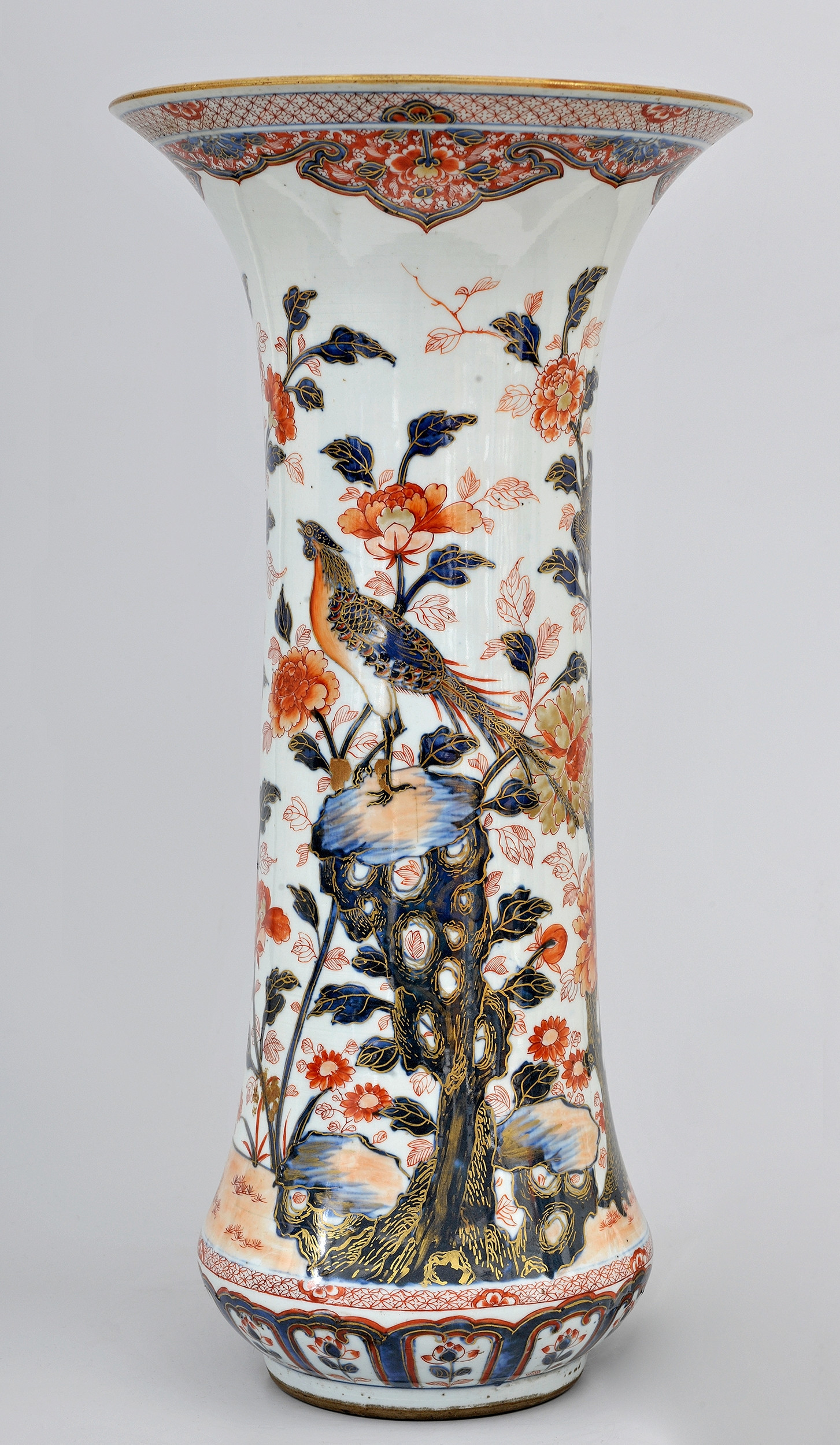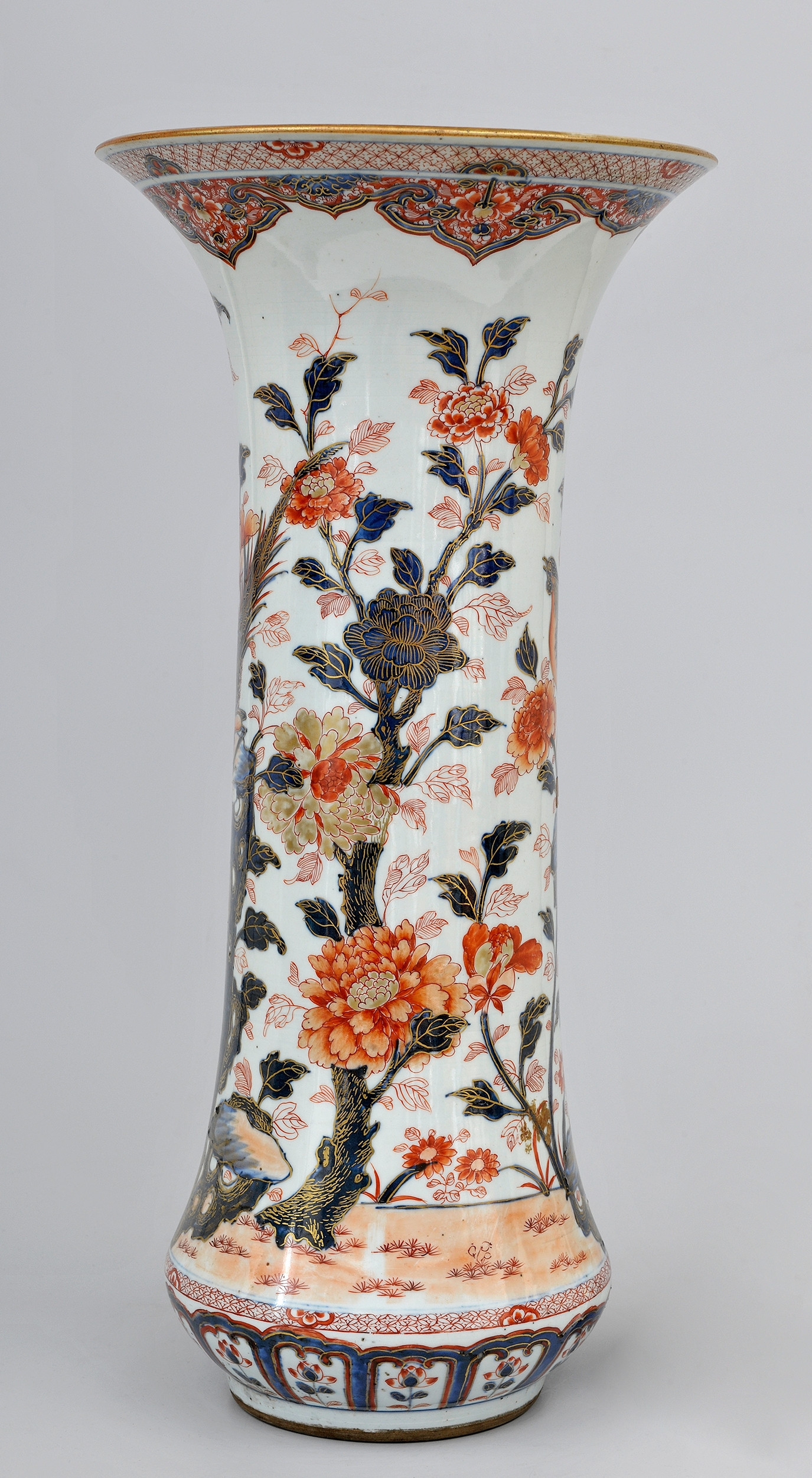 Wysoki, porcelanowy wazon w kształcie trąbki, dekorowany w stylu „chińskie imari”. Tego typu naczynia charakteryzuje szeroki, cylindryczny wylew, stosunkowo wąski i długi brzusiec, przy podstawie delikatnie rozszerzający się, ze zwężającą się stopą. Inną nazwą określającą kształt naczynia jest flet. Powierzchnia wazonu została ozdobiona gęstą ornamentyką floralną wzbogaconą przedstawieniami ptaków na wysokich skałach.