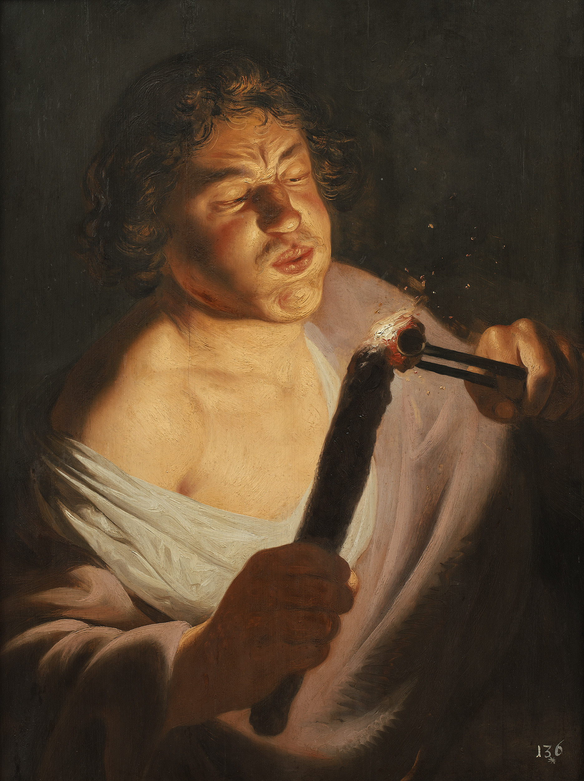 Istnieją przypuszczenia, że przedstawienie „Mężczyzna zapalający żagiew” Lievens namalował ok. 1625 r., w czasie gdy przebywał w Leydzie i mieszkał w jednej pracowni z Rembrandtem. Badacze podkreślają, że to właśnie Lievens przyczynił się do zainteresowania Rembrandta utrechckim caravaggionizmem. Ten obraz Lievensa jest przykładem podziwu dla możliwości uzyskania wyjątkowych efektów malarskich poprzez grę światła i cienia. Jedynym źródłem światła na obrazie jest ogień trzymany w ręku mężczyzny, na który dmucha on, próbując zapalić żagiew; pozostała część kompozycji jest nieoświetlona. Dodatkowym efektem, który ożywia optycznie prawą stronę kompozycji, są ulatujące iskry.