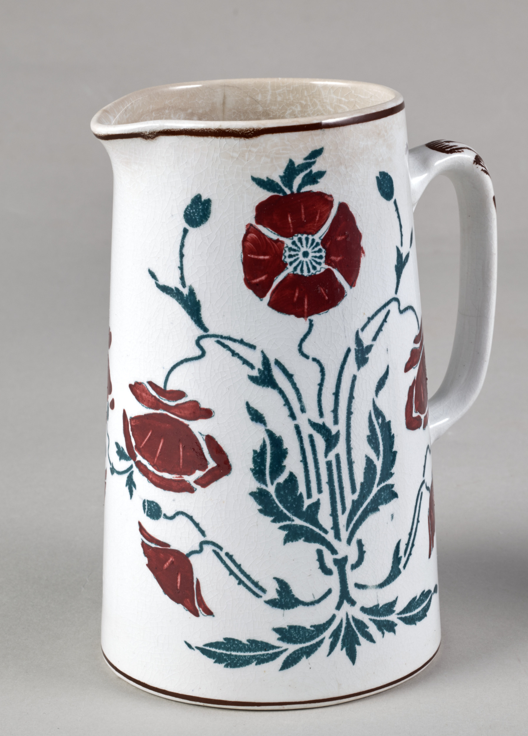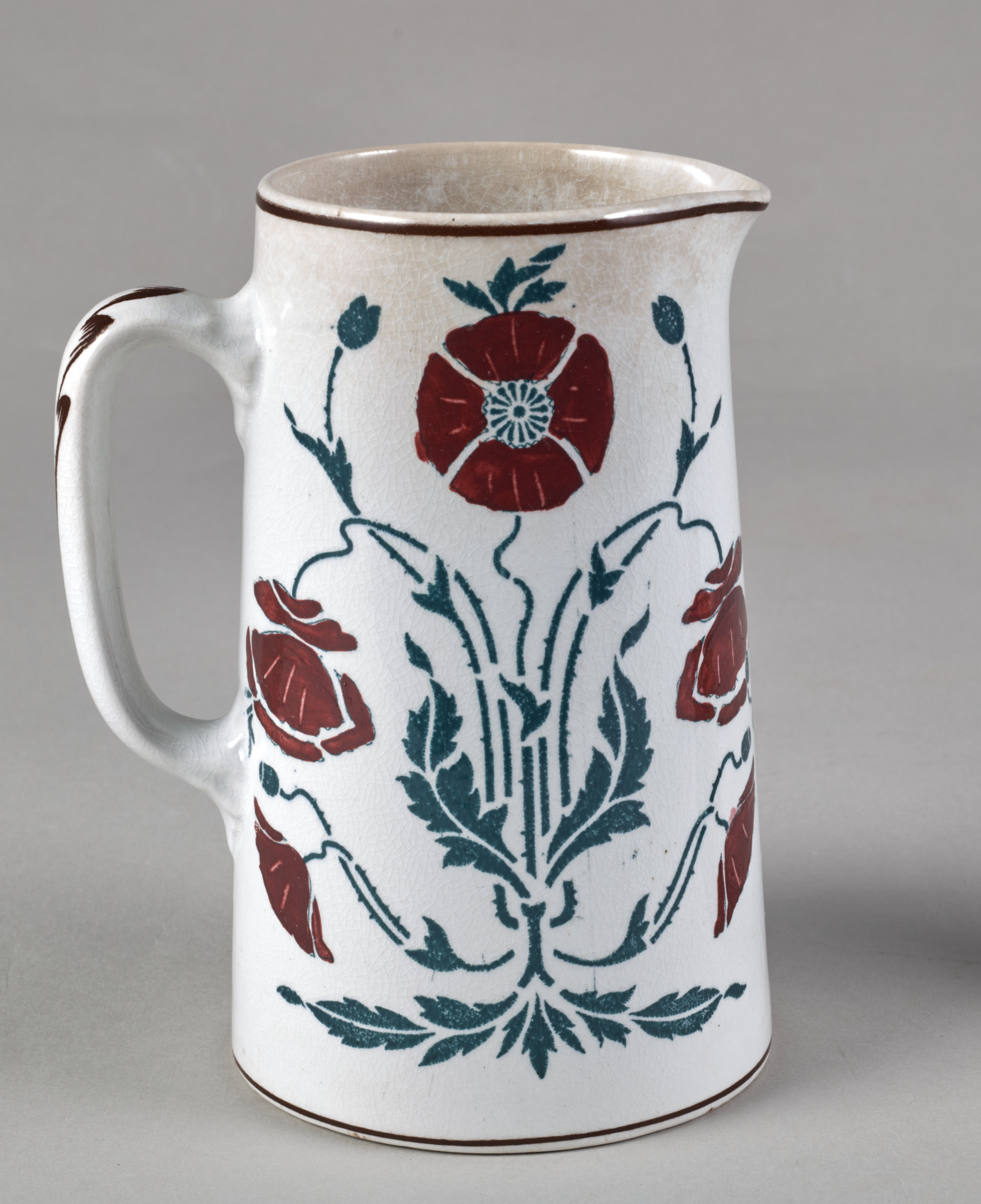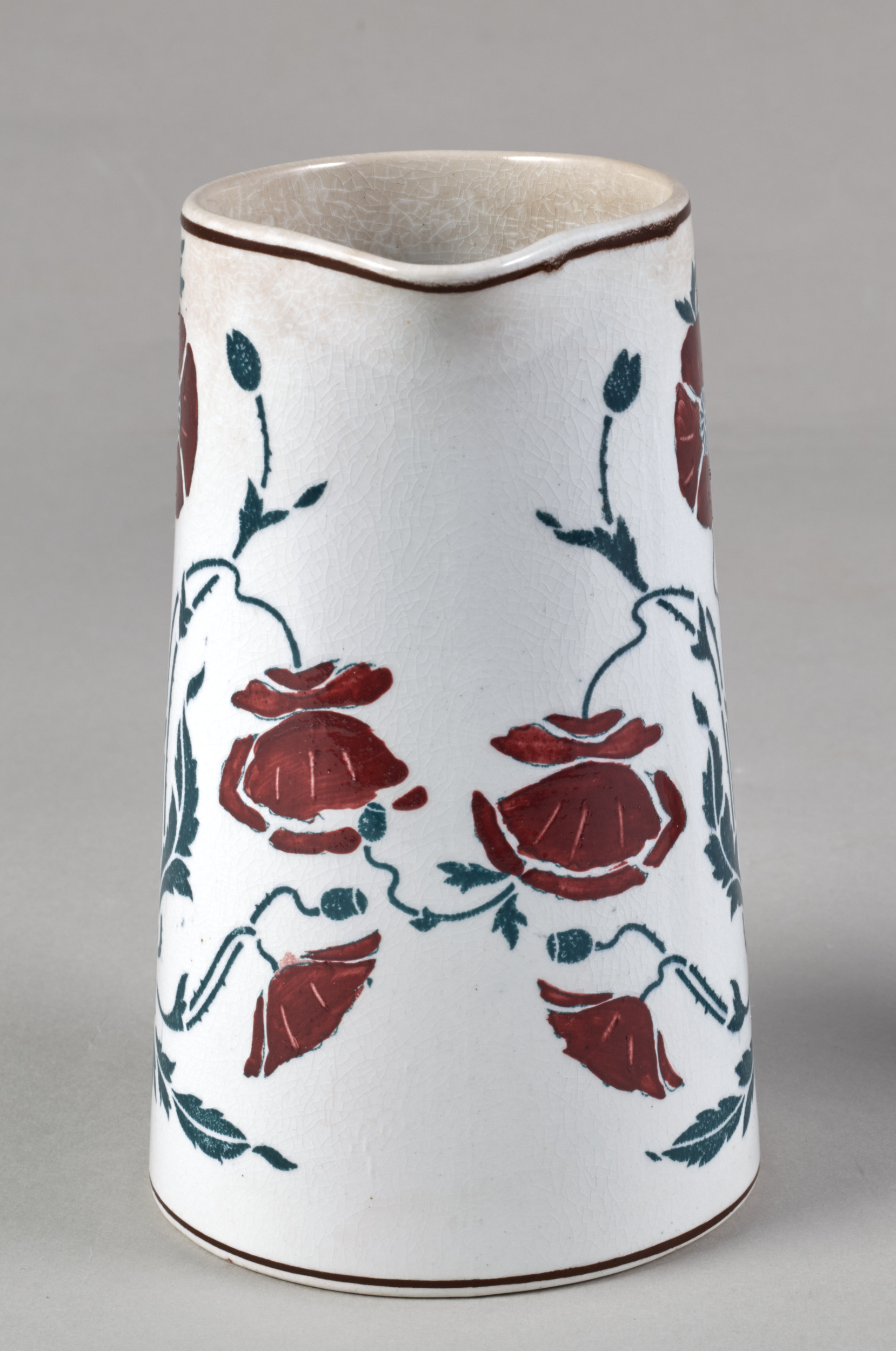 Dzbanek - biały z dekoracją secesyjną malarską o motywie stylizowanych maków. Dzbanek na okrągłej stopie, zwężający się ku górze z wygiętym na zewnątrz fragmentem górnego brzegu ułatwiającym wylewanie płynu. Na osi dziobka owalny uchwyt. Górny i dolny brzeg dzbanka obwiedzione cienkimi, brązowymi paskami. Powierzchnię zewnętrzną zdobią dwa stylizowane bukiety maków. Łodygi i kontury kwiatów ciemno-zielone, naniesione przez szablon, płatki kwiatów wypełnione odręcznie czerwono-brązową farbą. Bukiety skomponowane symetrycznie, po obu stronach osi utworzonej przez kwiat środkowy, ukazany w widoku z góry i jego łodygę umieszczone są po dwa kwiaty i 2 pąki o długich wygiętych łodygach z liśćmi, od dołu bukiet zakończony 3 liśćmi (2 długie rozkładają się na boki, 1 mały na osi). Wierzch uchwytu ozdobny rysunkiem 5-palczastego, wydłużonego liścia, wykonanym brązową farbą. Na stopce dzbanka sygnatury producenta, kotwica w owalu, pod nią napis: S. B. i S / ENGLAND”. Niżej to sygnatura magazynu zamawiającego: „SOUTH AUDLEY ST./T GOODE CO/LONDON.