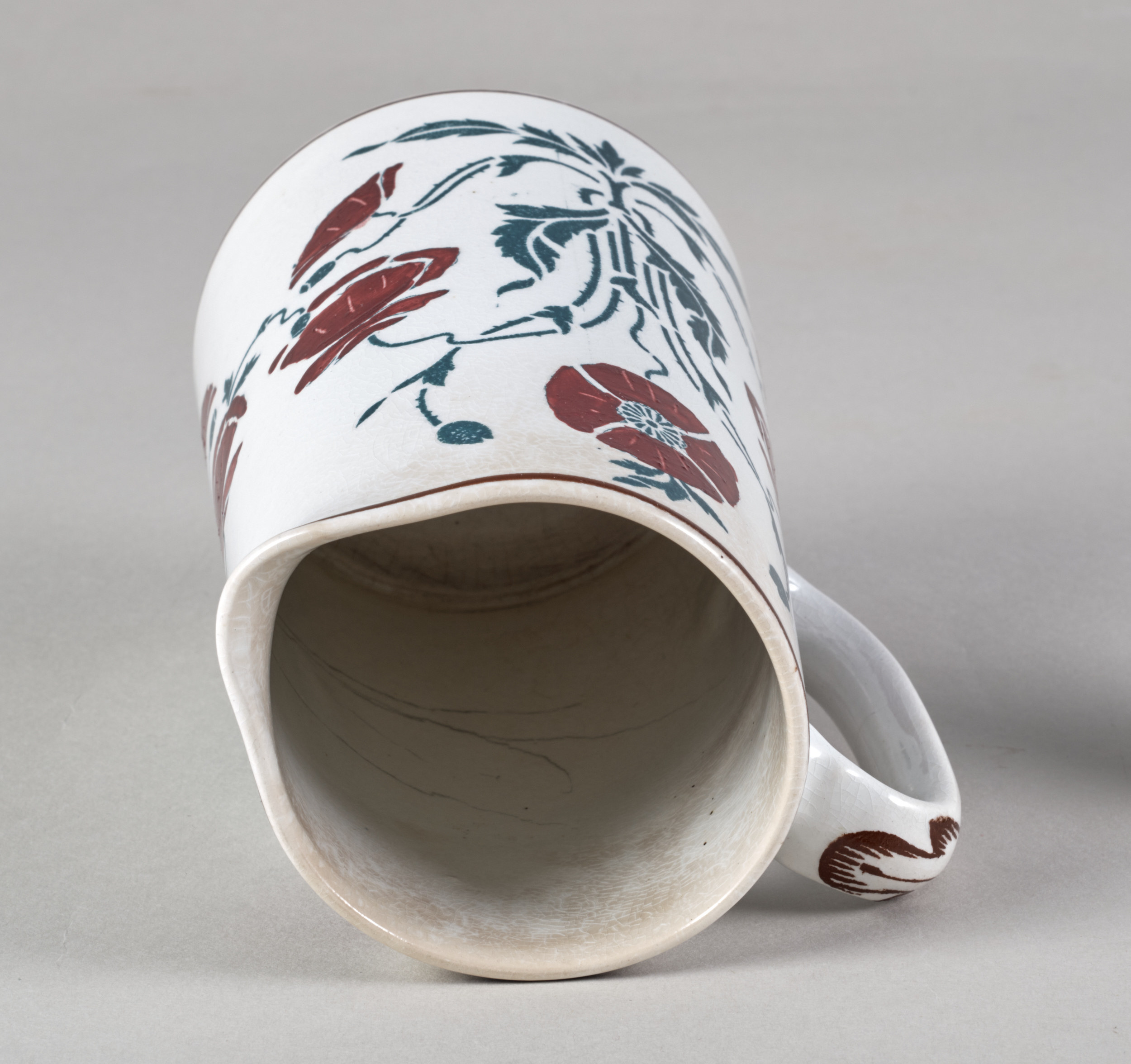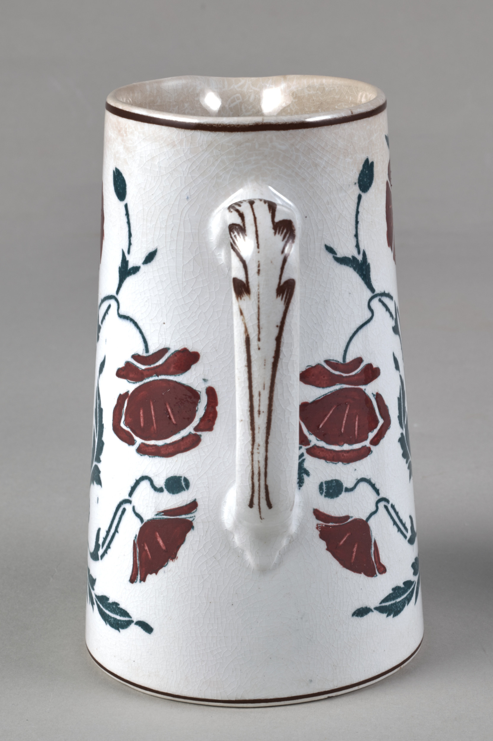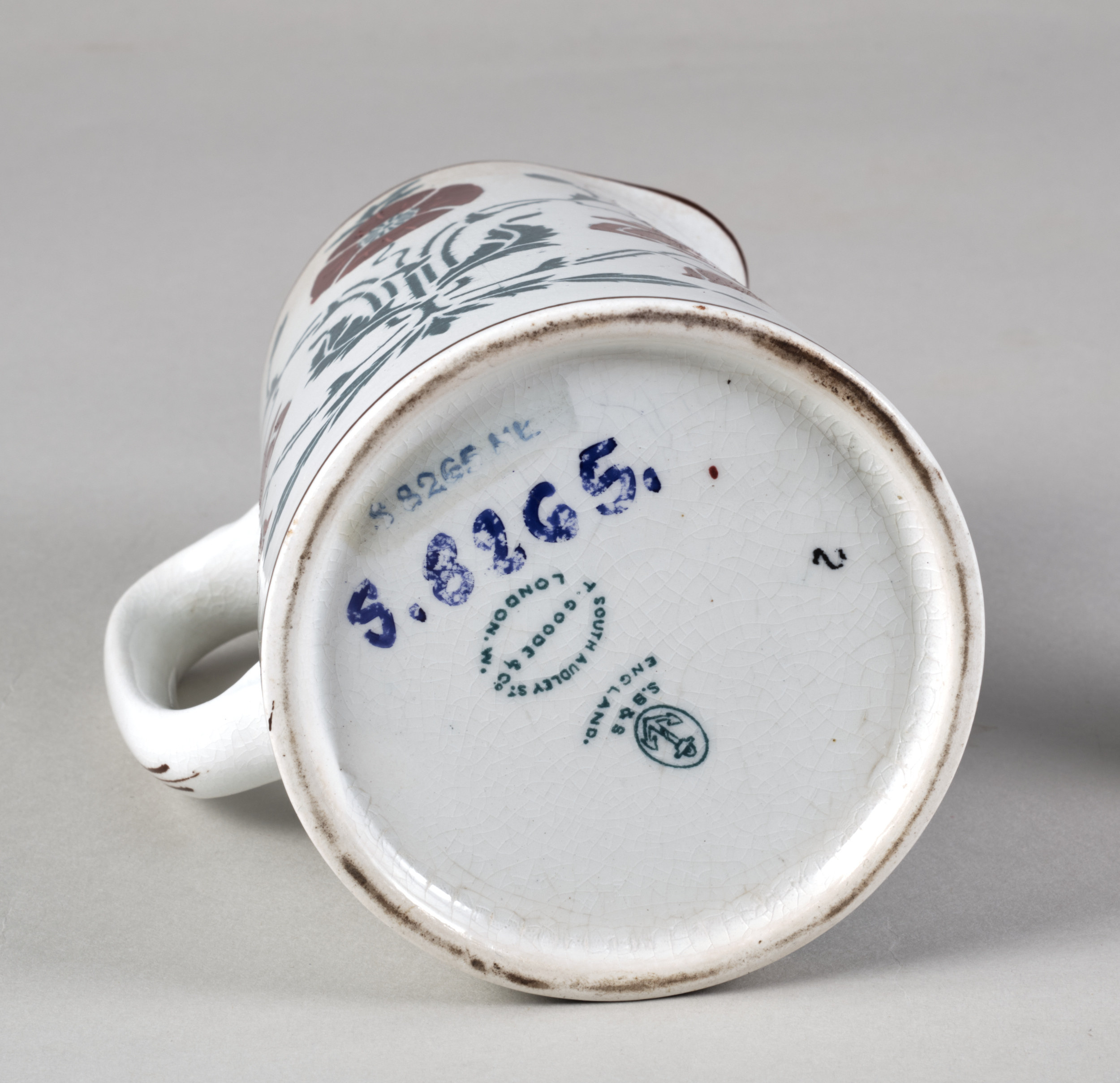Dzbanek - biały z dekoracją secesyjną malarską o motywie stylizowanych maków. Dzbanek na okrągłej stopie, zwężający się ku górze z wygiętym na zewnątrz fragmentem górnego brzegu ułatwiającym wylewanie płynu. Na osi dziobka owalny uchwyt. Górny i dolny brzeg dzbanka obwiedzione cienkimi, brązowymi paskami. Powierzchnię zewnętrzną zdobią dwa stylizowane bukiety maków. Łodygi i kontury kwiatów ciemno-zielone, naniesione przez szablon, płatki kwiatów wypełnione odręcznie czerwono-brązową farbą. Bukiety skomponowane symetrycznie, po obu stronach osi utworzonej przez kwiat środkowy, ukazany w widoku z góry i jego łodygę umieszczone są po dwa kwiaty i 2 pąki o długich wygiętych łodygach z liśćmi, od dołu bukiet zakończony 3 liśćmi (2 długie rozkładają się na boki, 1 mały na osi). Wierzch uchwytu ozdobny rysunkiem 5-palczastego, wydłużonego liścia, wykonanym brązową farbą. Na stopce dzbanka sygnatury producenta, kotwica w owalu, pod nią napis: S. B. i S / ENGLAND”. Niżej to sygnatura magazynu zamawiającego: „SOUTH AUDLEY ST./T GOODE CO/LONDON.