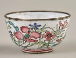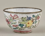 Czareczka miedziana w kształcie półkuli na niskim, wyodrębnionym dnie. Pokryta została białą, nieprzejrzystą emalią w typie falangcai, dekoracja w gamie barwnej w typie familie rose – kwiaty i owoce, tykwa, ciemniejszy brzeg. Wewnątrz, na dnie, malowany liść. Naczynie datowane na II połowę XIX wieku, pochodzi z Chin. W I wieku naszej ery za czasu panowania dynastii Kangxi powstały warsztaty Yangxin Hall. Znajdowały się w pałacu cesarskim, w których wytwarzano różne formy rzemiosła artystycznego. Jeden z warsztatów nazywał się falang Zuo, początkowo emalie zdobiące naczynia były importowane z Europy, ale w 1728 naszej ery udało się Chińczykom je wyprodukować, a nawet wprowadzić dodatkowe kolory. W 55 roku warsztat Kangxi zaczął eksperymentować z produkcją falangcai na porcelanie. W okresie Kangxi wyroby mają kolorową powierzchnię imitującą formę cloisonne, najchętniej używanym kolorem był czerwony i żółty. W okresie Yongzheng wprowadzono więcej odmian dekoracji. Dekoracja jest rysowana na glazurowanej powierzchni zamiast na nieszkliwionej w okresie Kangxi. Są wśród nich motywy florystyczne, ptasie i pejzażowe. Za panowania Qianlong były nawet te ozdobione ludzkimi postaciami w stylu europejskim. Wśród kolorów falang zdecydowanie najbardziej charakterystycznym i ważnym kolorem w palecie fencai jest róż.