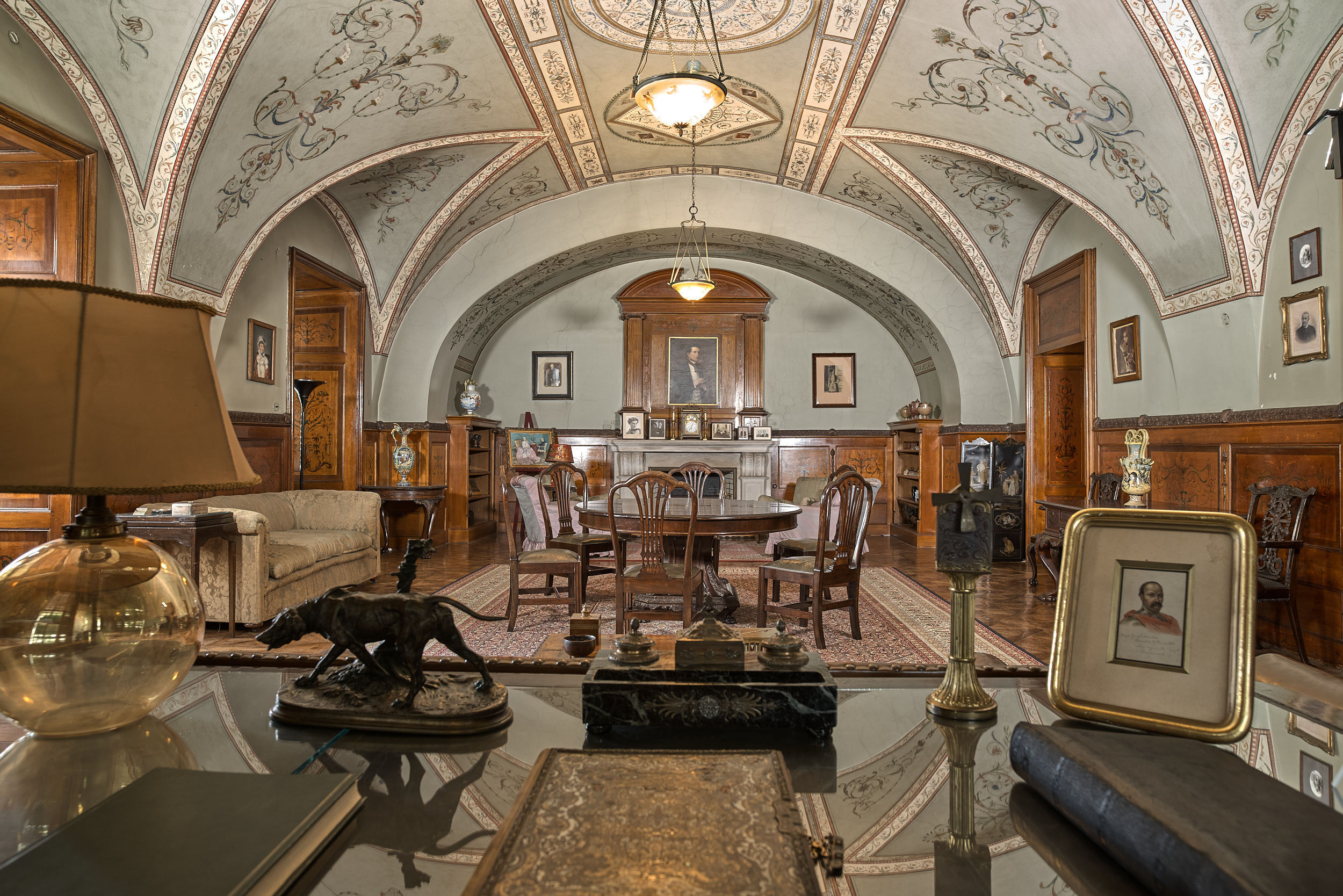 Parterowa, położona w północno-zachodnim narożu sala należy do pierwotnych siedemnastowiecznych sklepionych wnętrz zamku łańcuckiego wzniesionego przez ks. Stanisława Lubomirskiego (1583-1649), pierwszego z tego rodu wściela Łańcuta. Wnętrze to dostępne z korytarza północnego ma plan prostokąta ze sklepieniem kolebkowym z lunetami, dwa okna od zachodu oraz z jedno porte-fenêtre (z wyjściem na taras) od północy, oraz ukryte drzwi w ściętym narożniku północno-zachodnim a także, dodaną w pocz. XIX w. cokołową boazerią. W ścianie wschodniej ustawiono, podczas prac prowadzonych w latach 1927-1929, kominek. Wówczas to powstał ostateczny wystrój wnętrza zaprojektowany przez Tadeusza Dachowskiego wzorowany na wcześniejszej polichromii ścian autorstwa Vinzenzo Brenny. Dolne partie ścian oraz ościeża i supraporty okienne i drzwiowe wyłożone jesionowo- dębową boazerią zwieńczoną płaskorzeźbioną w ornamenty liściaste listwą otrzymały barwną malarską dekorację płycin z motywami arabeski i groteski w układzie kandelabrowym, podobnie dekorowane są płyciny drzwi i porte-fenêtre, a sklepienie – kolebka, lunety i gurty na seledynowym tle barwną polichromię w typie pompejańskim. Kominek ustawiony w miejscu dawnych drzwi, wykonany z białego marmuru ujęty jest parą lizen zwieńczonych wolutami ma nad gzymsem dębową obudowę z parą kanelowanych jońskich pilastrów, dźwigających przerwany odcinkowy naczółek z polem środkowym pierwotnie z powstałym dla tego wnętrza konnym portretem Alfreda Antoniego ze sforą, pędzla Wrighta Barkera z 1927 r.