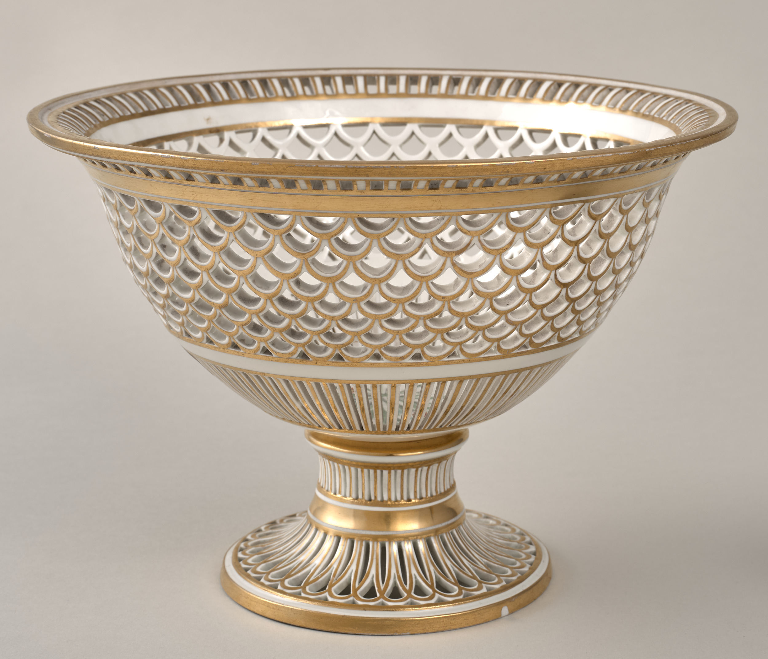 Koszyk z serwisu obiadowego we wzór polnych traw. Koszyk wchodzi w skład serwisu obiadowego wykonanego w manufakturze porcelany w Wiedniu. Powstała ona w 1718 r., jako druga w Europie, po Miśni, manufaktura porcelany, działała do 1864r. Serwisy obiadowe, śniadaniowe, do herbaty, kawy i czekolady stanowiły zasadniczą część produkcji wiedeńskiej wytwórni, zwłaszcza od 4 ćwierci XVIII w. Serwis obiadowy, którego część została zakupiona przez muzeum powstał w okresie kiedy manufakturą wiedeńską kierował Matthias Niedermayer (1805 – 1827). Zakupiona część serwisu składa się z kilkudziesięciu sztuk: talerzy płytkich, waz na zupę, salaterek, koszyków na owoce, półmisków, solniczek, dzbanka i dzbanuszka. Serwis ten został zakupiony przez muzeum w Łańcucie w 1964 r. od Franciszka Żaby. Teresa Grzybkowska błędnie uważa, iż serwis ten zamówiła właścicielka łańcuckiego zamku Elżbieta Lubomirska (1736 -1816) dla Henryka Lubomirskiego, który był jej wychowankiem (T. Grzybkowska, „Kobieta wodzem chwalebnego czynu”, Warszawa-Toruń 2018, s. 228, il. 144). Jest to serwis w stylu klasycystycznym. Wykonany został z mlecznobiałej porcelany. Zdobiony jest we wzór polnych traw malowanych dwoma odcieniami zieleni: trawiastą i grynszpanową oraz ciemnoszarym kolorem w postaci delikatnych linii uplastyczniających rysunek traw. Zielone pasma traw gdzieniegdzie urozmaicają małe kwiatuszki, malowane rdzawą czerwienią i chabrowym błękitem oraz jasną żółcią znaczącą ich środki. Koszyk serwisowy na owoce jest okrągły, ażurowy, na okrągłej stopie i ruchomej podstawie na czterech nóżkach. Wewnątrz, na dnie zdobiony malowaną kompozycją z polnych, zielonych traw oraz kwiatków czerwonych i niebieskich. Brzegi naczynia podkreślone złoconymi paskami.