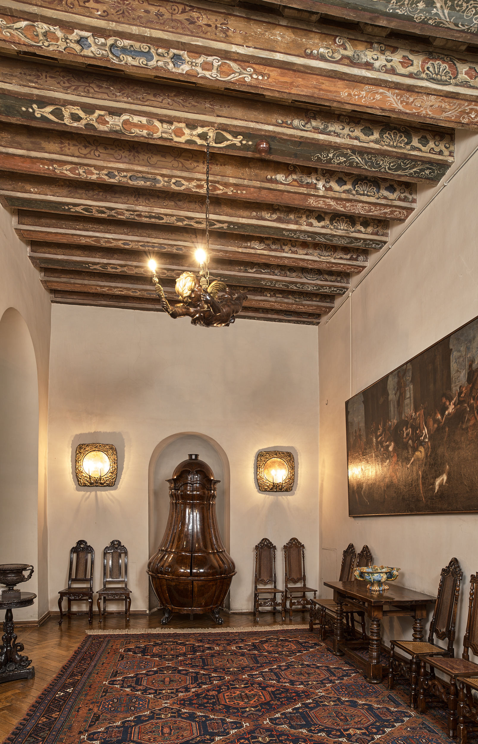 Z przełomu XVII/XVIII w. pochodzi podwieszona do stropu drewniana lampa w kształcie rzeźbionego putta trzymającego pochodnie. Wnęka w ścianie południowej przypomina o istniejącym tu w XVIII w. przejściu do „Sall” (Sala Balowa).
