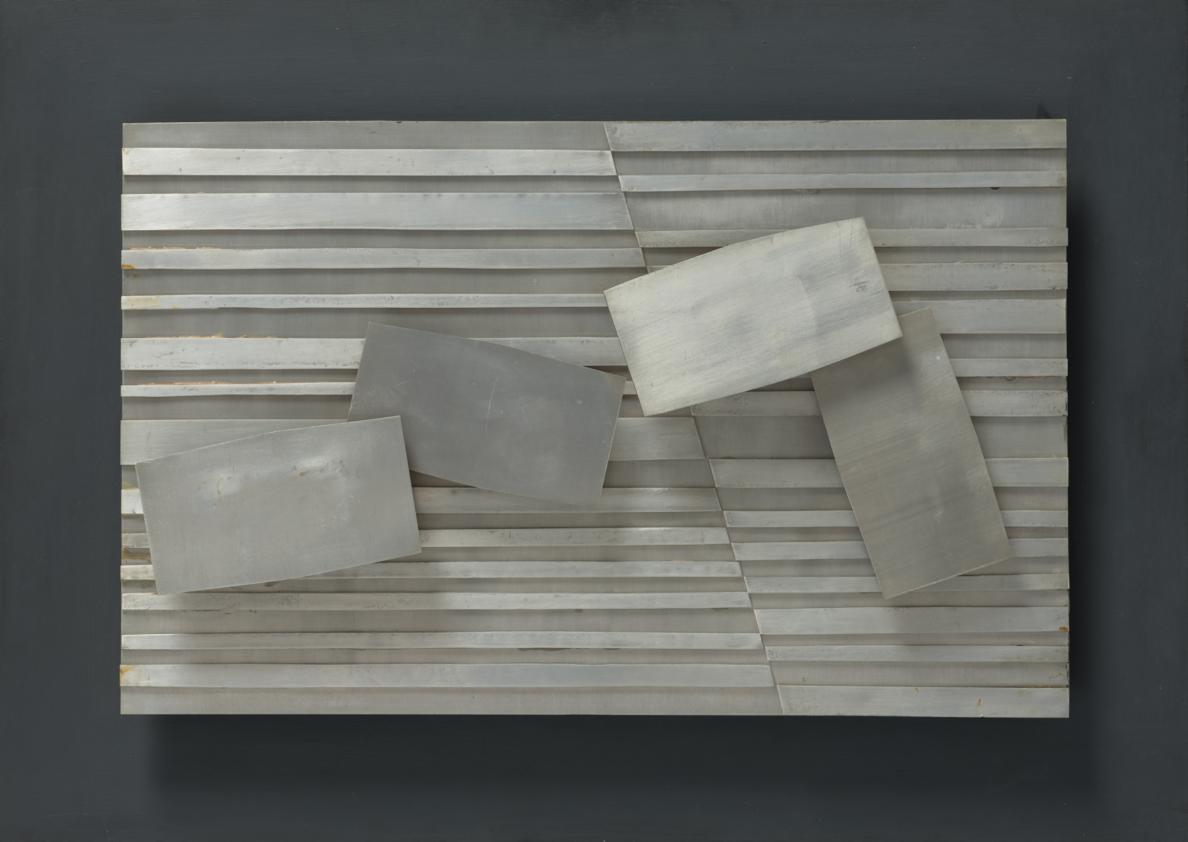 Henryk Stażewski, jako twórca budujący legendę polskiej awangardy międzywojennej, stał się po drugiej wojnie światowej ostoją nowych pokoleń modernistów, którzy szukali lokalnych korzeni nurtu i międzynarodowych kontaktów. Po odbyciu studiów w warszawskiej Szkole Sztuk Pięknych u Stanisława Lentza (1913–1919) organizował najważniejsze ugrupowania ruchu nowoczesnego w kraju: Ekspresjoniści Polscy (1917, od 1919 Formiści), Blok (1924), Praesens (1926), a.r. (1929), a także za granicą: Cercle et Carré (1929) i Abstraction-Création (1931). Jego styl oscylował między doświadczeniami kubizmu w młodości oraz Picassowskiego surrealizmu i klasycyzmu w latach trzydziestych i czterdziestych XX wieku, jednak dzieła najliczniejsze i najbardziej typowe dla jego œuvre reprezentują abstrakcję geometryczną. Powstawały już w okresie „heroicznym” awangardy. Od drugiej połowy lat pięćdziesiątych przez prawie dwie dekady Stażewski zajmował się tworzeniem reliefów. Początkowo stosował technikę mieszaną (korek, drewno, farba olejna) do konstruowania polichromowanych kompozycji złożonych z organicznie zaoblonych, rzadziej prostokątnych figur wyodrębnionych z tła za pomocą malarskich efektów fakturowych i kolażowych. W latach 1964–1965 pojawiły się abstrakcje z jednolitych przemysłowych materiałów, blachy miedzianej i aluminiowej, utrzymane w monochromatycznej kolorystyce oraz wyzyskujące naturalne właściwości surowca i jego obróbki: trawienie, chromowanie, złocenie, srebrzenie, prószenie. Obraz-relief stawał się zbiorem płytek wyciętych z metalowego arkusza, zamontowanych na niewidzialnych klockach w taki sposób, że zdają się lewitować przed tłem. Stażewski wykorzystywał wielooglądowość takich konstelacji – ruch widza „zmieniał” położenie elementów względem siebie. Ogromną rolę odgrywał także naturalny światłocień oraz refleksy zapewniane przez połysk materiału i sztuczne, „teatralne” oświetlenie. Wykorzystano je do aranżacji reliefów podczas wystawy z okazji czterdziestolecia pracy twórczej artysty (1965/1966).