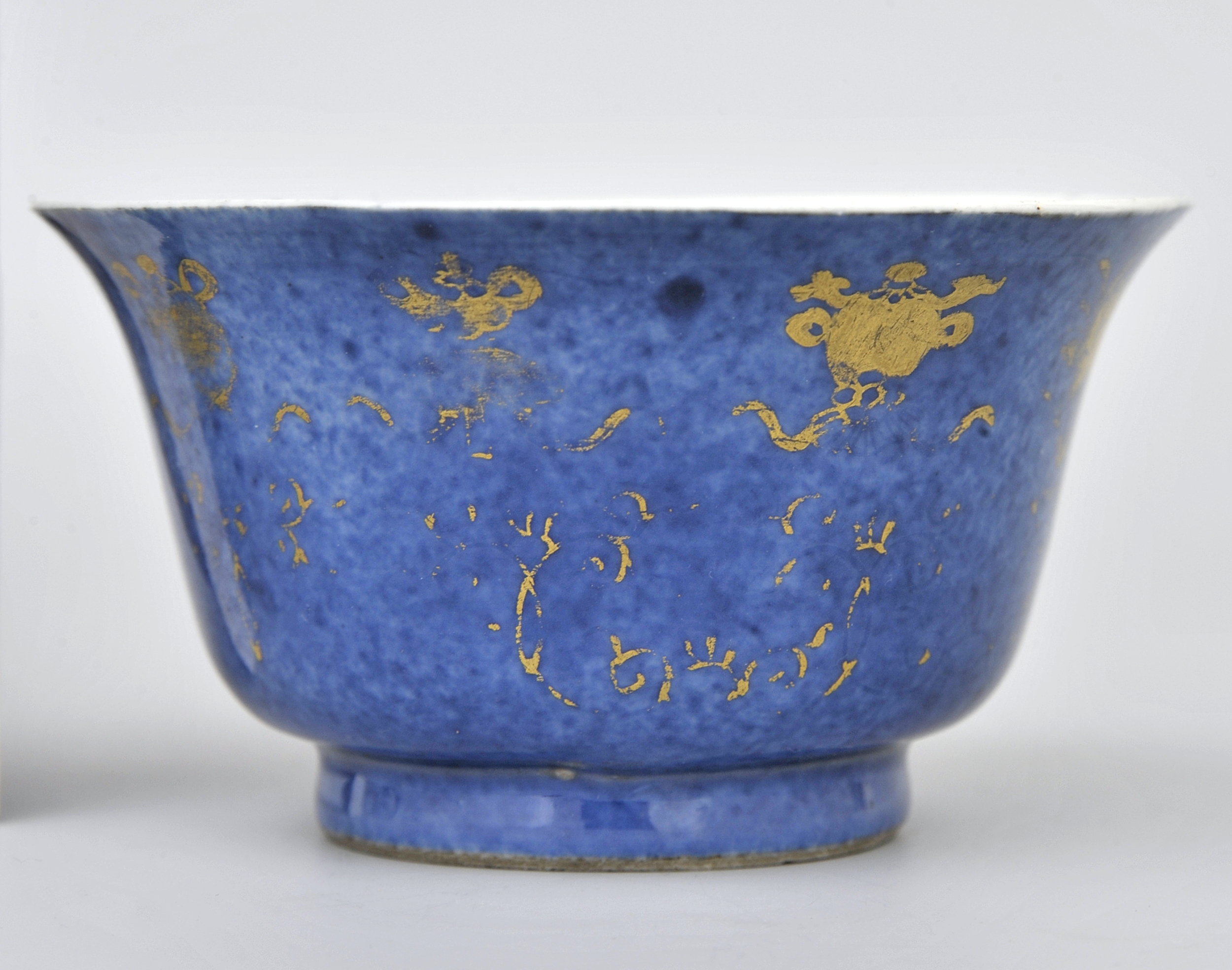 Porcelanowa czarka o dzwonowatym kształcie, na stopce, z lekko rozchylonym wylewem. Niezwykły kolor czarki i głębia jej zdobienia powstała poprzez nadmuchiwanie przez rurkę i gazę rozdrobnionego proszku kobaltowego na powierzchnię naczynia, i następnie pokrycie jej szkliwem. Złotą dekorację wykonano po wypaleniu czarki malując ją odpowiednio przygotowanym złotem. Zachowała się jedynie fragmentarycznie - ze względu na charakter zdobień najbardziej narażona na zniszczenie. Najlepiej widoczne jest osiem symboli buddyjskich umieszczonych w górnej części czarki oraz częściowo zachowane znajdujące się poniżej delikatne powtarzające się motywy.