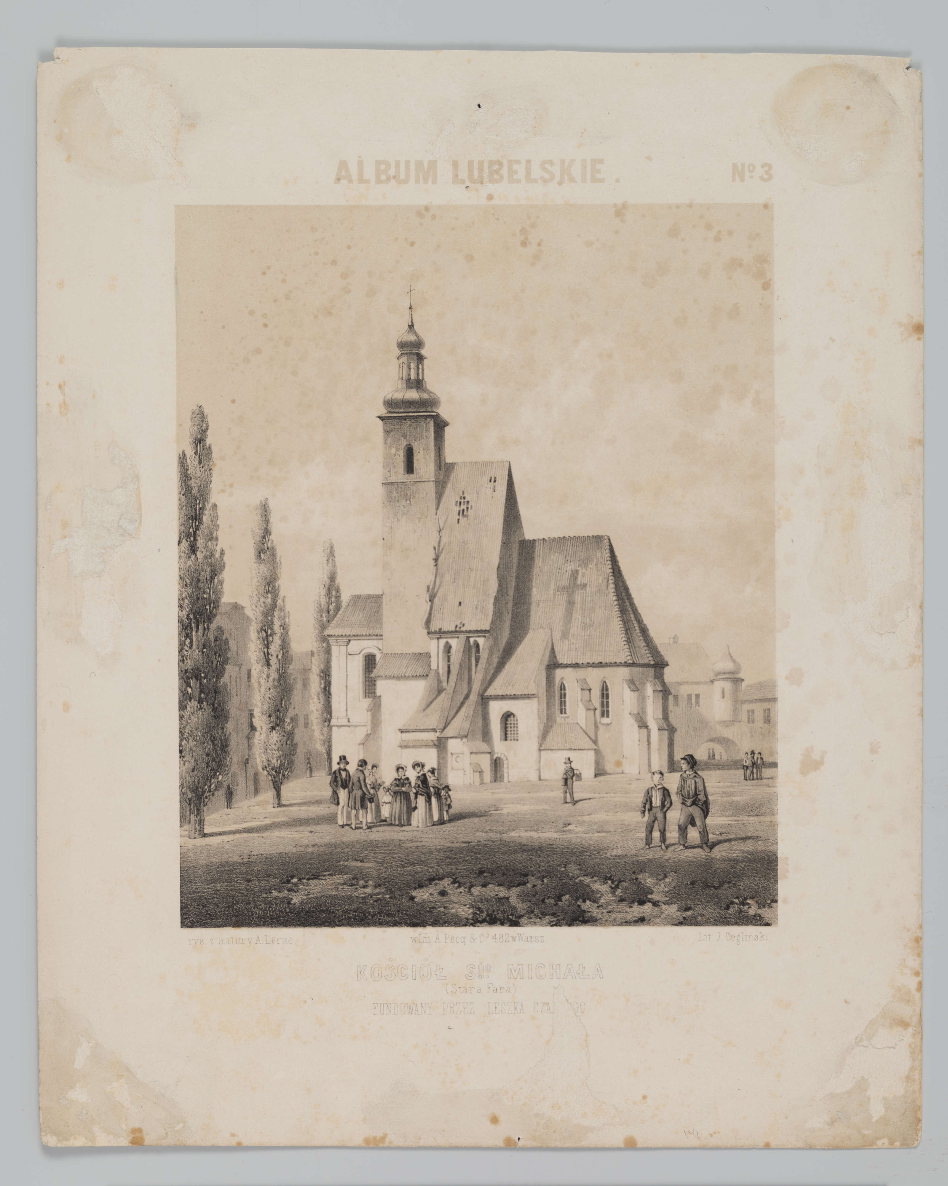 Widok niezachowanego kościoła św. Michała Archanioła jest jednym z ważniejszych przedstawień dawnego Lublina i cennym źródłem do ikonografii miasta. Świątynia wraz z zespołem należących do niej budowli była usytuowana we wschodniej, najstarszej części wzgórza Staromiejskiego, otoczonego umocnieniami obronnymi (fragmenty są widoczne na rycinie). Była fundowana przez Leszka Czarnego w 1282 roku i rozebrana w latach 1846–1855. Przez ponad 500 lat była głównym kościołem miasta, pełniąc funkcję fary, kolegiaty i przejściowo katedry diecezji lubelskiej. Od najdawniejszych czasów rezydował przy niej archidiakon lubelski (administrator dużej części Lubelszczyzny z ramienia arcybiskupa krakowskiego). Odbywały się tu uroczystości ważne dla miasta i kraju, między innymi inauguracje kolejnych kadencji Trybunału Koronnego i zakończenia sesji.