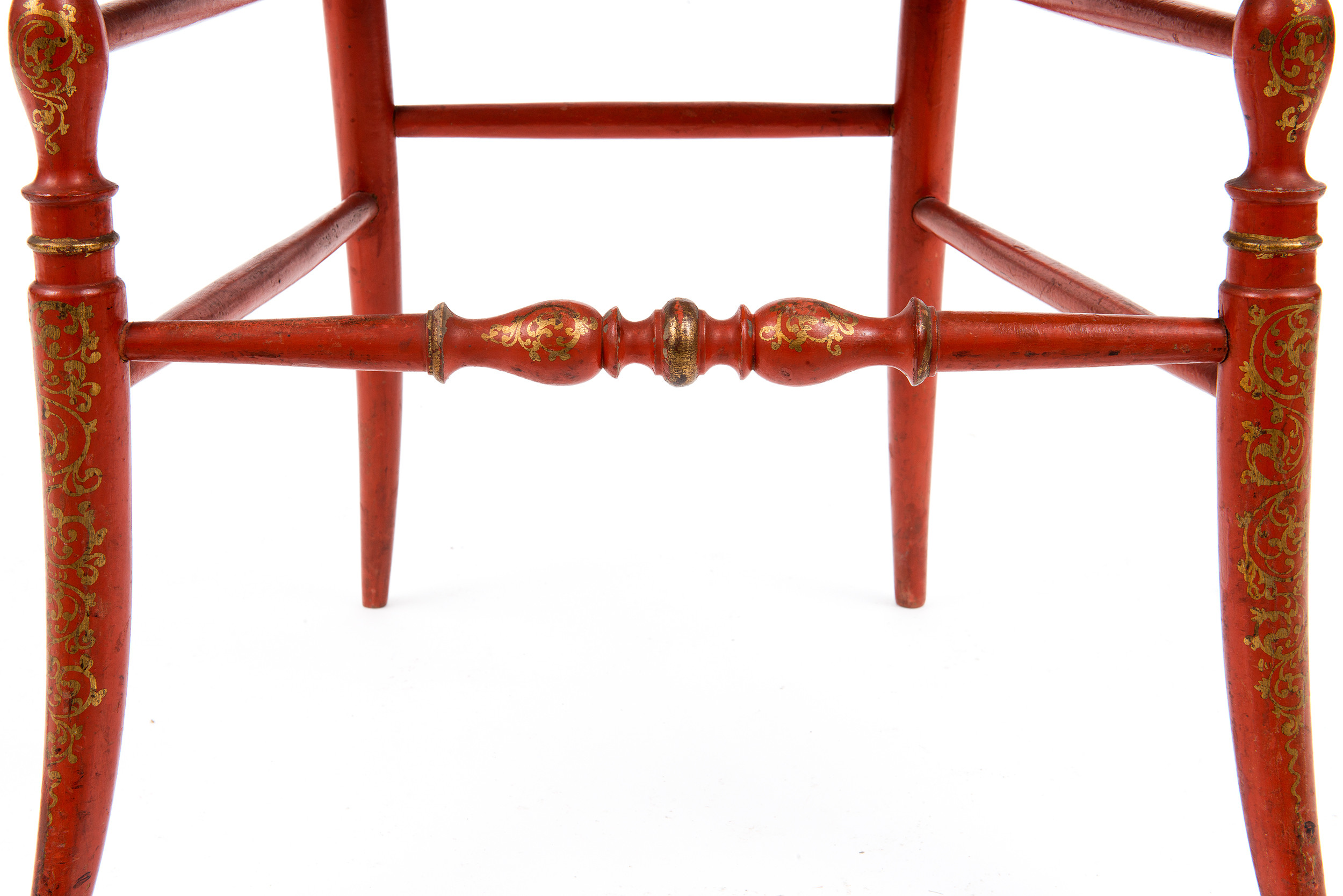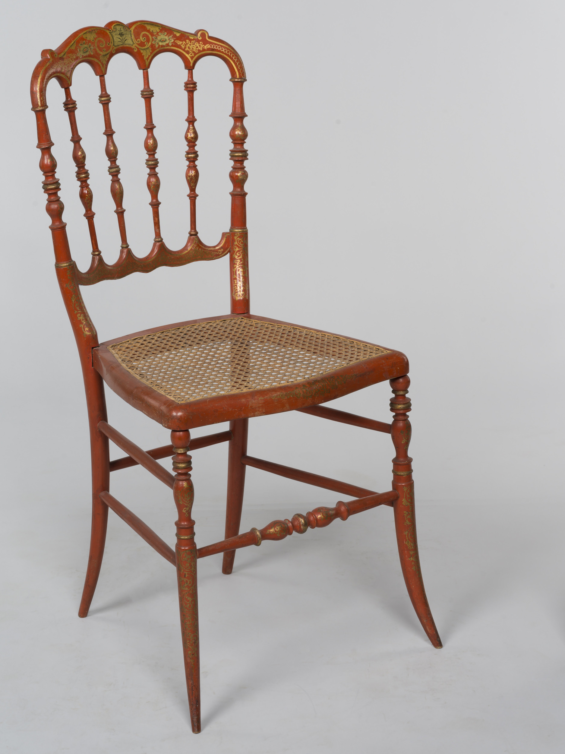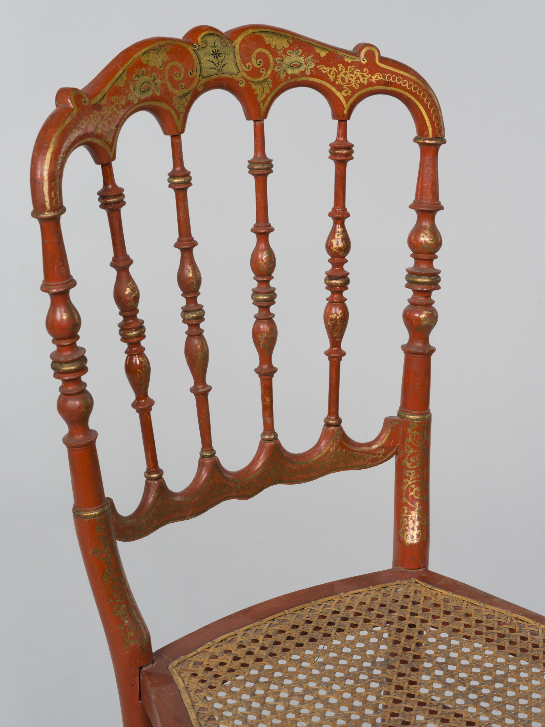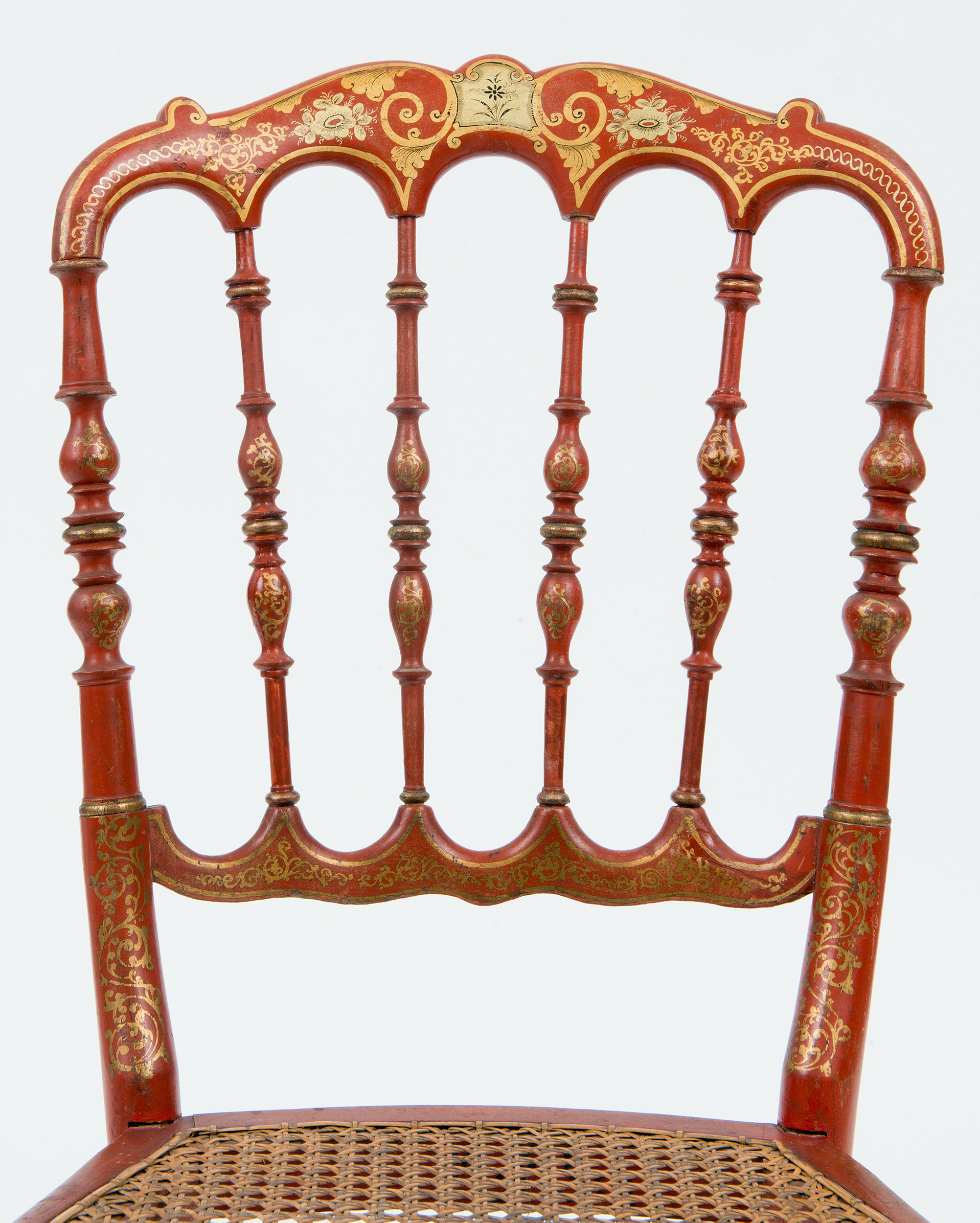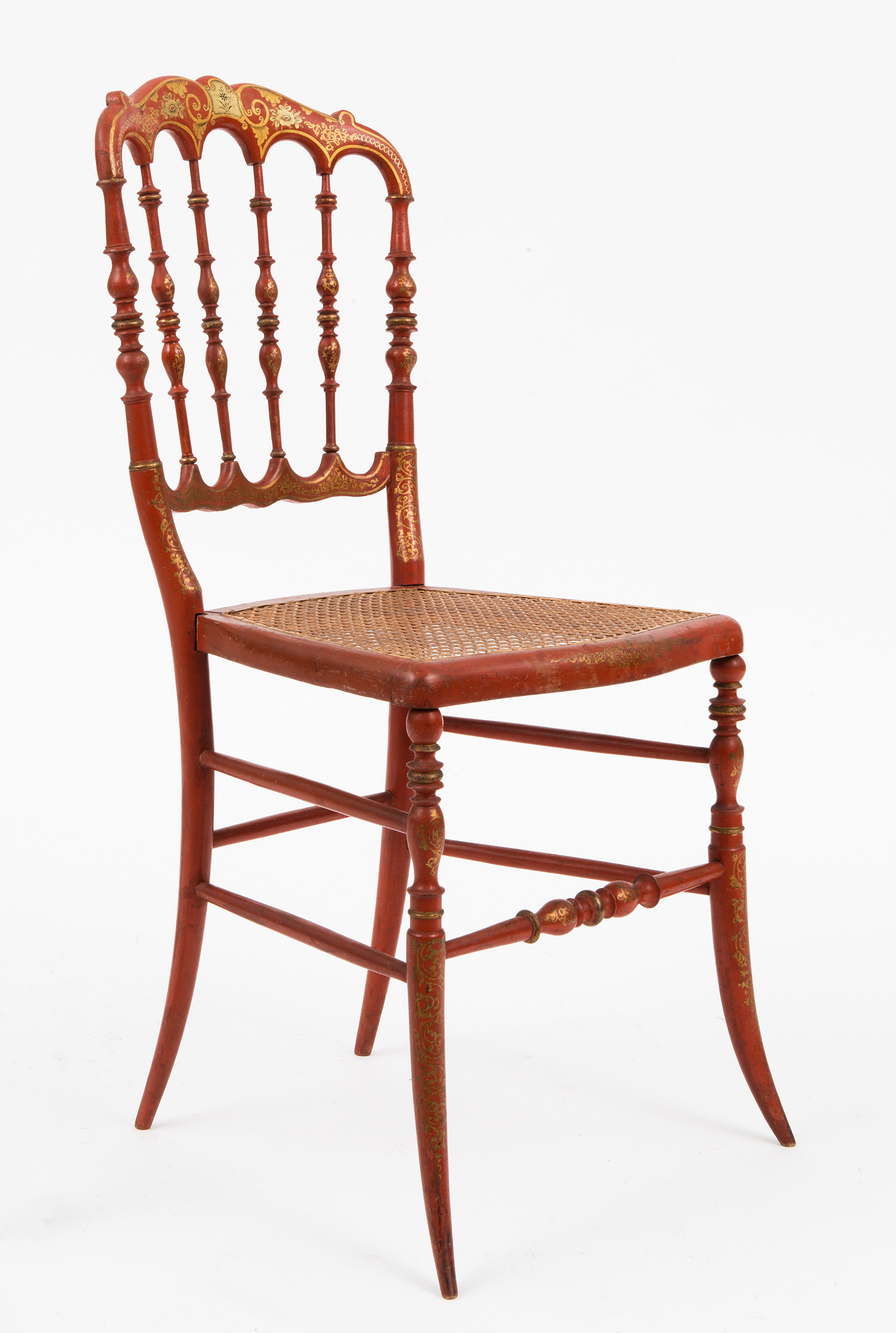 Wilanowskie Chiavari to lekkie, delikatne krzesełko o siedzisku w kształcie trapezu z lekko zaokrąglonymi narożami i wybrzuszonej przedniej krawędzi. Rama ażurowego oparcia pleców przechodzi płynnie w zwężające się ku dołowi nieco wygięte tylne nóżki. Boczne nóżki i przednie połączone są między sobą szeregowo pojedynczym wiązaniem, pary bocznych nóg mają ze sobą dodatkowe wzmocnienie. Siedzisko wypełnione jest trzcinową plecionką. Krzesło sprawia wrażenie delikatnej konstrukcji dzięki zastosowaniu jako elementy nośne toczonych i rzeźbionych, drewnianych listewek o szczególnej wytrzymałości materiału i odpowiednich technologii ich połączeń. Powierzchnia mebla lakierowana na kolor czerwony pokryta została subtelną dekoracją malowaną złotem, złożoną z motywów roślinnych podkreślającą toczone elementy tralek w oparciu i kształty ażurów.