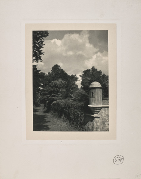 Fotografia przedstawia fragment parku w Łańcucie z narożnikiem bastionu północno-zachodniego z kawalierą z lat 1629 – 1641: cylindryczną wieżyczką zwieńczoną kopułką, z prostokątnymi otworami. Bok bastionu od strony fosy pokrywają pnącza. W tle krzewy i drzewa. Fotografia wykonana została latem. Fotografia wykonana została przez dr Józefa Piotrowskiego (1873-1939), lwowskiego historyka sztuki. Od 1 VI 920r. do 1929r. pełnił on funkcję konserwatora zabytków przy Lwowskim Urzędzie Wojewódzkim (zob. Piotr Lasek, Inwentaryzacja zabytków architektury w lwowskim okręgu konserwatorskim 1920-1939. Szkice z dziejów, Instytut Sztuki PAN, Warszawa 2020, s. 32-62). Jest on autorem wydanego w 1933r. we Lwowie opracowania Zamek w Łańcucie. Zwięzły opis dziejów i zbiorów oraz autorem dokumentacji fotograficznej zamku w Łańcucie, jego wnętrz i zbiorów, stanowiących dziś własność Muzeum-Zamku w Łańcucie (m.in. albumy, t. I-X, Lwów 1936) oraz Instytutu Sztuki Polskiej Akademii Nauk w Warszawie (albumy, t. I-IX, Lwów 1929).