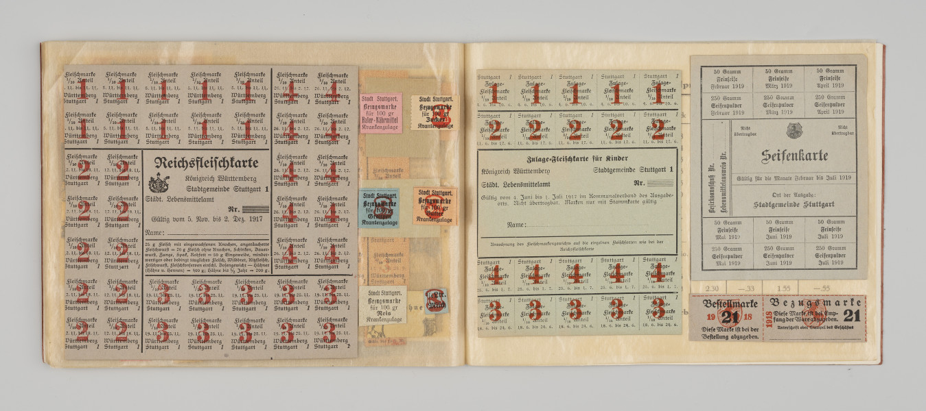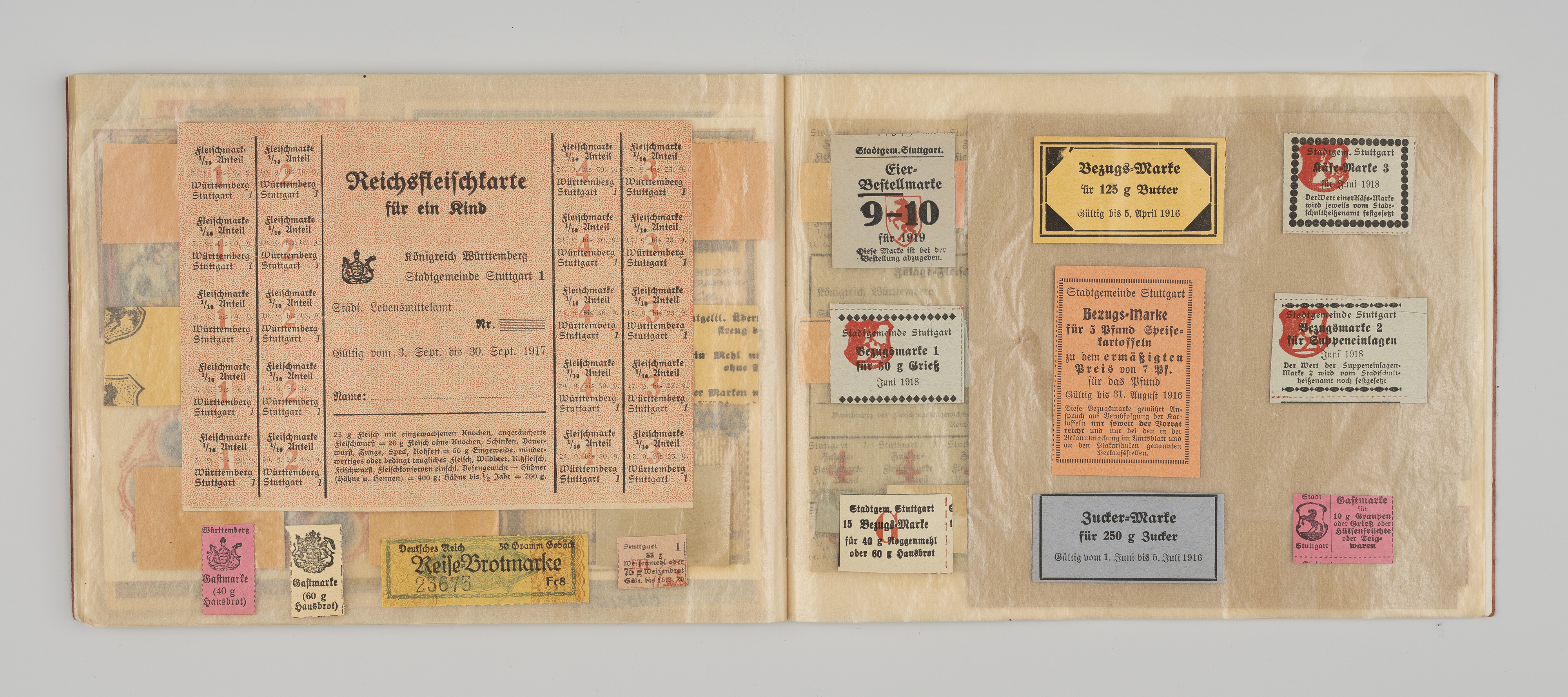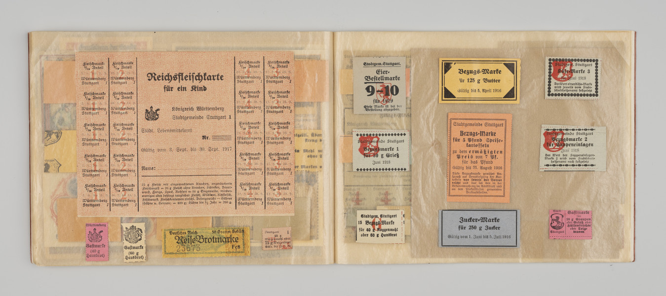 Od strony 11. album wyklejono 33 kartkami zaopatrzeniowymi na towary reglamentowane – głównie produkty żywnościowe, które między 1916 a 1920 wydała gmina miejska w Stuttgarcie. 4 to kompletne arkusze a 29 sztuk stanowi odcinki z różnych kartek, głównie z lat 1916–1918. W Niemczech, w okresie I wojny światowej, kartki zaopatrzeniowe zwykle wydawano na konkretne miesiące, a realizowano w systemie tygodniowym. Wyjątkiem były kartki na niektóre produkty przemysłowe, np. mydło, które wydawano w systemie półrocznym, a realizowano w systemie miesięcznym. Najwięcej, bo aż 15 odcinków odnosi się do przydziału niskiej jakości mąki chlebowej i wzbogaconego o różne dodatki chleba domowego. W albumie występują również kartki na jaja, masło, cukier, ser, mięso, kaszę, ziemniaki i mydło.