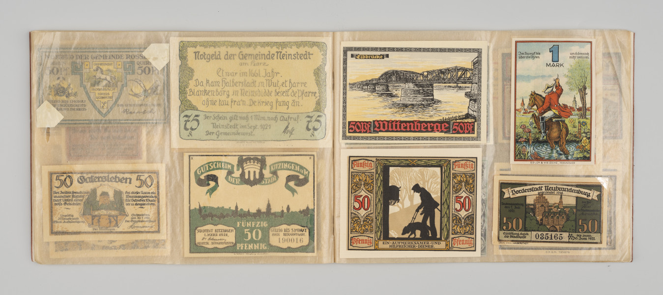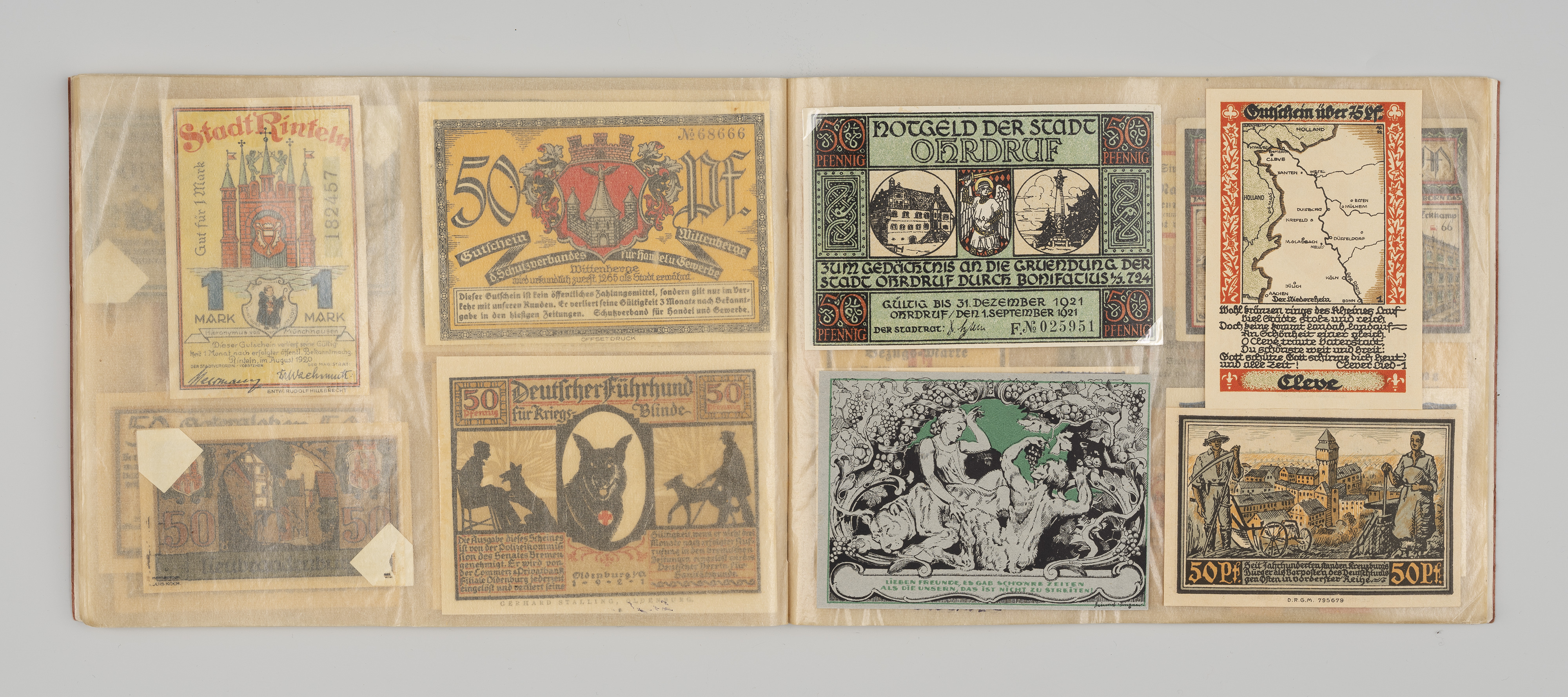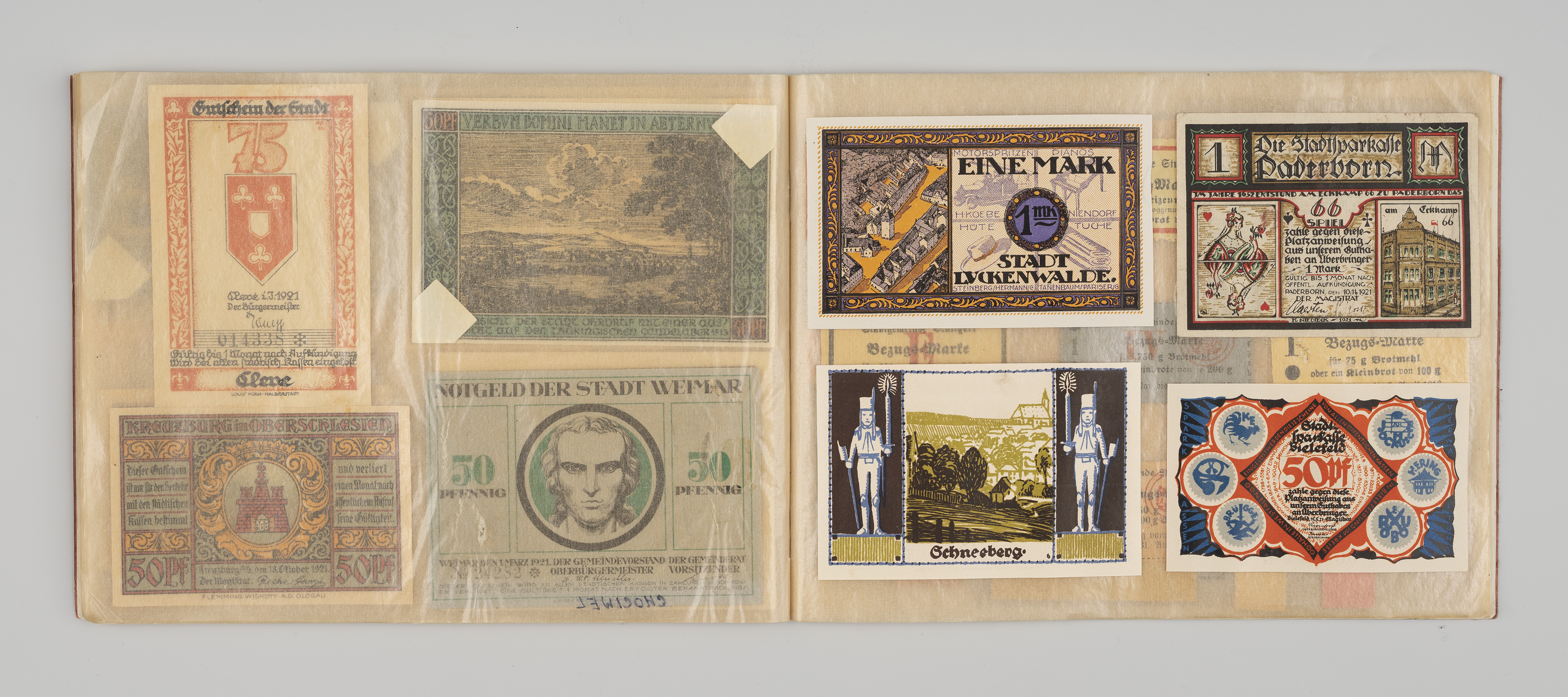 Na pierwszych 5 kartach z papieru pergaminowego wklejono 41 bonów kolekcjonerskich z lat 1920–1922. Najliczniej reprezentowany, bo aż 35 sztukami, jest rok 1921, 4 bony wydano w 1922, a jedynie 3 w 1920 roku. Większość pochodzi z obecnej Nadrenii Północnej-Westfalii oraz Saksonii-Anhalt – po 7 sztuk, następne z Turyngii i Dolnej Saksonii – po 5 sztuk. Z obszaru Pomorza w kolekcji znajduje się jedynie egzemplarz z Bytowa. Zbiór zawiera najpowszechniejsze, a więc i najtańsze bony dostępne w owym czasie w handlu. Oprócz kolekcjonerskiego rarytasu, bonu wartości 75 fenigów wydanego przez zarząd gminy Neinstedt w Górach Harzu (Saksonia-Anhalt), w zbiorze brakuje cenniejszych okazów.