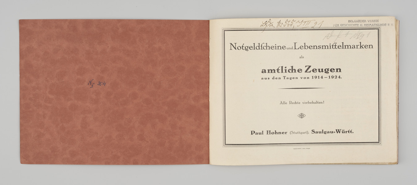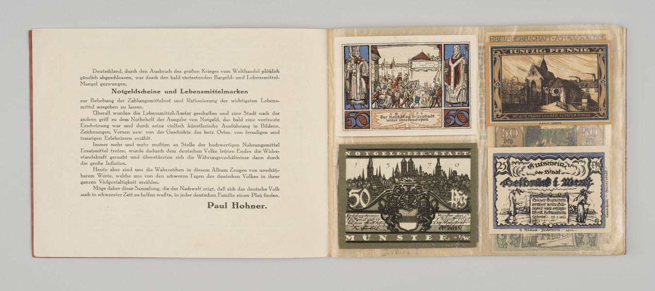 Prezentowany album kolekcjonerski zawiera seryjne pieniądze zastępcze z początku lat 20. XX wieku i kartki żywnościowe z I wojny światowej. We wstępie pióra Paula Hohnera, handlarza pieniędzmi zastępczymi ze Stuttgartu, będącego projektantem albumu i autorem kolekcji, przybliżono koncepcję pieniędzy zastępczych, kartek żywnościowych i samą ideę powstania albumu.