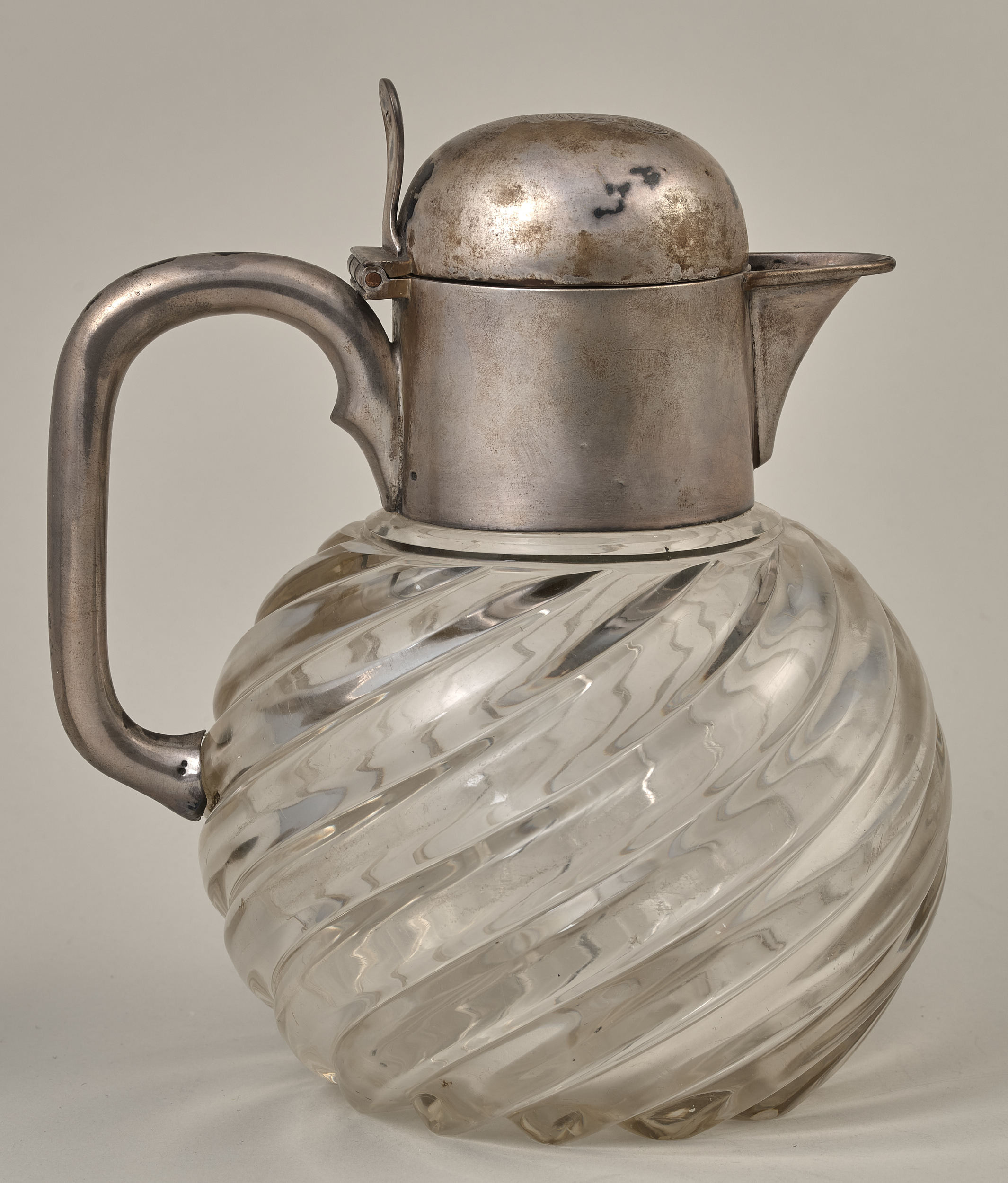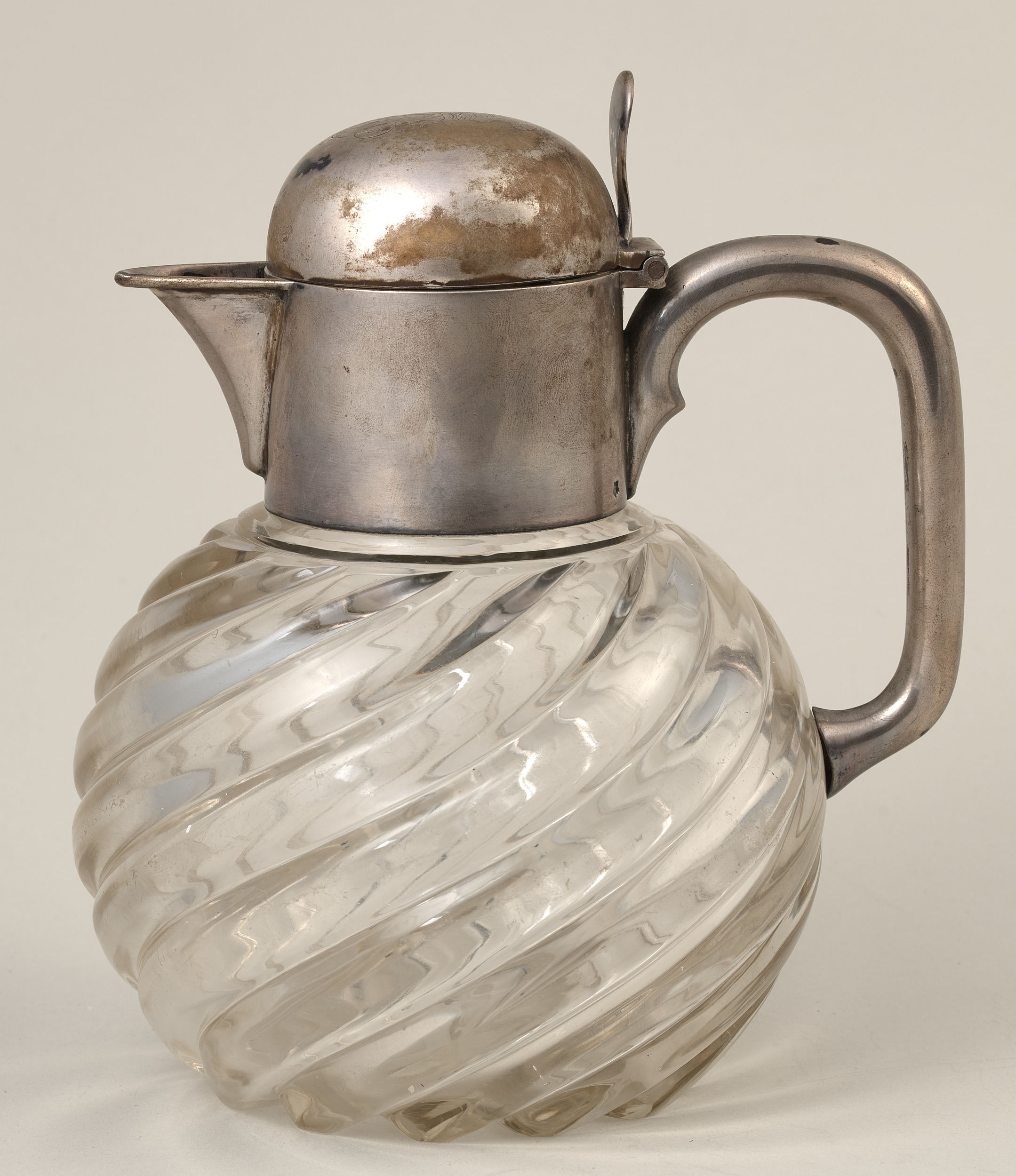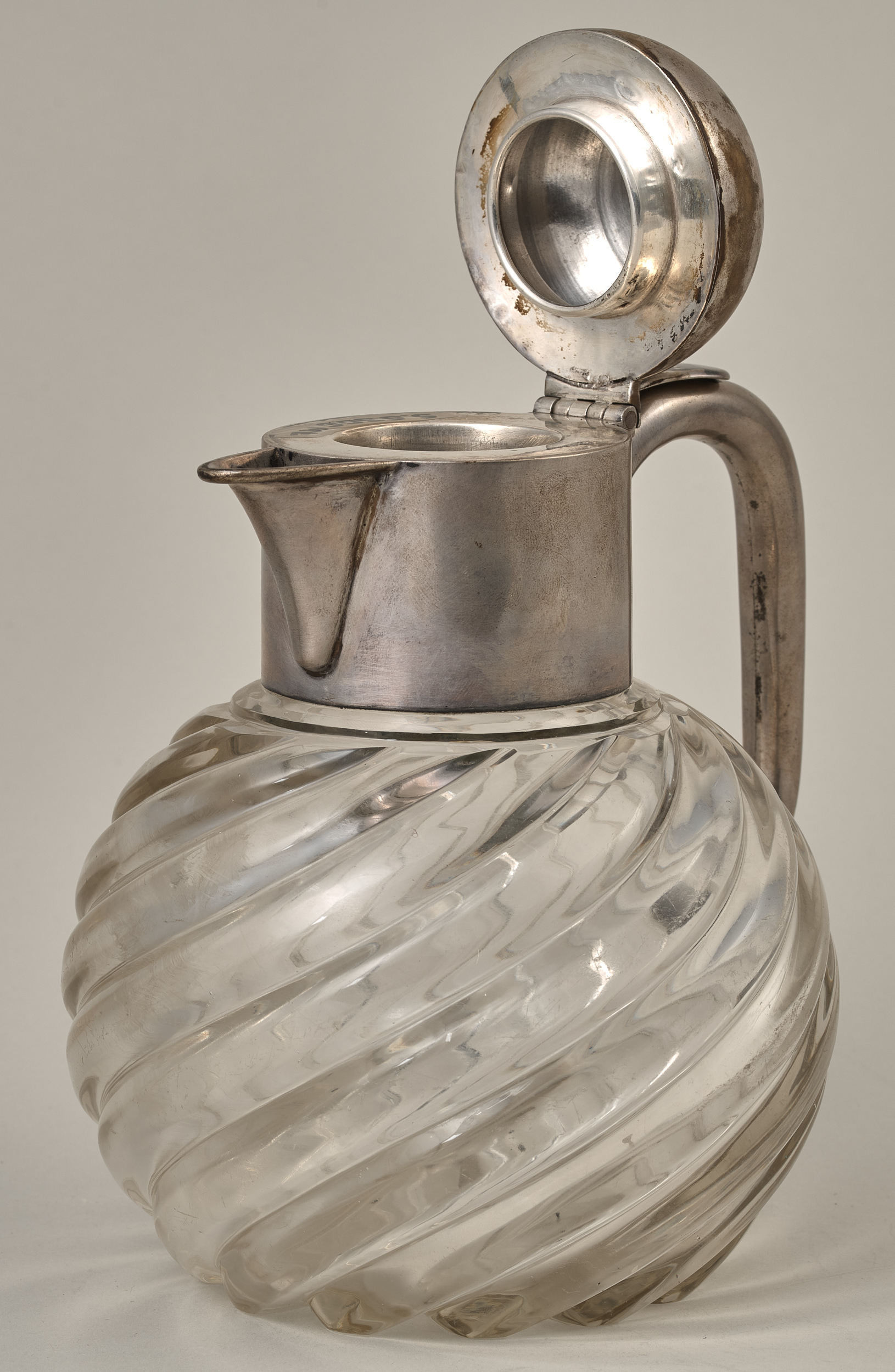 Niewielki dzbanek na wino ze szkła kryształowego i srebra, z kolekcji Potockich, wyrób wiedeński z około 1915 roku. Brzusiec dzbanka wykonany ze szkła kryształowego, skośnie karbowanego. Gardziel, wylew, nakrywa i ucho ze srebra. Nakrywa w kształcie półkuli ,z dźwignią służącą do podnoszenia palcem, ozdobiona jest po środku monogramem RP pod dziewięciopałkową koroną i pięcioma piórami. Monogram i korona wskazują, że właścicielem był Roman Potocki III Ordynat Łańcucki. Znaki złotnicze umieszczono na nakrywie. Ucho dzbanka w kształcie litery C pogrubione przy gardzieli. Dzbanki na wino wykonane ze szkła i srebra (oprawione w srebro) stały się modne w połowie XIX wieku. Oprawy ze srebra były często bogato zdobione / dekorowane, zaś ich brzusiec zdobiono rżniętym lub trawionym ornamentem. Spotyka się też dzbanki w całości wykonane ze srebra, ale były one mniej popularne, gdyż uniemożliwiały dojrzenia koloru wina.
