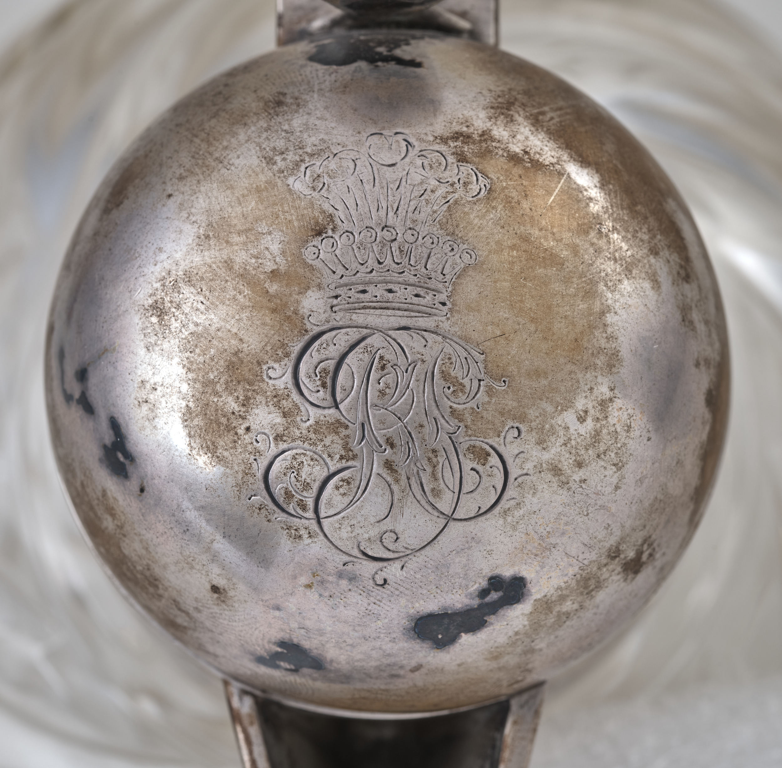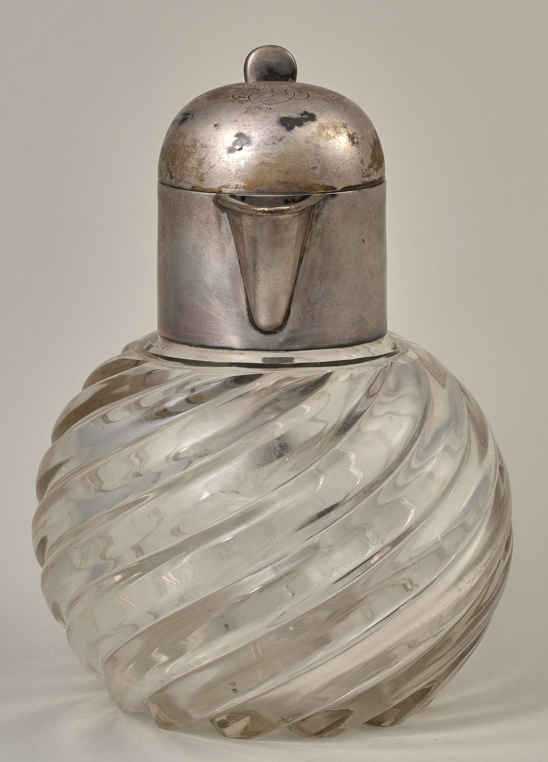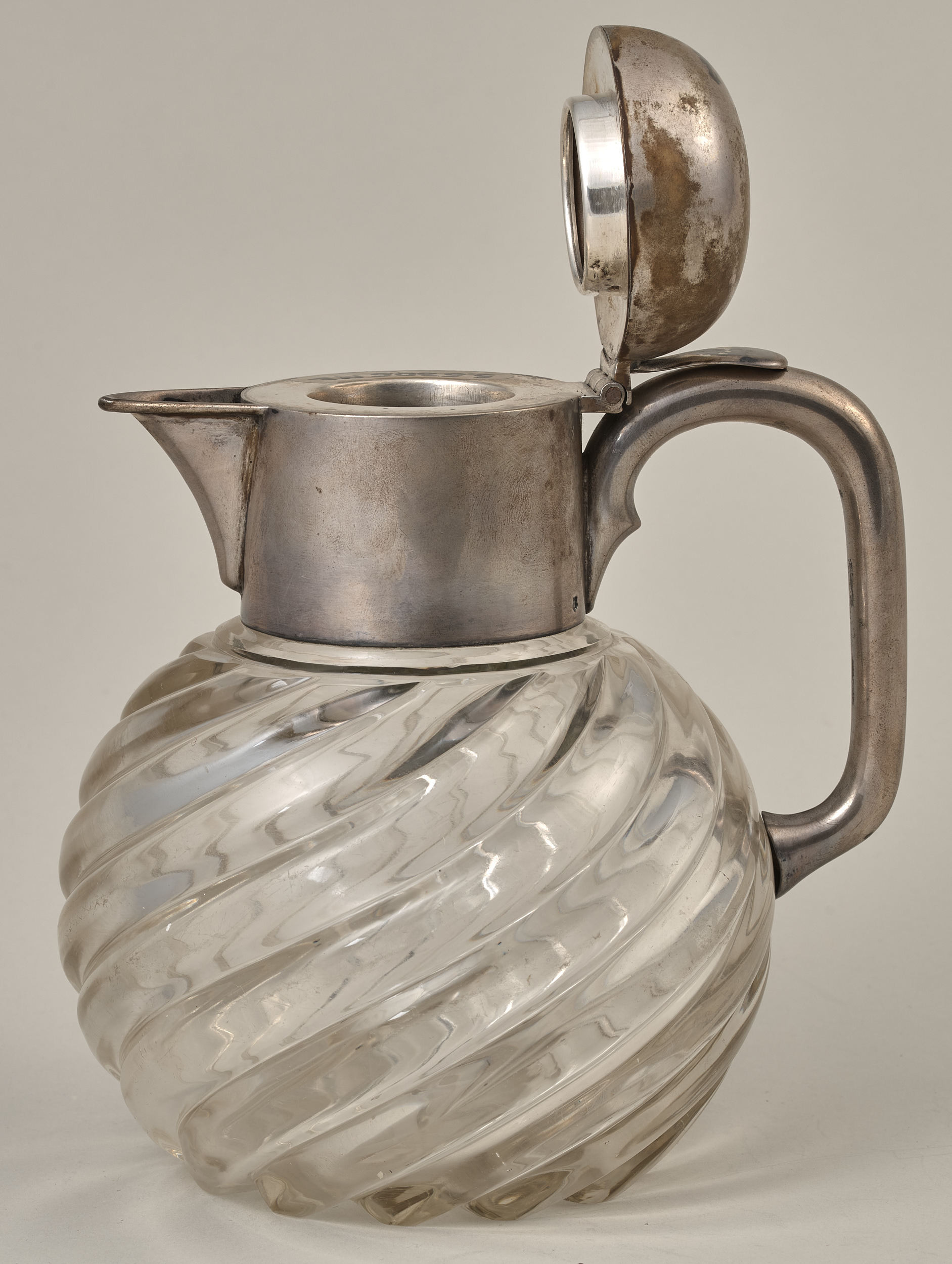 Niewielki dzbanek na wino ze szkła kryształowego i srebra, z kolekcji Potockich, wyrób wiedeński z około 1915 roku. Brzusiec dzbanka wykonany ze szkła kryształowego, skośnie karbowanego. Gardziel, wylew, nakrywa i ucho ze srebra. Nakrywa w kształcie półkuli ,z dźwignią służącą do podnoszenia palcem, ozdobiona jest po środku monogramem RP pod dziewięciopałkową koroną i pięcioma piórami. Monogram i korona wskazują, że właścicielem był Roman Potocki III Ordynat Łańcucki. Znaki złotnicze umieszczono na nakrywie. Ucho dzbanka w kształcie litery C pogrubione przy gardzieli. Dzbanki na wino wykonane ze szkła i srebra (oprawione w srebro) stały się modne w połowie XIX wieku. Oprawy ze srebra były często bogato zdobione / dekorowane, zaś ich brzusiec zdobiono rżniętym lub trawionym ornamentem. Spotyka się też dzbanki w całości wykonane ze srebra, ale były one mniej popularne, gdyż uniemożliwiały dojrzenia koloru wina.