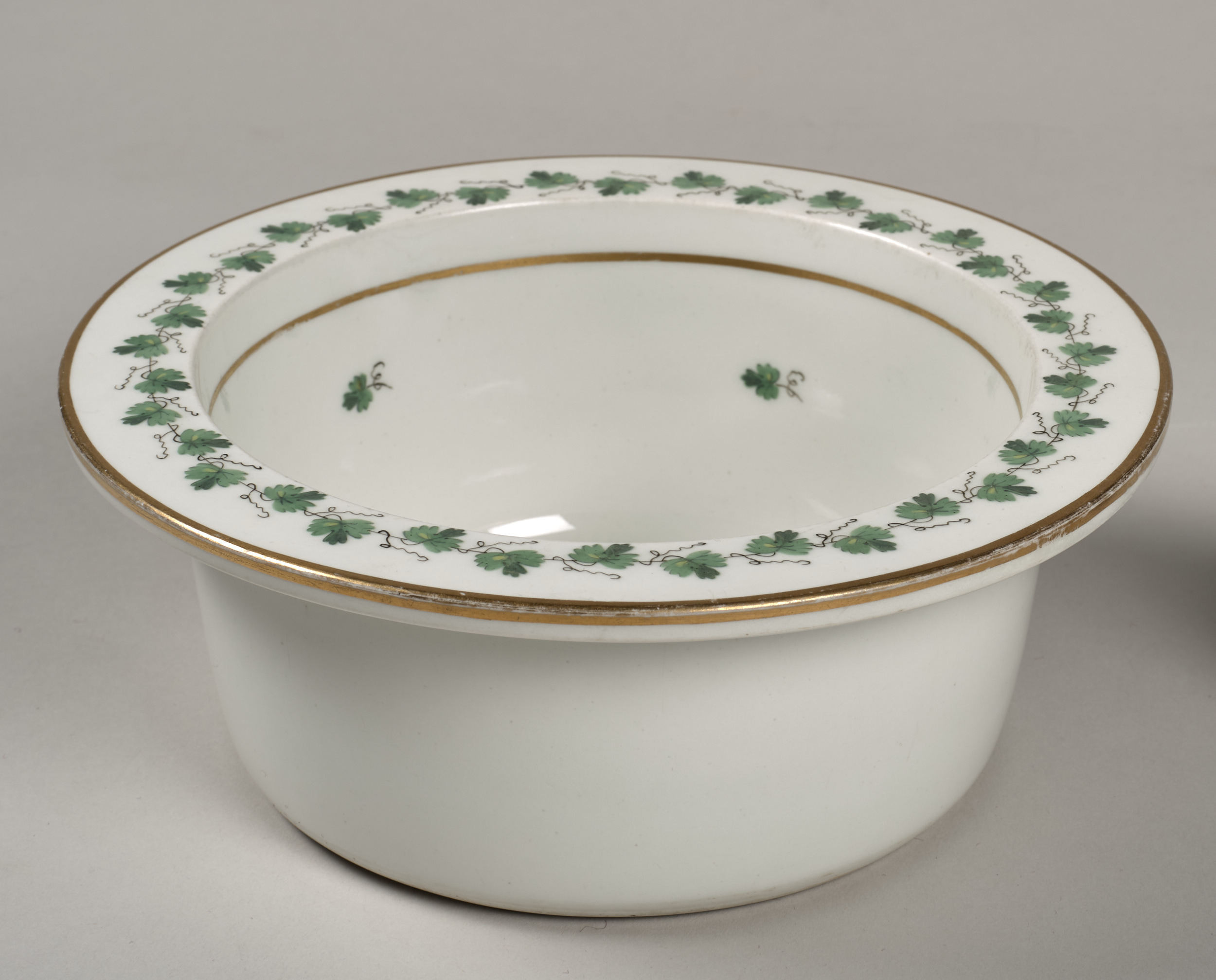 Naczynie wchodzi w skład serwisu obiadowego we wzór liści winorośli wykonanego w manufakturze porcelany w Wiedniu. Wytwórnia ta powstała w 1718 r. jako druga w Europie, po Miśni , manufaktura porcelany, działała do 1864 r. Serwisy obiadowe, śniadaniowe, do herbaty, kawy i czekolady stanowiły zasadniczą część produkcji wiedeńskiej wytwórni, zwłaszcza od 4 ćw. XVIII w. Serwis obiadowy, którego część została zakupiona przez muzeum w Łańcucie powstał w okresie kiedy manufakturą wiedeńską kierował Mathias Niedermayer (1805 – 1827). Zakupiona część serwisu składa się z dziewiętnastu sztuk: sześciu talerzy półgłębokich, wazki, dwóch salaterek okrągłych, dwóch salaterek okrągłych z pokrywami, dwóch salaterek kwadratowych, salaterki łódkowatej, dwóch półmisków owalnych, miski okrągłej, dwóch wkładów. Jest to serwis w stylu klasycystycznym. Zdobiony jest szlakiem z jasno i ciemnozielonych liści winorośli rozjaśnionych żółcią oraz rzutem takich pojedynczych liści. Powyższe naczynie jest okrągłe, z szerokim i płaskim kołnierzem. Zdobione jest na kołnierzu szlakiem liści winorośli, wewnątrz złoconą obwódka, poniżej - rzutem pojedynczych liści winorośli, na dnie naczynia – gałązka takich liści. Zewnętrzna krawędź kołnierza podkreślona złoconym paskiem.