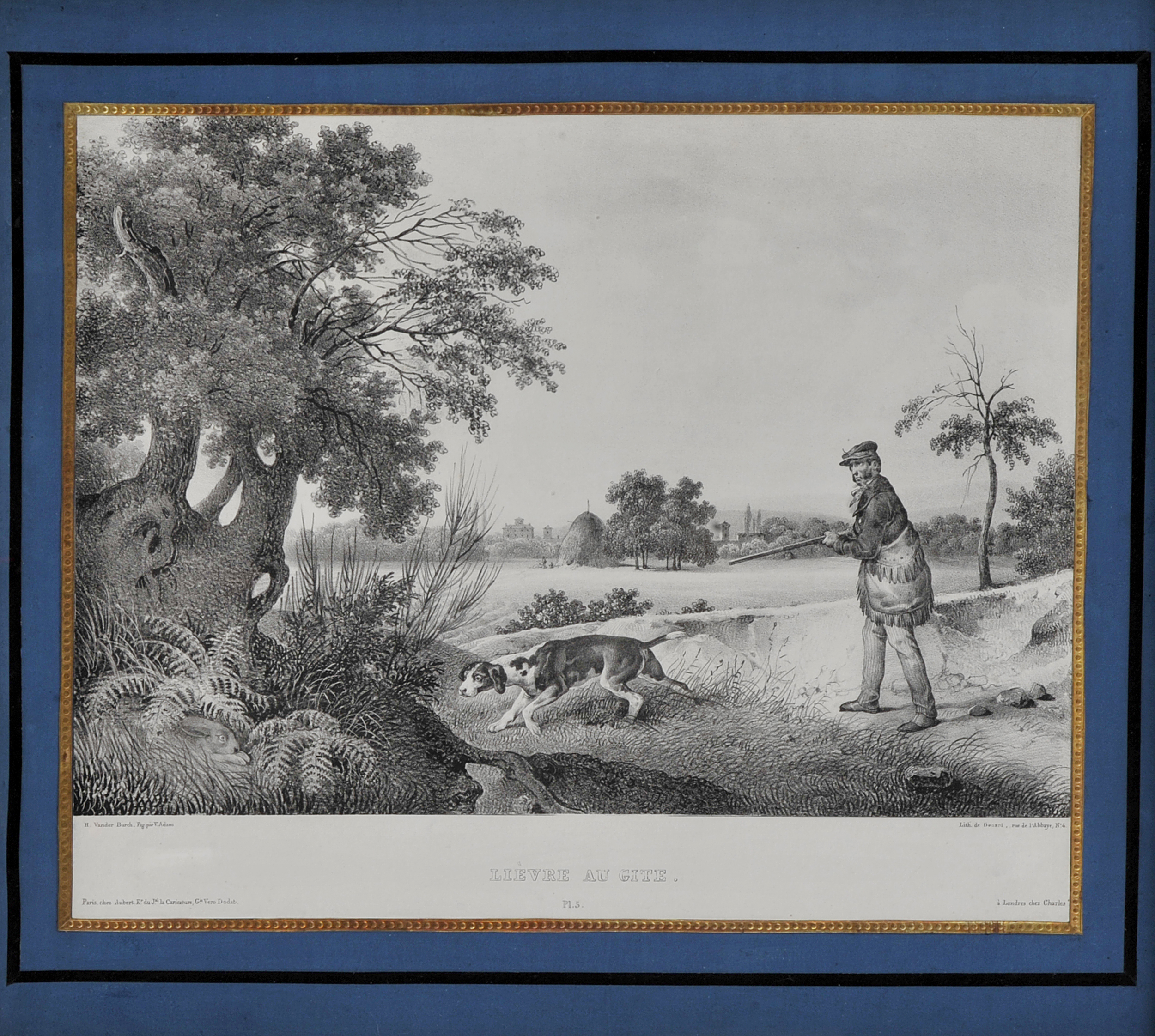 Jest to kolejna praca na o tematyce myśliwskiej w zbiorach wilanowskich grafik, obok zachowanych „Polowania na łasicę”, „Polowania w winnicy”,” Kłusownika”, „Polowania na kaczki” oraz „Upadku z konia”. Wszystkie wymienione zostały oprawione w zbliżony sposób (niebieskie, dekorowane złoconymi listwami passe-partout, złocone ramki), co jest prawdopodobnym tropem do konkluzji, że pierwotnie przeznaczone były do wspólnej ekspozycji. Utrwalona scena opisana u dołu jako „LIEVRE AU GITE”, ukazuje rozległą łąkę, a na niej zamykające lewą stronę kompozycji duże, chylące się drzewo. Na wprost niego stoi myśliwy z przewieszoną przez ramię skórzaną torbą, w rękach trzyma strzelbę, którą kieruje na ukrytego w gąszczu pod drzewem zająca. Myśliwemu towarzyszy nieodłączny uczestnik polowań na zwierzynę – pies, w tym przypadku – łaciaty wyżeł. Litografia, poza informacjami o autorstwie oraz tytule, zawiera numer 5. (pl. 5.). Wskazuje on, że grafika należy do zdekompletowanego zespołu (w wilanowskich zbiorach zachowały się, obok omawianej, numery 1, 2 oraz 6). Zachowane w kolekcji Muzeum Pałacu Króla Jana III w Wilanowie pamiątek związanych z myślistwem, w tym grafik, wiązać można z postacią ostatniego męskiego właściciela z rodziny Potockich, Augusta (1806-1867), który gospodarował dobrami w latach 1845-1867. Niewykluczone jednak, biorąc pod uwagę ich czas powstania, że znalazły się w zbiorach za sprawą ojca Augusta, Aleksandra Potockiego (1778-1825), założyciela stadniny w Janowie Podlaskim. Warto wspomnieć o samej technice, w której wykonana została odbitka, popularnym w XIX wieku druku płaskim – litografii. Technika polegała na wykonywaniu rysunku na specjalnie przygotowanym do tego kamieniu, a następnie na poddaniu go sekwencji procesów chemicznych, w efekcie których nałożona przed odbiciem w prasie drukarskiej farba, utrzymywała się tylko w miejscach rysunku, pozostawiając resztę płyty czystą. Litografia zdobyła ogromną popularność, nie tylko z uwagi na szerokie możliwości pod względem efektów artystycznych, ale także dzięki trwałości materiału, a w konsekwencji – możliwość drukowani naprawdę dużej ilości odbitek. Pod samą sceną znalazły się podpisy informujące o autorstwie oraz miejscach wydania; wzory dla figury myśliwego stworzył Victor Adam, litografował Jean-François Benard, a całość wydana była w Paryżu, u Auberta oraz Londynie, u Tilta. Więcej informacji o paryskim domu Aubert et cie., uwzględnionych zostało przy okazji omówienia litografii pt. „Polowanie na łasicę”, nr inw. Wil.1797.