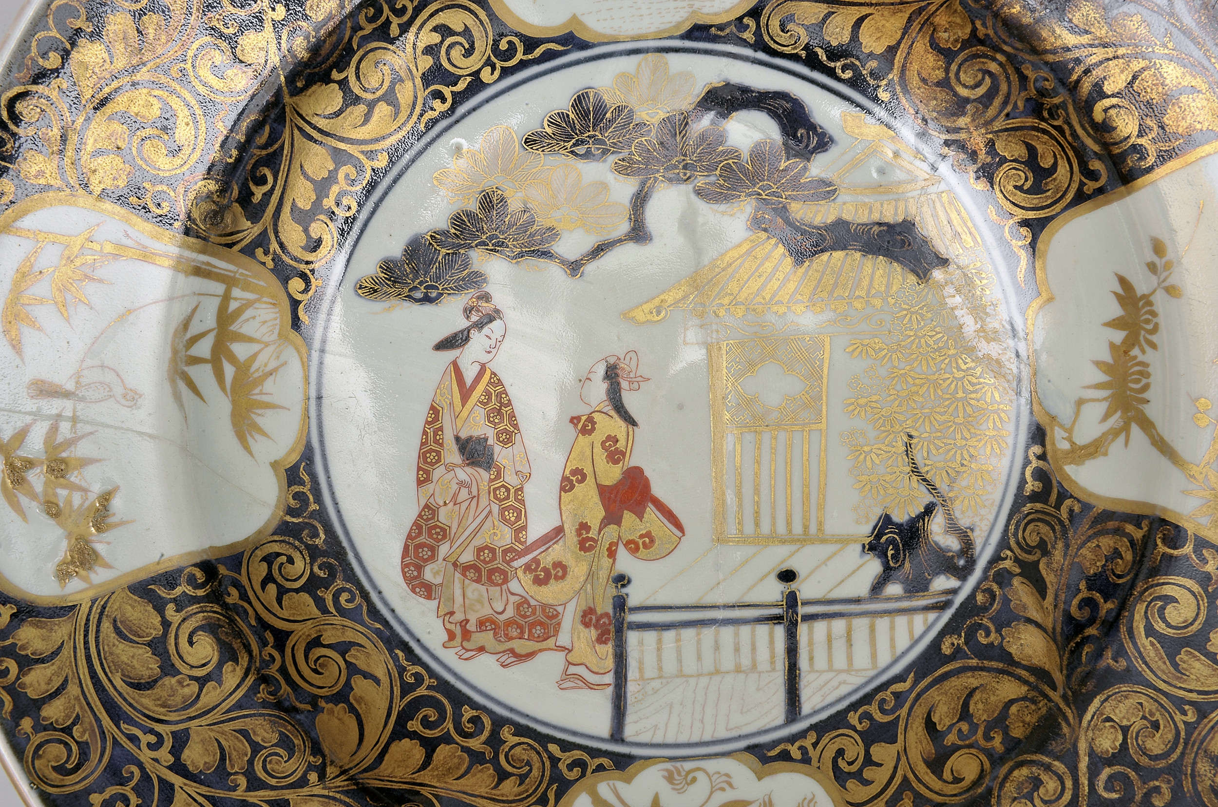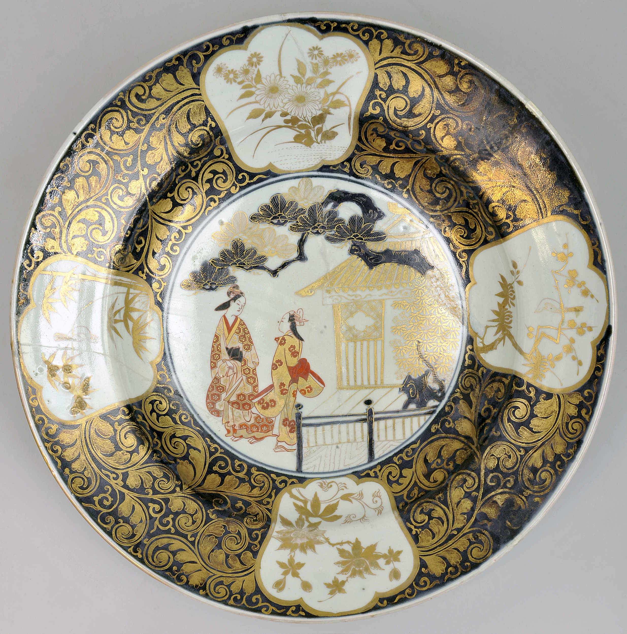 Dekoracja centralnej partii lustra została ujęta kobaltowym okręgiem. Przedstawia parę bijin – japońskich piękności odzianych w kimono, w tle zaś pawilon i górującą rozłożystą sosnę. Pozostałą część lustra naczynia oraz kołnierz zajmuje piękna złota karakusa na ciemnokobaltowym tle, i cztery rezerwy, czyli wyodrębnione pola obwiedzione krawędzią, wypełnione dekoracją. Karakusa to motyw zdobniczy wywodzący się z arabeski – ornamentu powstałego w islamskich kulturach Bliskiego Wschodu. Trafił on do Azji dzięki transportom różnorodnych towarów prowadzonym Jedwabnym Szlakiem. W Japonii motyw karakusa znany jest od około 7 wieku n.e.