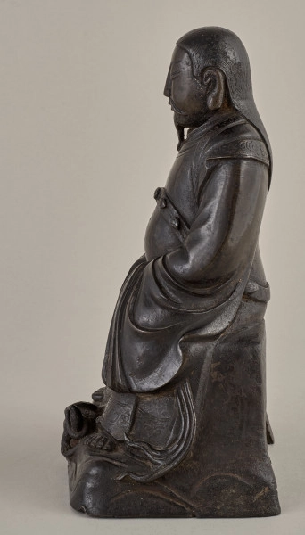 Figurka bóstwa siedzącego na skale, ubranego w długą szatę aż do stóp, pancerz przepasany pasem nabijanym ćwiekami, w płaszcz obramowany kwiatową bordiurą. Ręce wsunięte są w sfałdowane rękawy płaszcza a stopy wsunięte pod szaty, bose. Twarz pełna, szeroki nos, oczy przymknięte, długie wąsy i spiczasta broda, duże uszy, włosy uczesane gładko z tyłu głowy, długie, spływające do połowy pleców. U stóp bóstwa żółw spleciony z wężem – symbolizuje północną stronę świata. Ślady złoceń na płaszczu. Figurka datowana na XVIII wiek, Chiny.