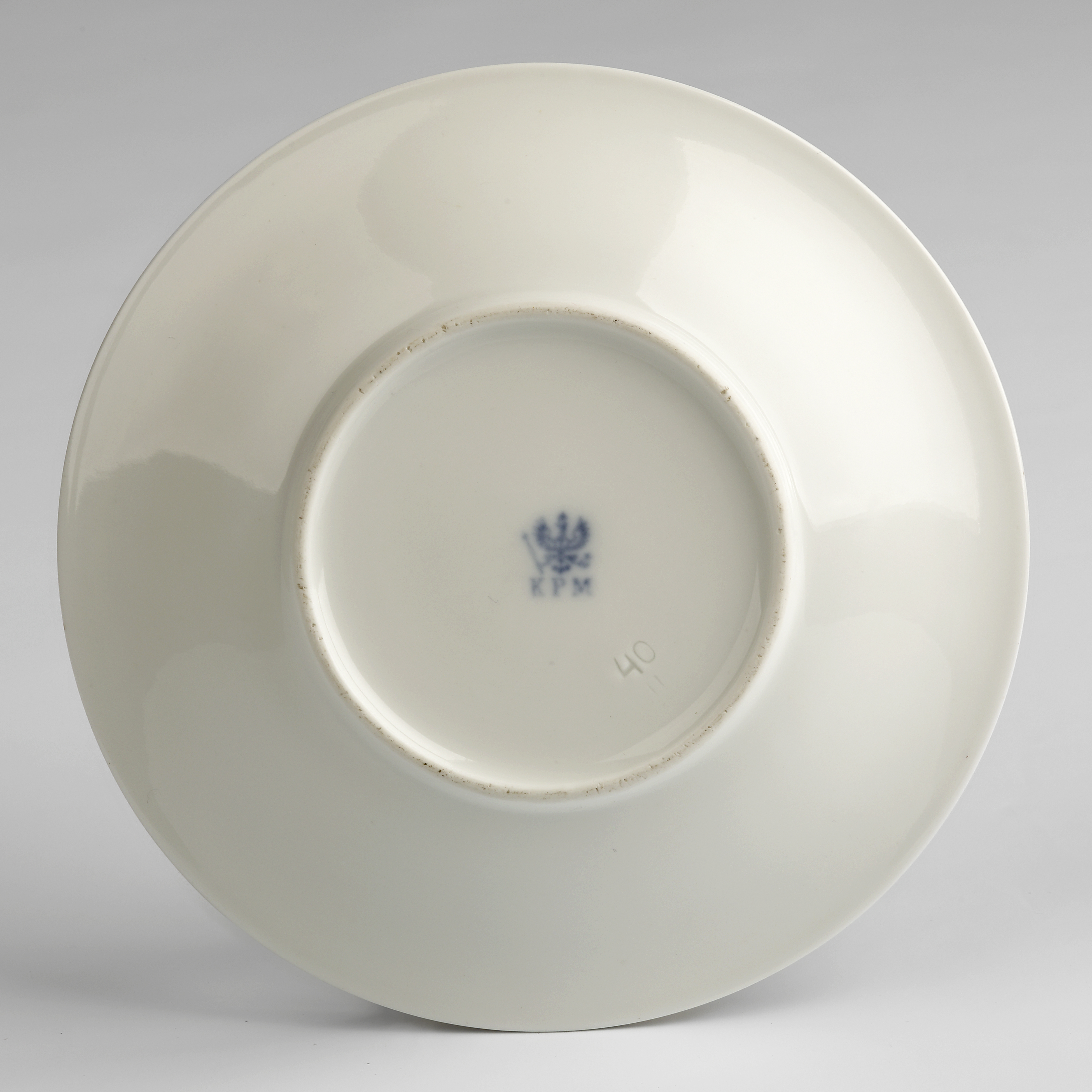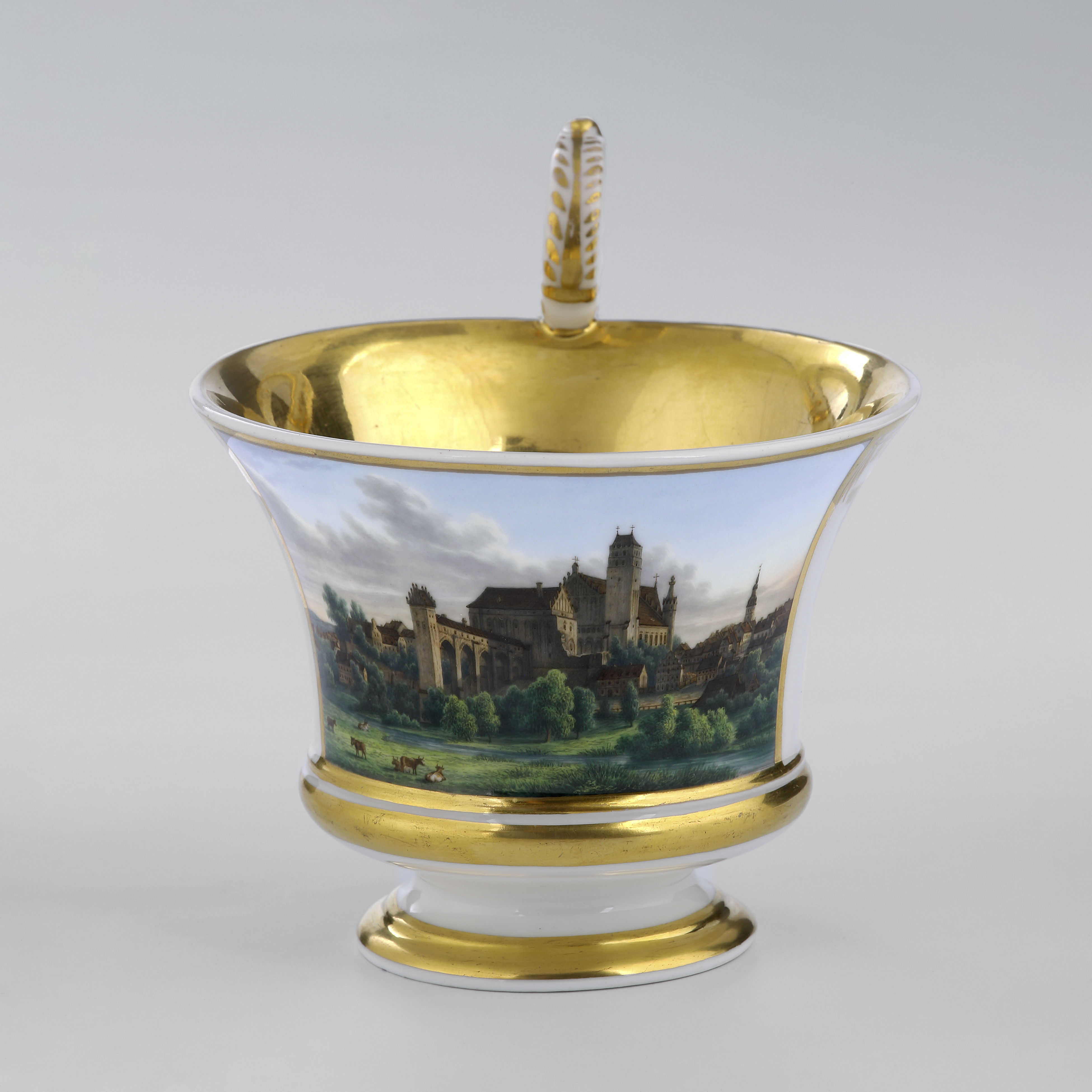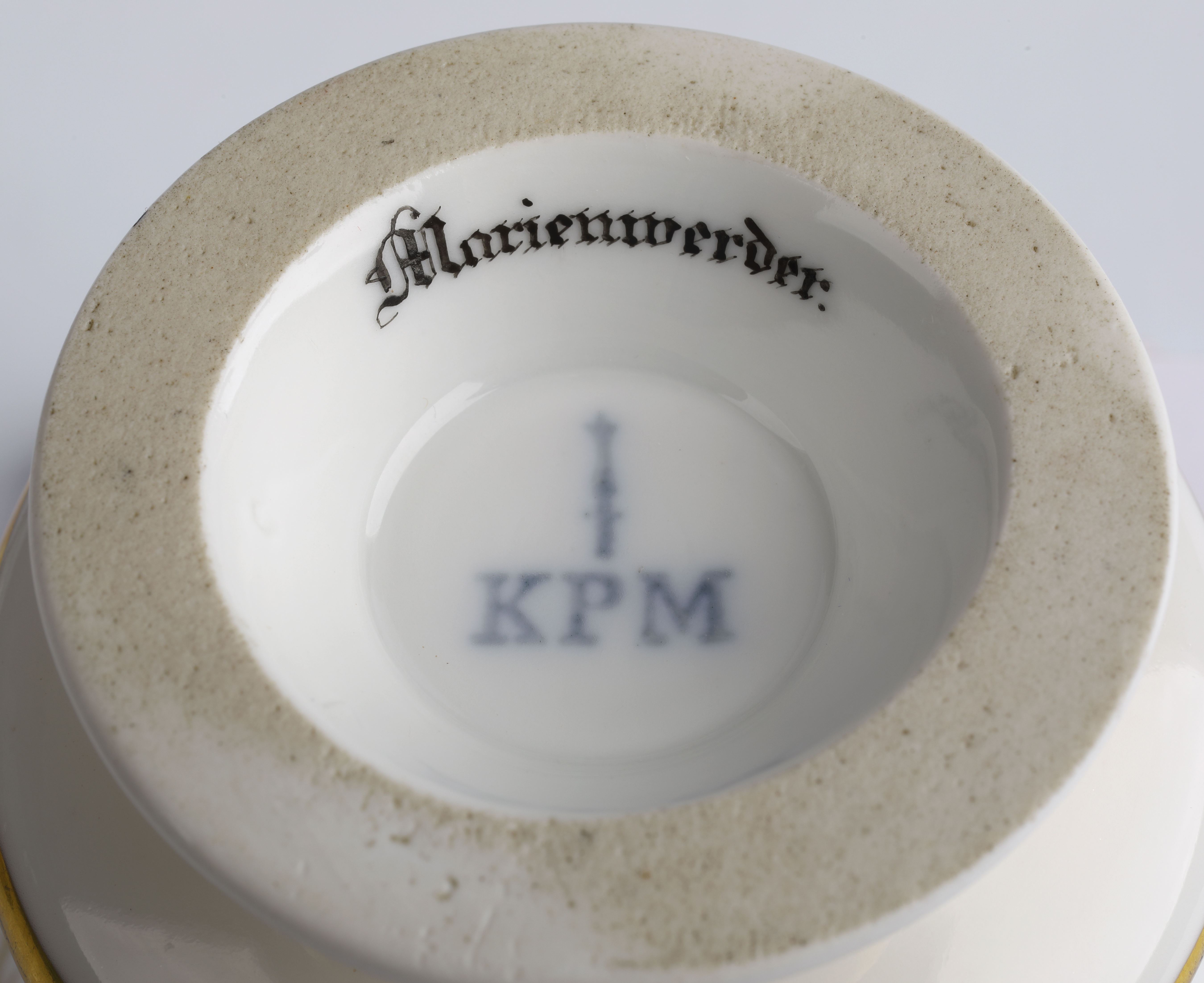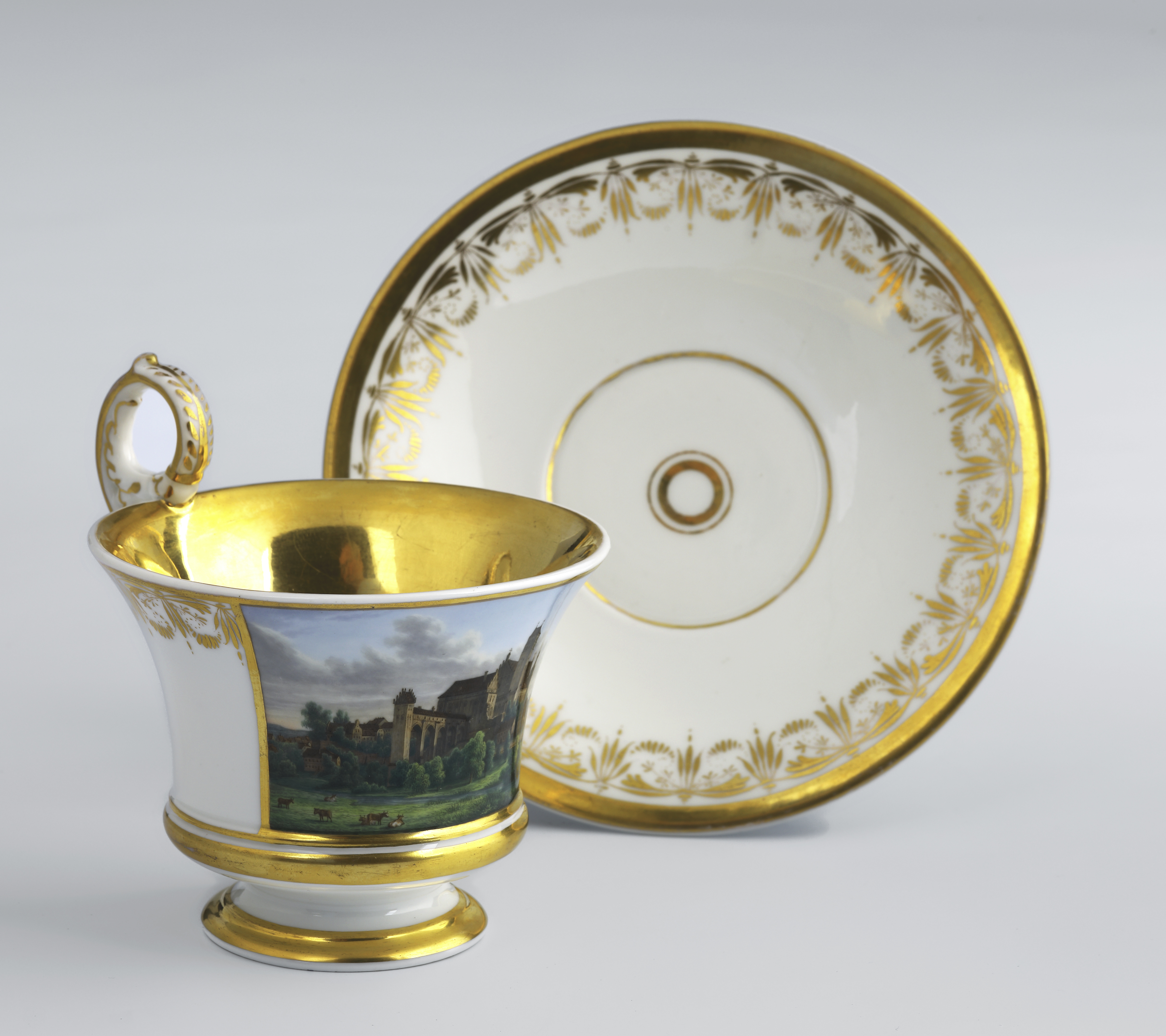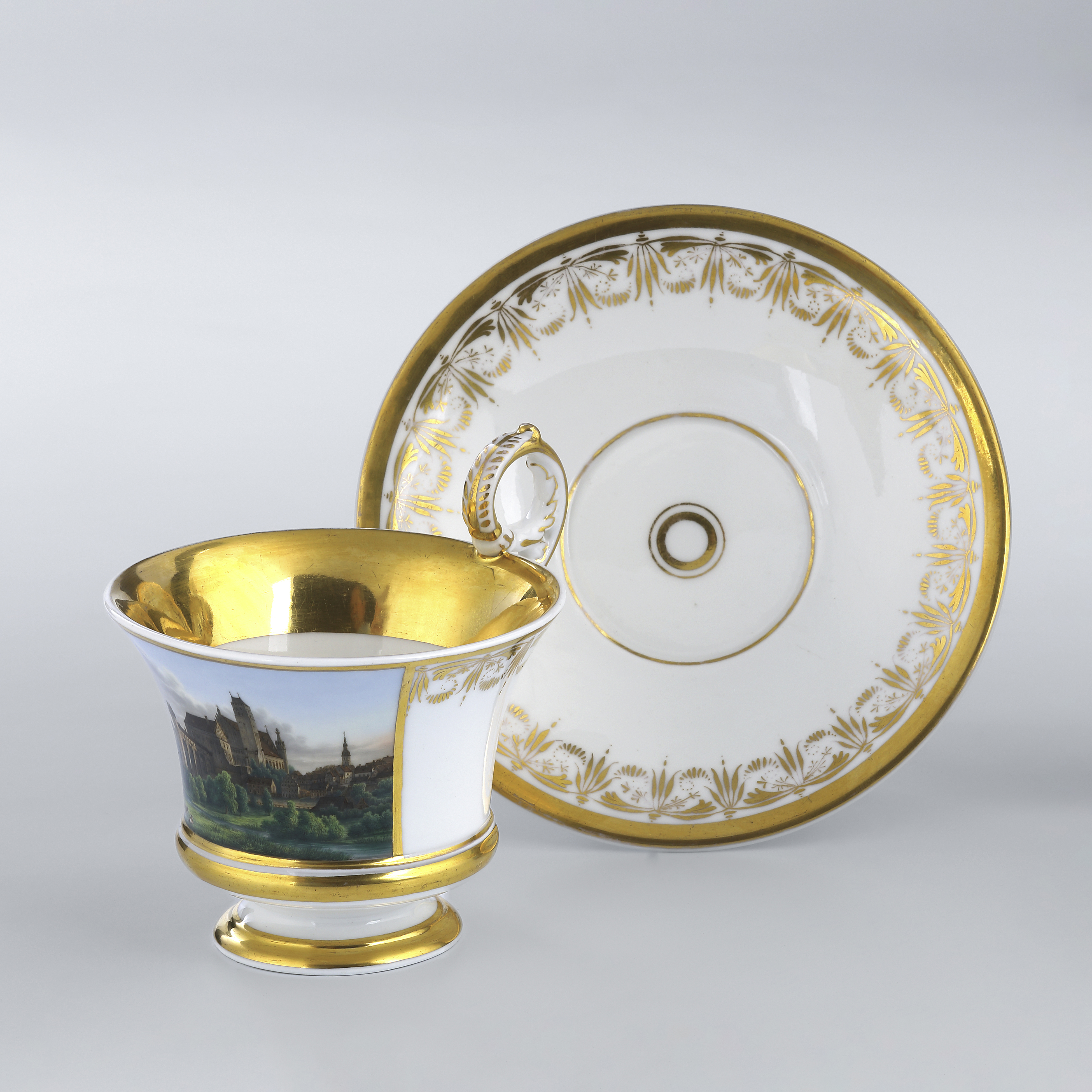 Do tej ostatniej grupy należy porcelanowa filiżanka dekoracyjna ze spodkiem, która wzbogaca zbiory Zamku w Kwidzynie. Skompletowany wtórnie zestaw powstał w Królewskiej Manufakturze Porcelany w Berlinie, na co wskazują sygnatury tej wytwórni. Sama filiżanka posiada kielichowatą formę korpusu na wysklepionej stopie z wystającym nad krawędź wylewu uchem w kształcie zaokrąglonego liścia. Oprócz precyzyjnie wykonanej fryzowej dekoracji bordiurowej i paskowej o złotym kolorze, prezentowana filiżanka posiada na korpusie malarską ozdobę w postaci malowniczej i romantycznej panoramy Kwidzyna.