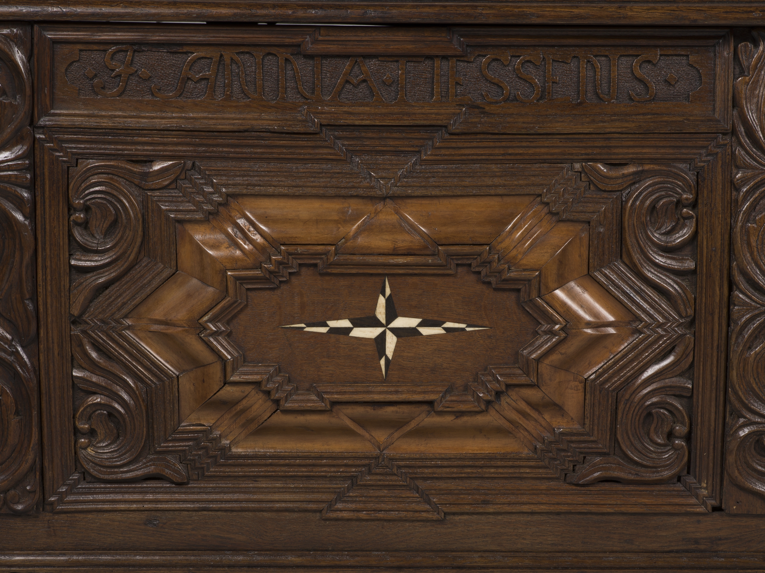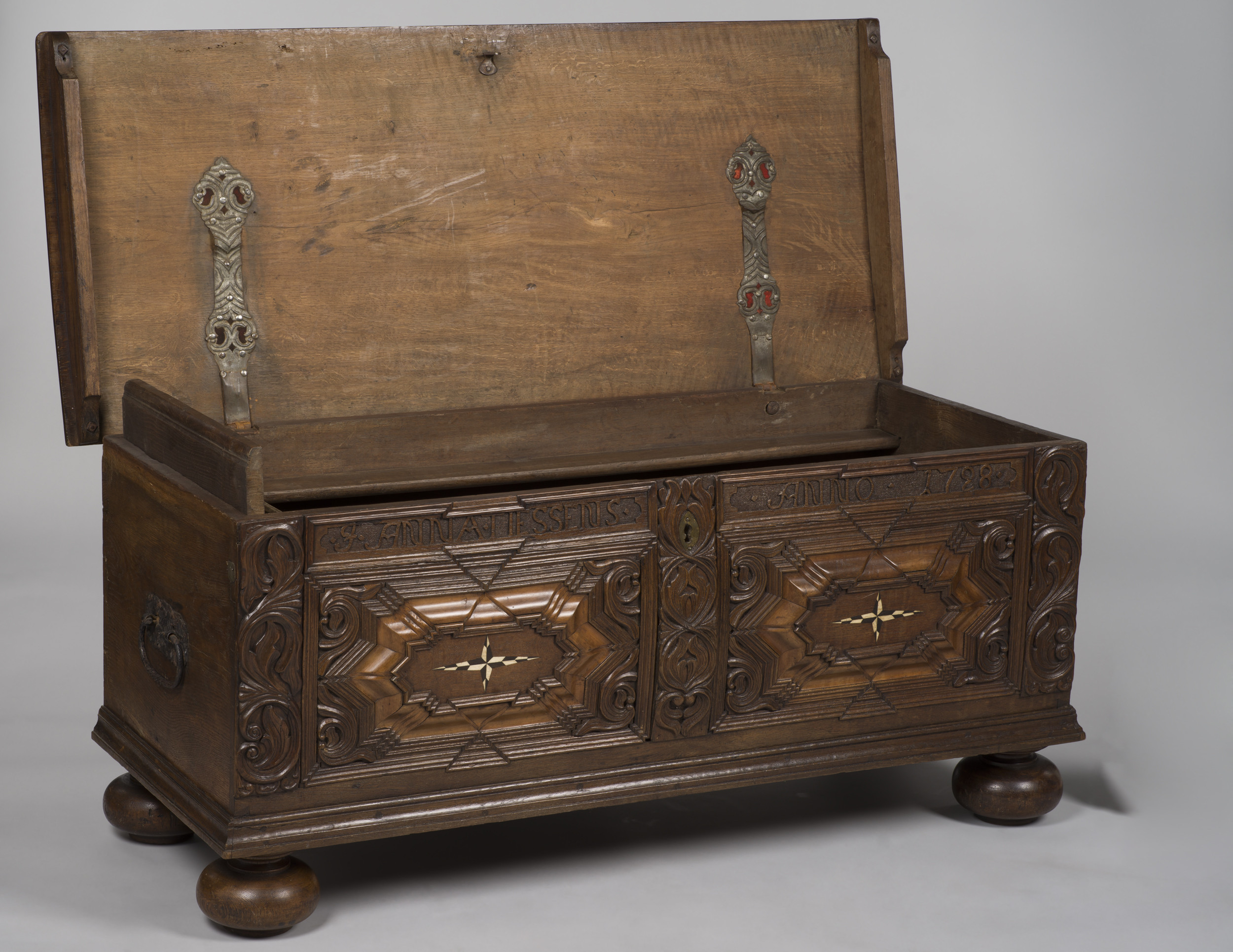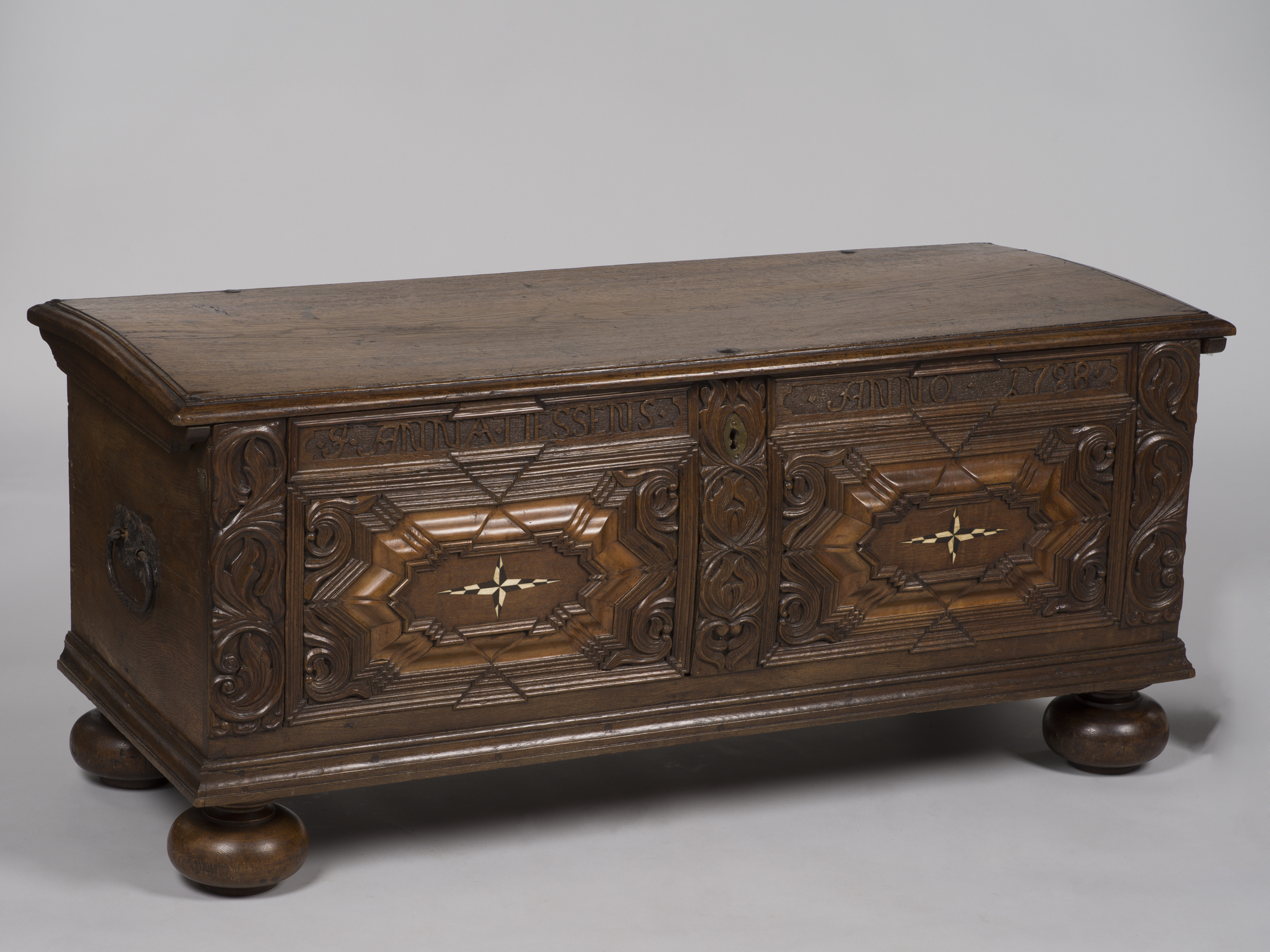 Opisywaną skrzynię nie wyróżnia prosta, solidna konstrukcja lecz dekoracja, będąca kompilacją motywów czerpanych z różnych nurtów estetycznych o klasycznej formie sarkofagu nawiązuje do uproszczonej wersji włoskiej cassone z prostymi ściankami skromniejszymi gzymsami i nogami w kształcie spłaszczonych kul zamiast lwich łap. Dwudzielny podział kompozycji rzeźbiarskiej ścianki fasadowej na dwie części wprowadziły trzy pionowe pasy dekoracji (boczne i środkowa) złożone z dużych zwoi liści noszących jeszcze w sobie piętno gotyku. Dwa poziome pola wypełniają barokowe kaboszony utworzone z łamanego, uskokowego gzymsu. Punkty centralne kaboszonów dodatkowo ozdobiono inkrustacją białą kością i hebanem przedstawiającą prostą formy róży wiatrów. Ponad dekoracyjnymi płycinami wyrzeźbiony napis rozdzielony zamkiem: z lewej strony ˚ J ˚ ANNA˚ TIESSENS˚, z prawej ˚ ANNO ˚ 1798˚.