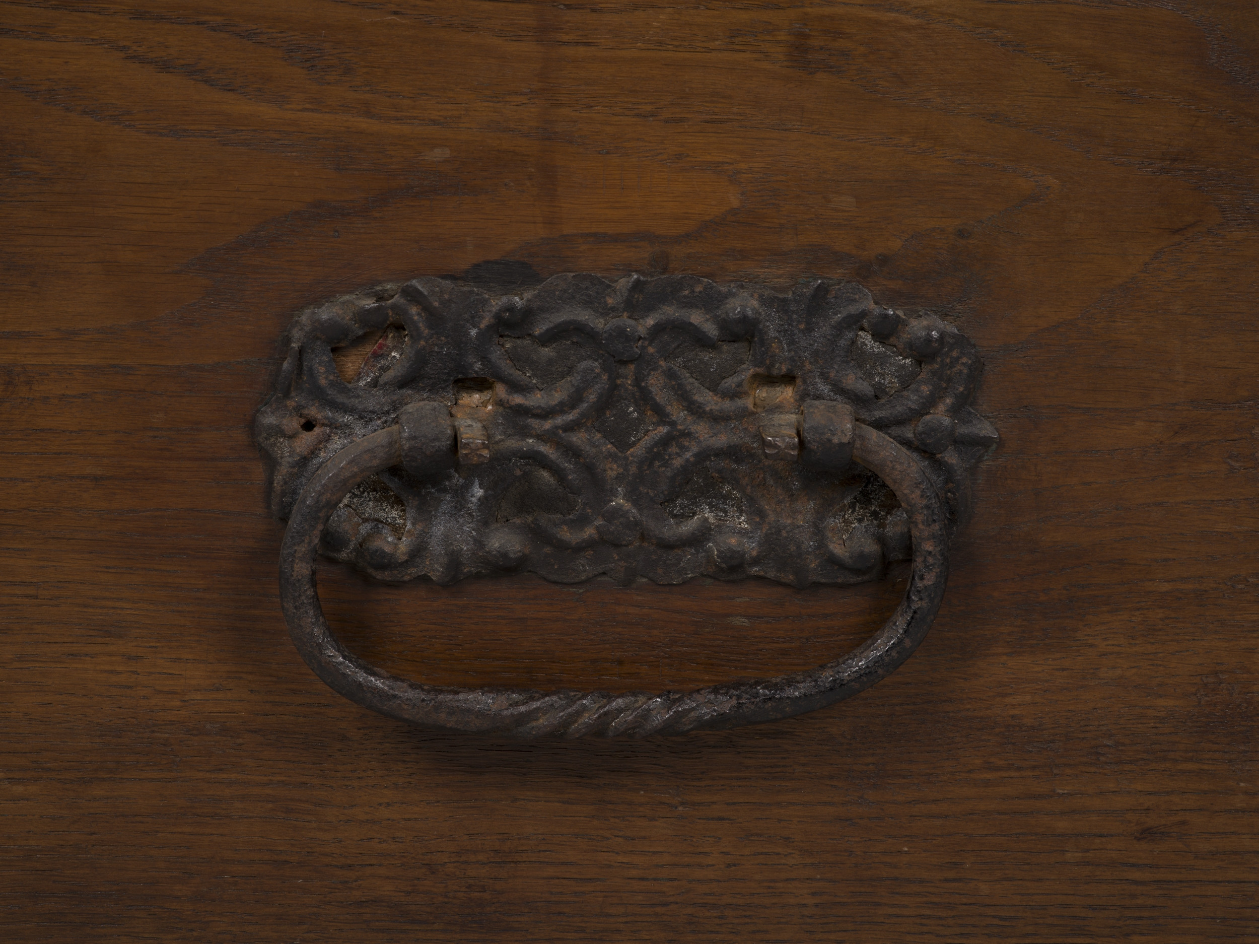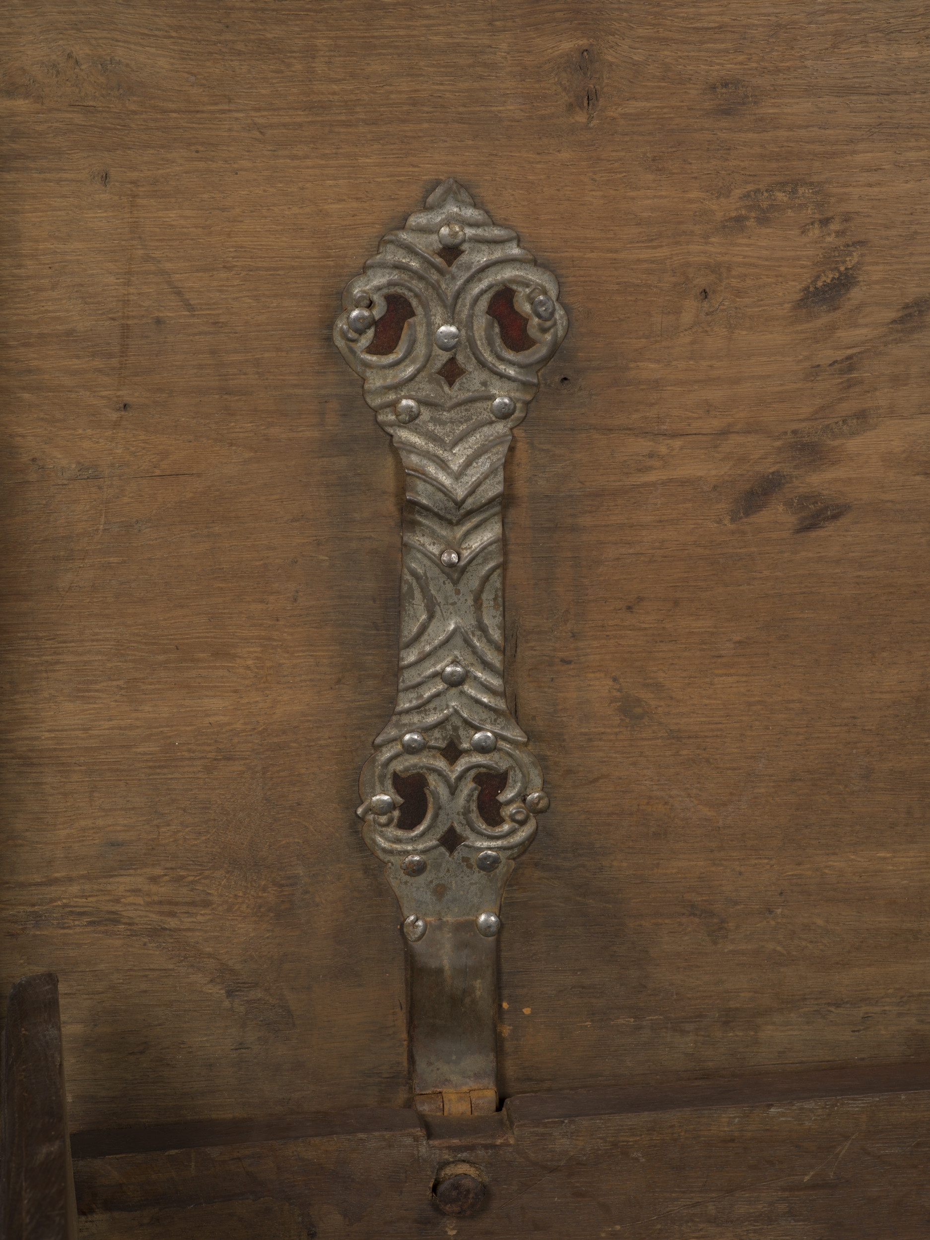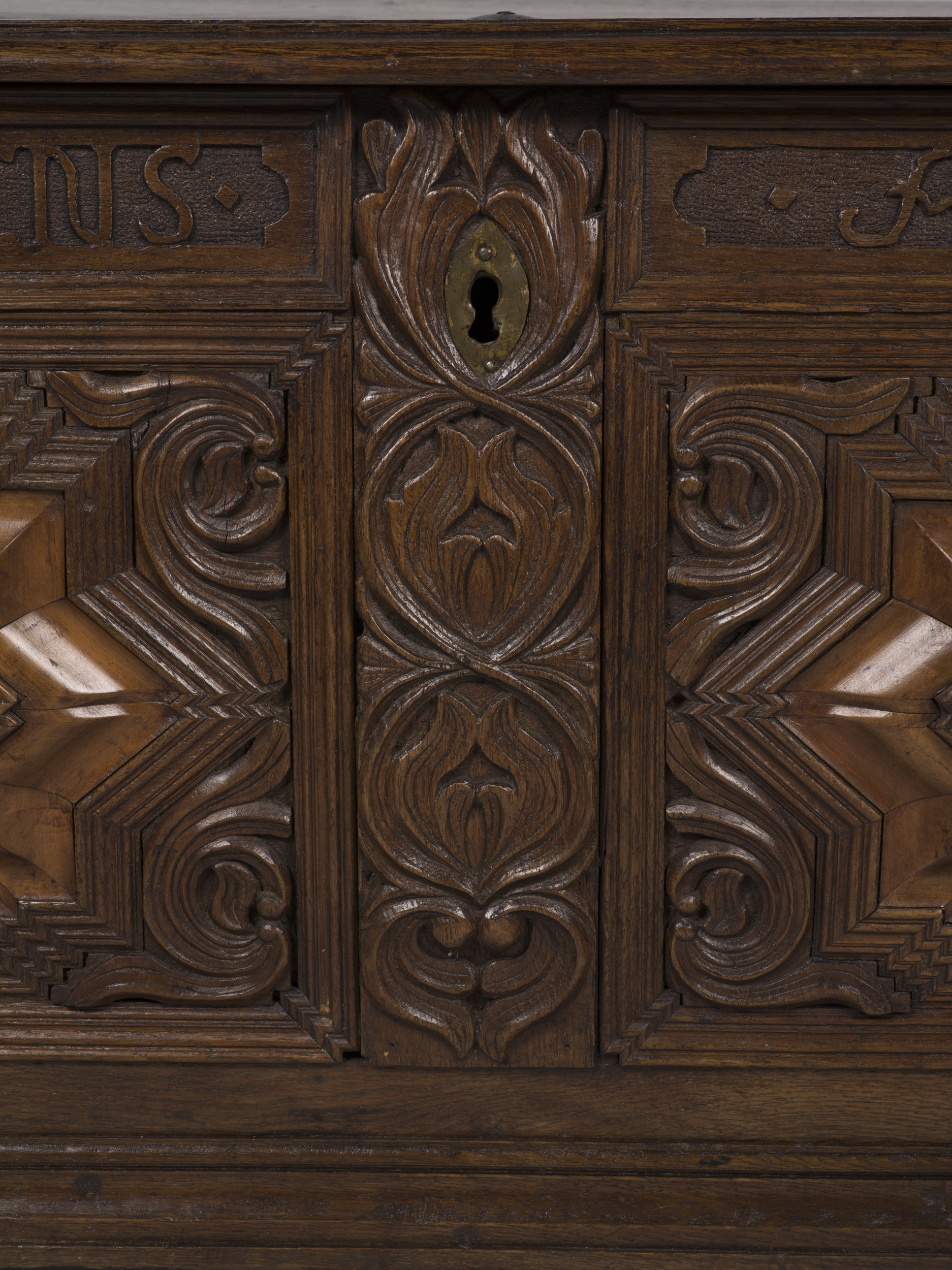 Opisywaną skrzynię nie wyróżnia prosta, solidna konstrukcja lecz dekoracja, będąca kompilacją motywów czerpanych z różnych nurtów estetycznych o klasycznej formie sarkofagu nawiązuje do uproszczonej wersji włoskiej cassone z prostymi ściankami skromniejszymi gzymsami i nogami w kształcie spłaszczonych kul zamiast lwich łap. Dwudzielny podział kompozycji rzeźbiarskiej ścianki fasadowej na dwie części wprowadziły trzy pionowe pasy dekoracji (boczne i środkowa) złożone z dużych zwoi liści noszących jeszcze w sobie piętno gotyku. Dwa poziome pola wypełniają barokowe kaboszony utworzone z łamanego, uskokowego gzymsu. Punkty centralne kaboszonów dodatkowo ozdobiono inkrustacją białą kością i hebanem przedstawiającą prostą formy róży wiatrów. Ponad dekoracyjnymi płycinami wyrzeźbiony napis rozdzielony zamkiem: z lewej strony ˚ J ˚ ANNA˚ TIESSENS˚, z prawej ˚ ANNO ˚ 1798˚.