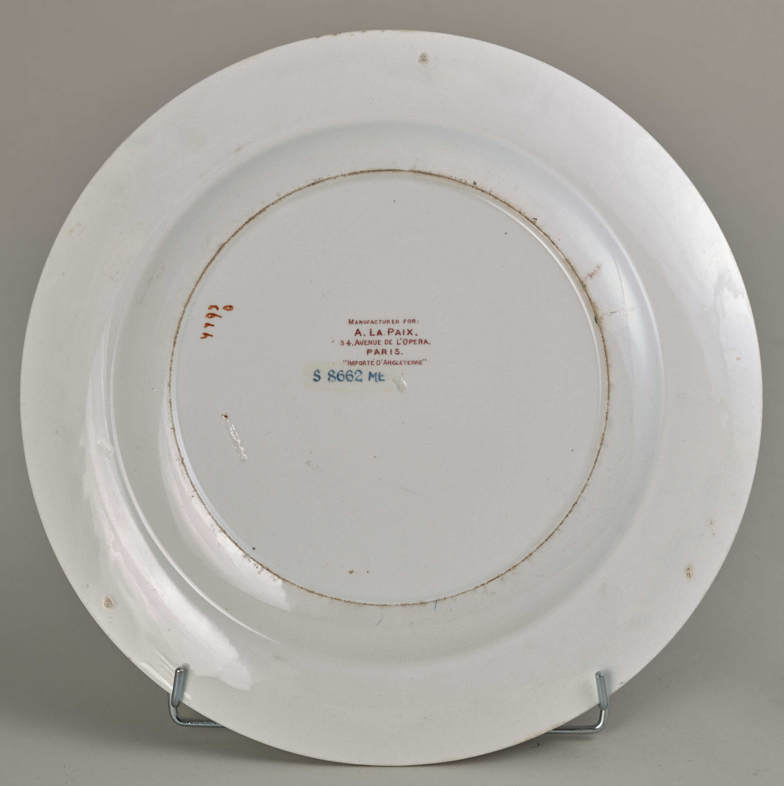 Talerz płytki z dekoracją chinizującą Talerz płytki, fajansowy o lekko kremowym odcieniu, pokryty siatką ozdobnych spękań szkliwa, zdobiony dekoracją malarską w typie dalekowschodnim o motywach roślinno – geometrycznych, a skoncentrowaną w partii kołnierza. Szczegółowy rysunek wzoru dekoracji naniesiony drukiem w kolorze purpurowym, następnie już na szkliwie- ręcznie podmalowany farbami w kilku kolorach: rdzawa czerwień, ciemnoniebieski, zielony, piaskowo-beżowy. Natomiast w mniejszości użyto farb w kolorach: jasnoniebieskim, stalowozielonym, seledynowym i żółtym. Na dekorację tę składa się pas ornamentu geometrycznego z motywem rombów, biegnący tuż pod krawędzią wrębu, następnie cztery duże kompozycje kwiatowo-roślinne, a jedno z nich z motywem połamanego krzewu, rozmieszczone na kołnierzu, blisko pasa ornamentu. Kompozycje te rozdzielone są liściastymi półrozetami. Złoto znajduje się jedynie w pasku lamującym brzeg kołnierza i drobnych elementach trzech kwiatów w dużych kompozycjach. Odwrocie talerza pokryte jest pod szkliwem szarymi plamkami. Widoczne oznakowania: w centralnym punkcie litera „B”, sygnatura fabryki „BOOTHS” – obydwa znaki stemplowane w masie i duża pieczęć drukowana podszkliwnie w kolorze bordowym: „MANUFACTURED FOR:/A.LA.PAIX,/34.AVENUE DE L’OPERA, /PARIS./IMPORTE D’ANGLETERRE”. Pod nią napis z aktualnym nr inwen. Anglia, Hanley, XIX w.