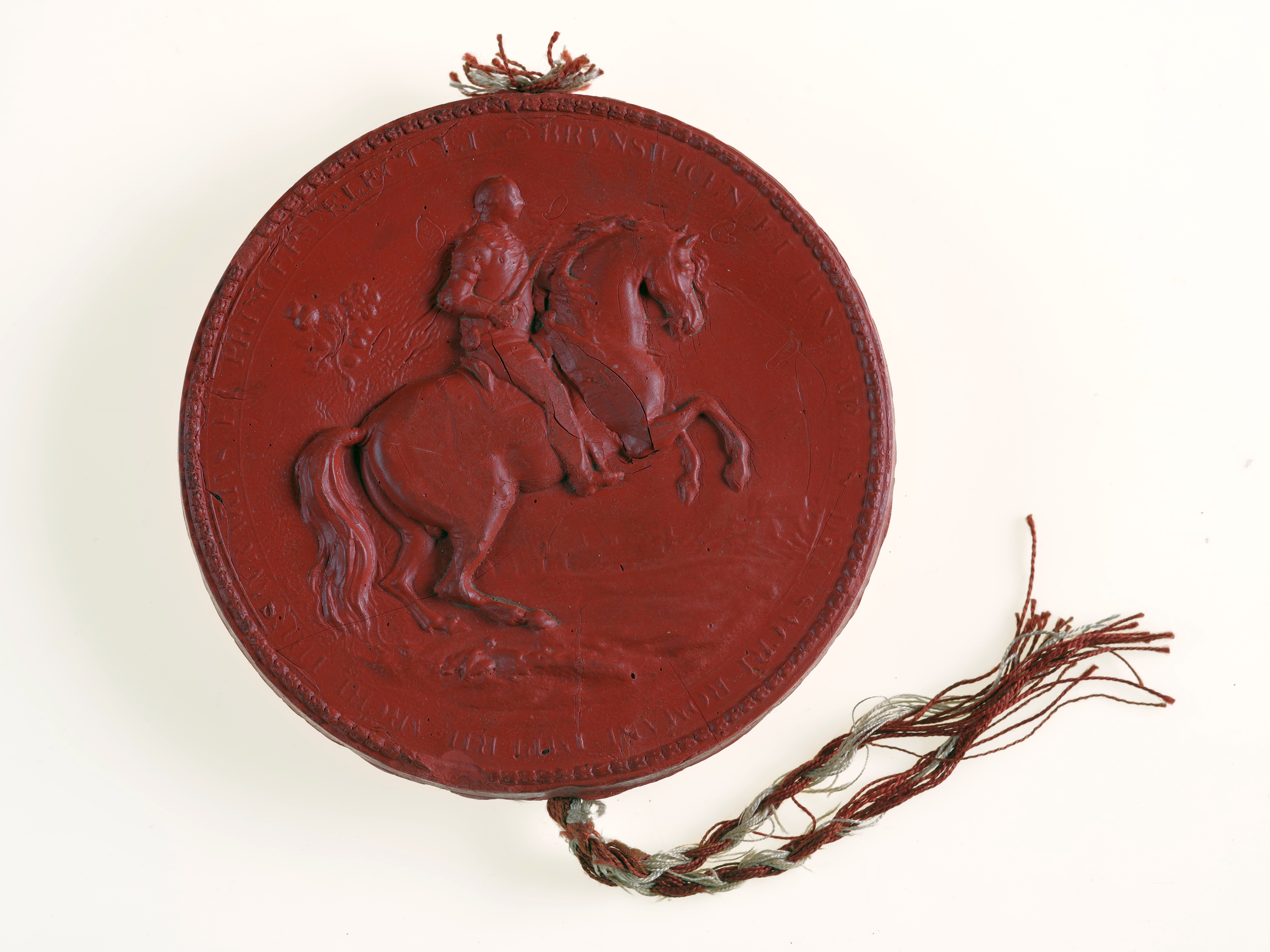 Tradycja przedstawiania w polu pieczęci jadącego konno władcy Anglii sięga średniowiecza. W XIV w. króla ukazywano jako galopującego rycerza z mieczem wzniesionym do ciosu, w XVI w. była to postać jadąca konno na polowanie lub w czasie podróży. Od XVII w. władcę zaczęto przedstawiać na wspiętym koniu, z przednimi kopytami uniesionymi w górze. Król odziany jest w zbroję, ale nie ma hełmu, co pozwala nadać jego postaci rys podobieństwa. W ręku trzyma miecz. Wizerunek wzbogacony został o szczegóły krajobrazu: zaznaczona jest linia horyzontu, na której w oddali majaczą zabudowania zamku i miasta. W otoku zamieszczono dalszą część tytulatury władcy, której początek znajduje się po drugiej stronie pieczęci.