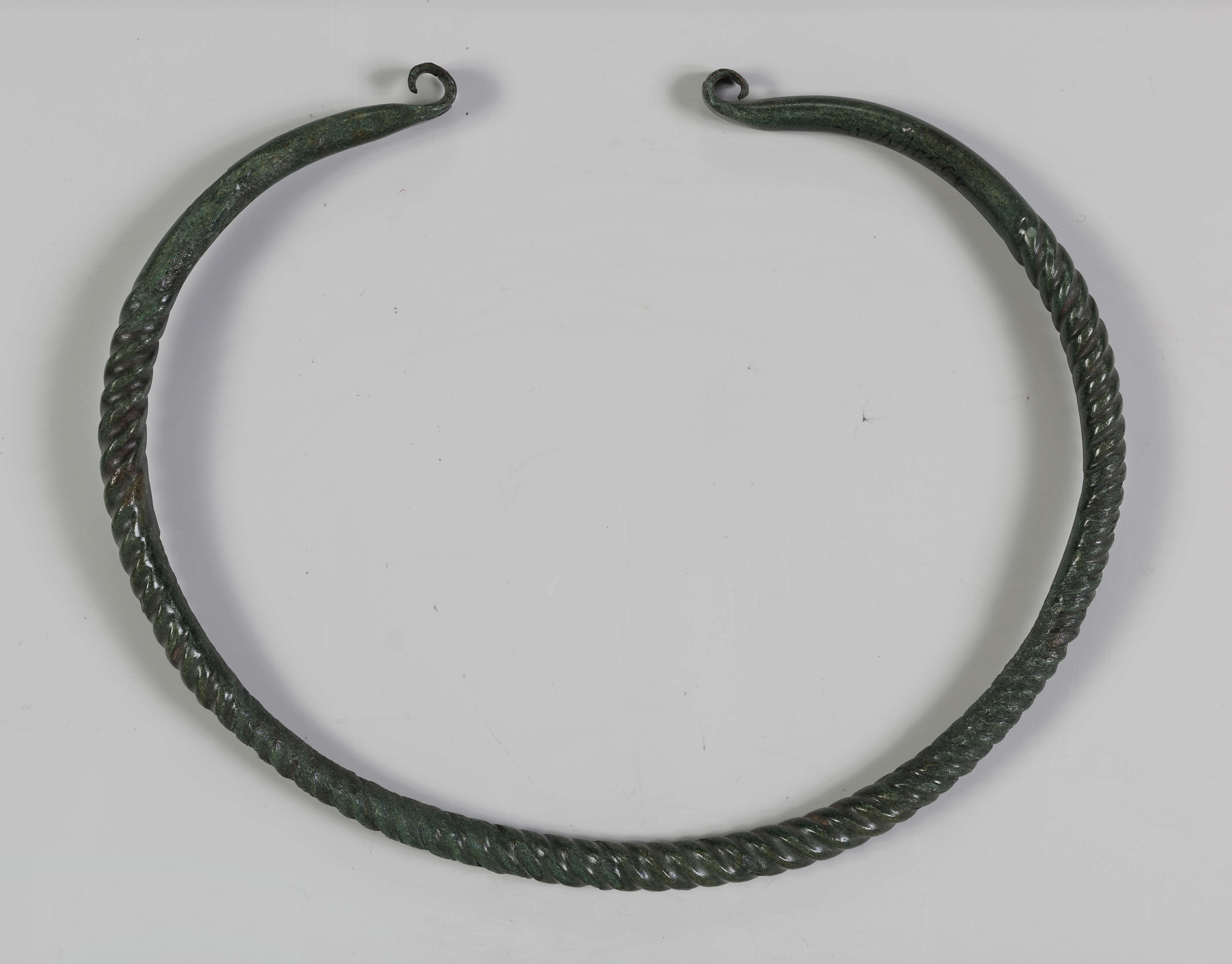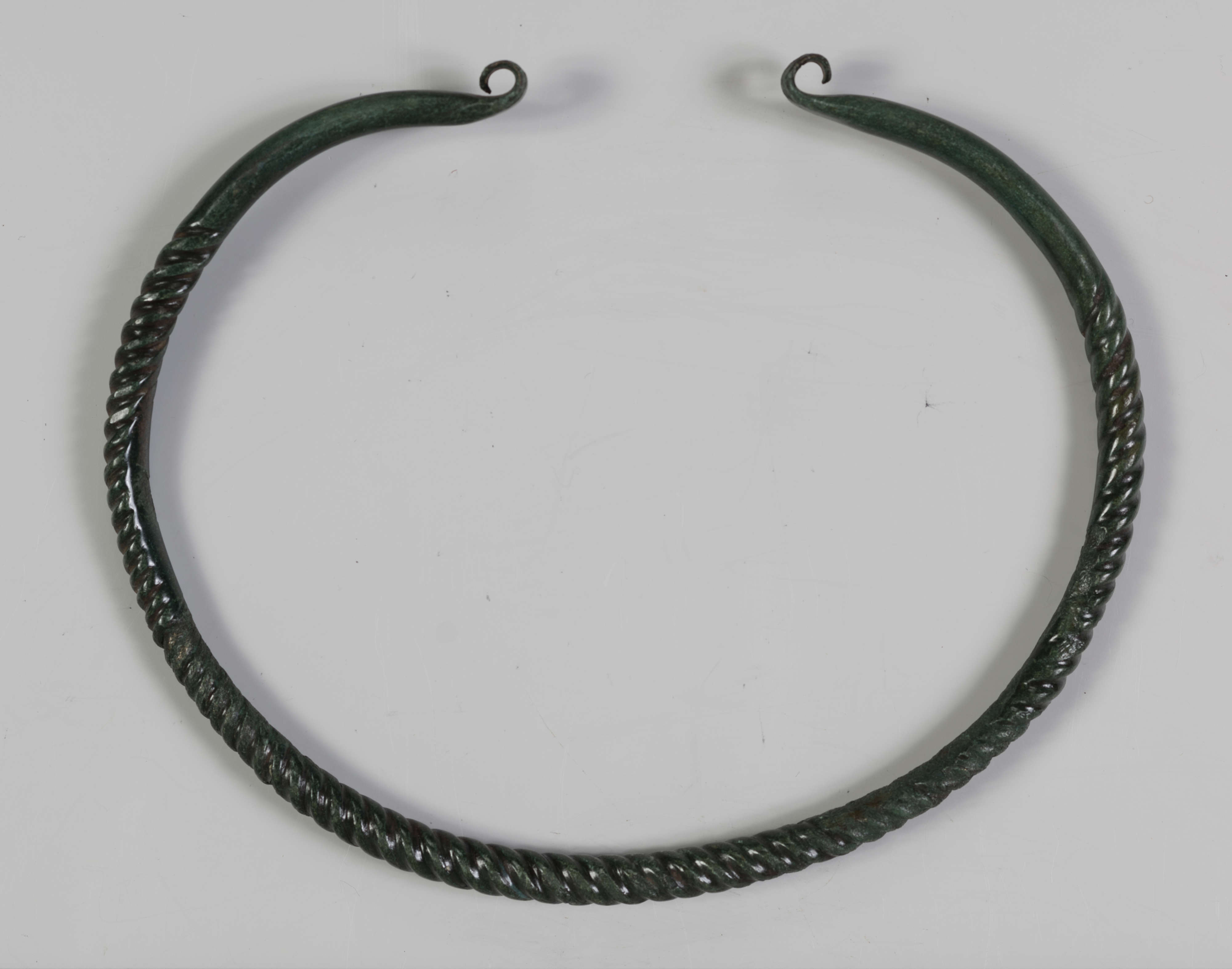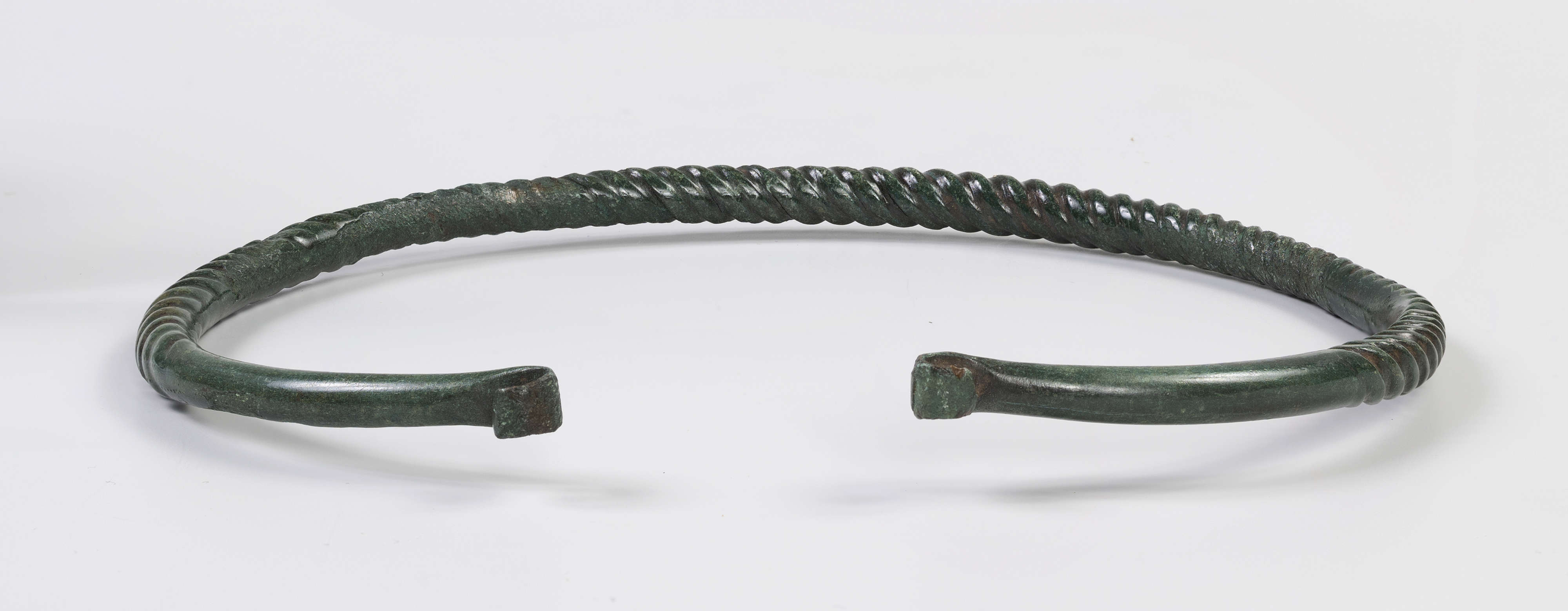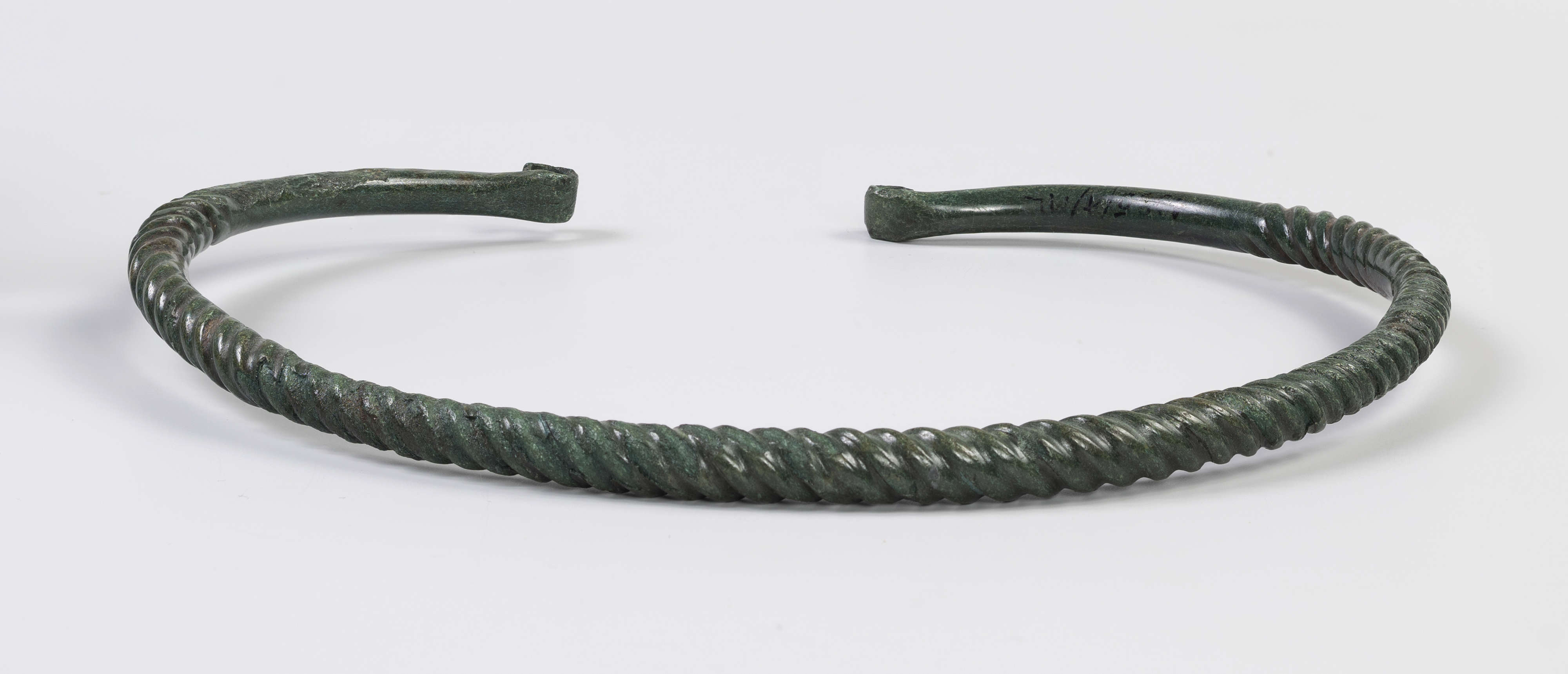 Naszyjnik jest wykonany z brązowego pręta, którego 2/3 poddano tordowaniu (więcej o tej technice patrz: 1396/A/ML/4). Materiał skręcono wielokrotnie, co odzwierciedla się w gęstym i równym wzorze. Widoczne są też ślady spękania, które musiały powstać podczas zbyt intensywnego skręcania. Zauważyć też można znaki prawdopodobnie po unieruchomieniu pręta w imadle – trzy wgłębienia na powierzchni lewego końca naszyjnika.