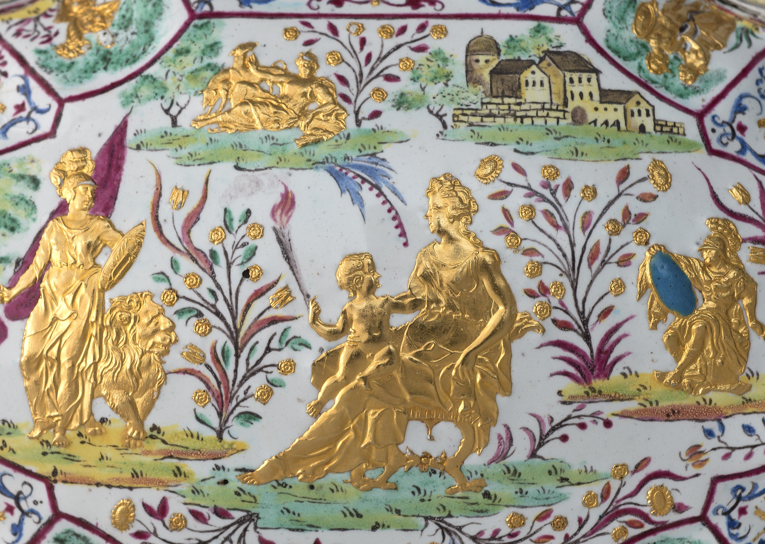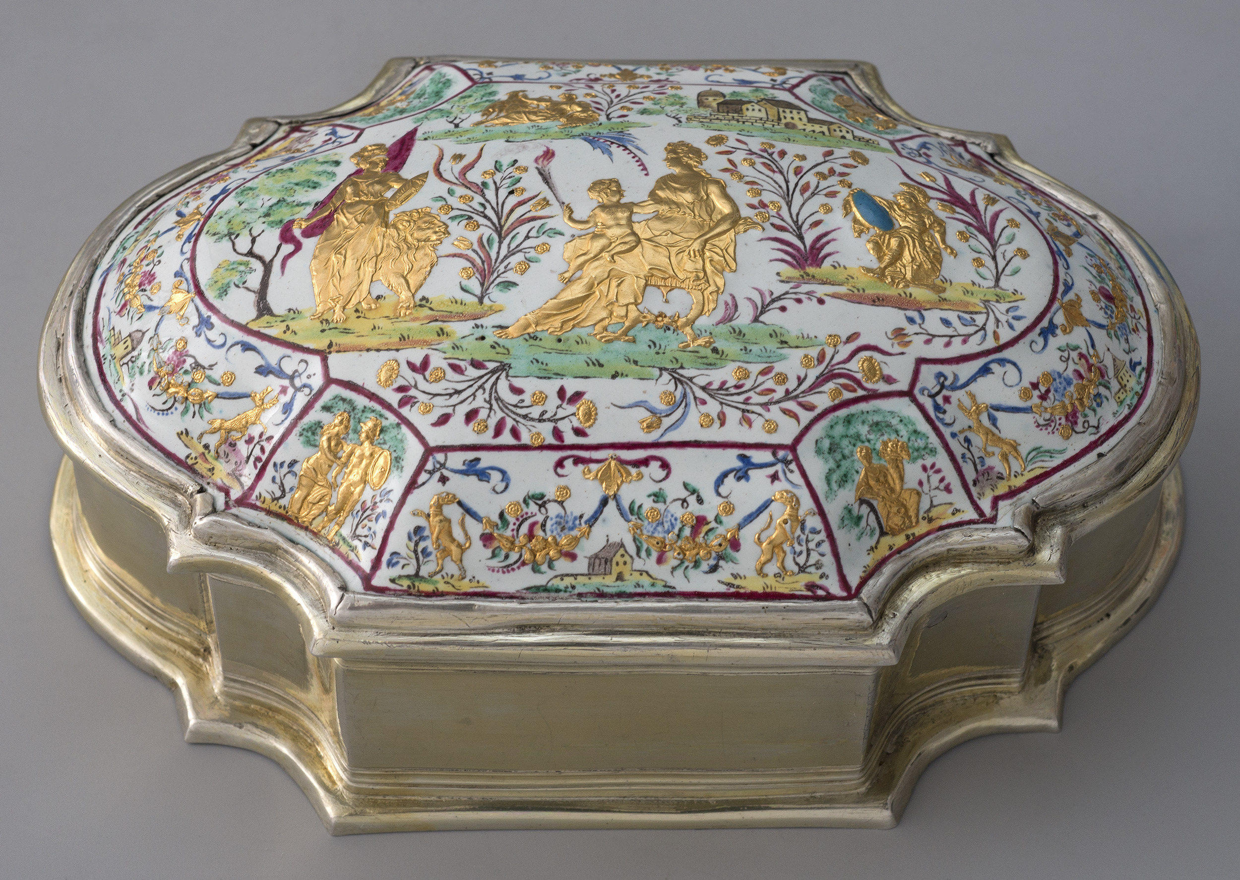 Szkatułka powtarza kształt pozostałych kasetek z kompletu. Pokrywka jest lekko wypukła i pokryta całkowicie emalią malarską. Na białej powierzchni pokrywy namalowano imaginowany pejzaż z zabudowaniami, który stał się tłem dla czterech złotych nakładek z przedstawieniami bogiń: dwukrotnie Ateny, Wenus z Amorem oraz Diany z psem. Skośne brzegi pokrywy zdobią nałożone na powierzchnię emalii misternie cyzelowane złote nakładki z postaciami bóstw z ich atrybutami oraz girlandki i zwierzęta.