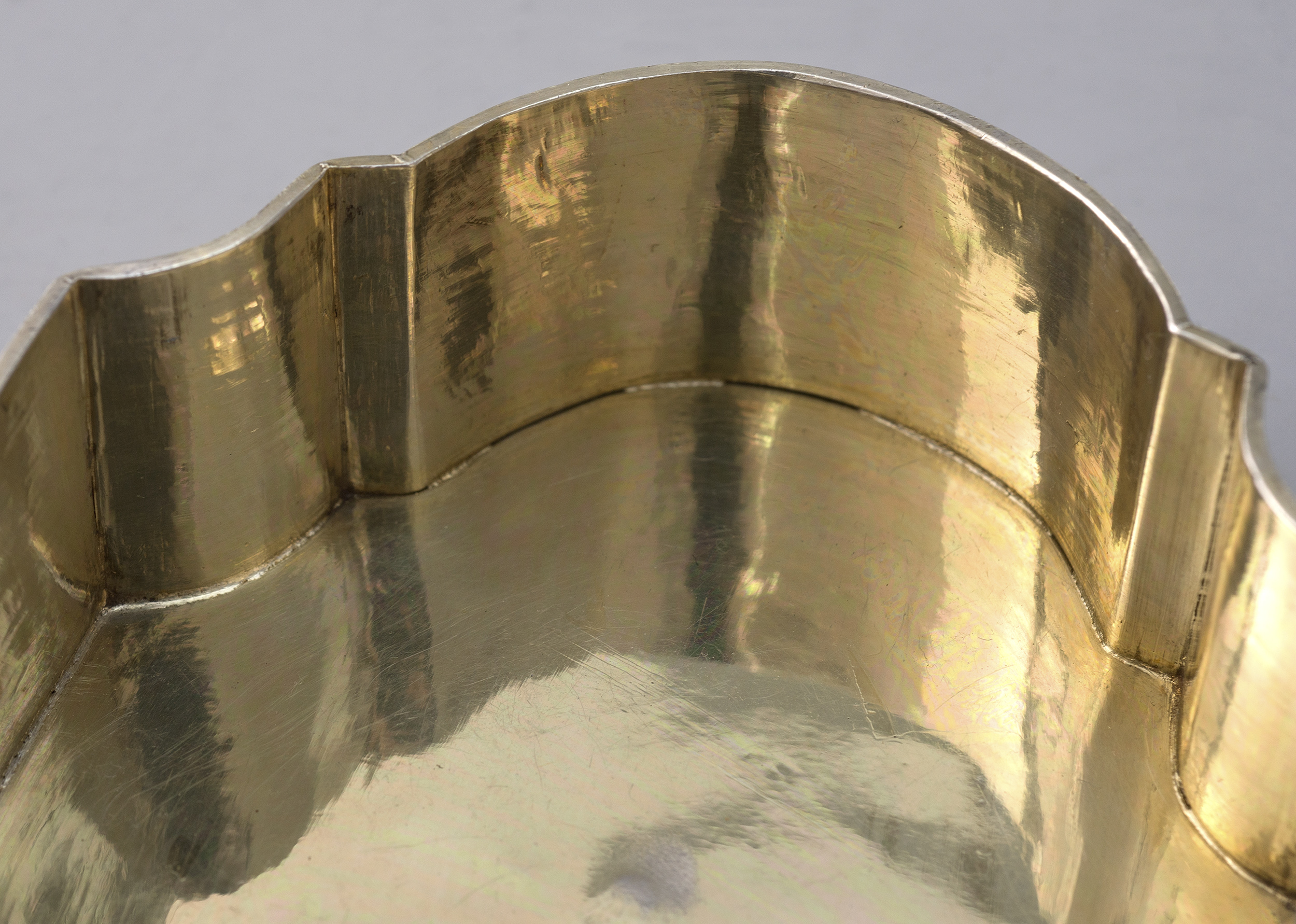 Prostokątna szkatułka od pary należy do dziesięcioelementowego kompletu toaletowego zawierającego ponadto parę lichtarzy jednoświecowych, dwie pary różnej wielkości szkatułek, dwie tabakierki w kształcie muszli, oprawę do szczotki (Wil.510-Wil.519).