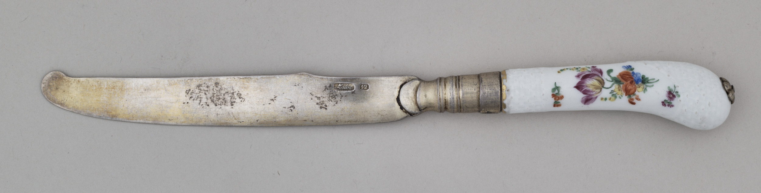 Nóż obiadowy z płaskim ostrzem zakończonym półokrągło. Z drugiej strony ostrze zakończone, z tulejką i połączone z porcelanowym trzonkiem. Trzonek wygięty, w kształcie stylizowanej litery „S”, wykonany z białej porcelany, ozdobiony plastycznie przy obu końcach szachownicą. Po obu stronach ręcznie malowany w wielobarwne kwiaty. Na awersie pomarańczowo-bordowy mak, bordowe róże polne i niebieska cykoria oraz gałązka niezapominajek. Na rewersie bordowo – żółty tulipan, pomarańczowa miechunka, niebieska ostróżka. Na zakończeniu trzonka nakładany złocony kwiatek. Na ostrzu wybite dwa znaki: „Malcz” i „12” oznaczające wytwórnię i próbę srebra.
