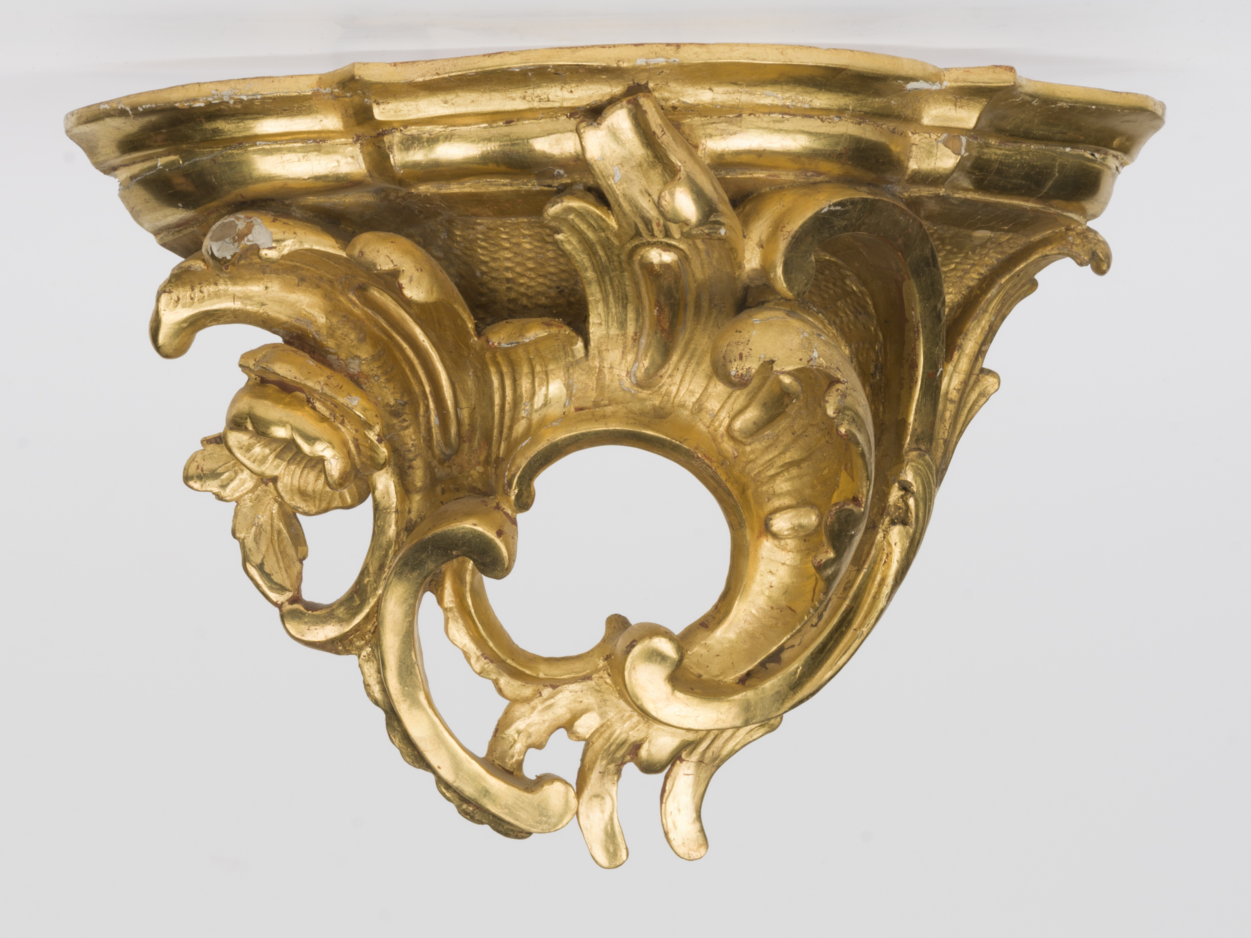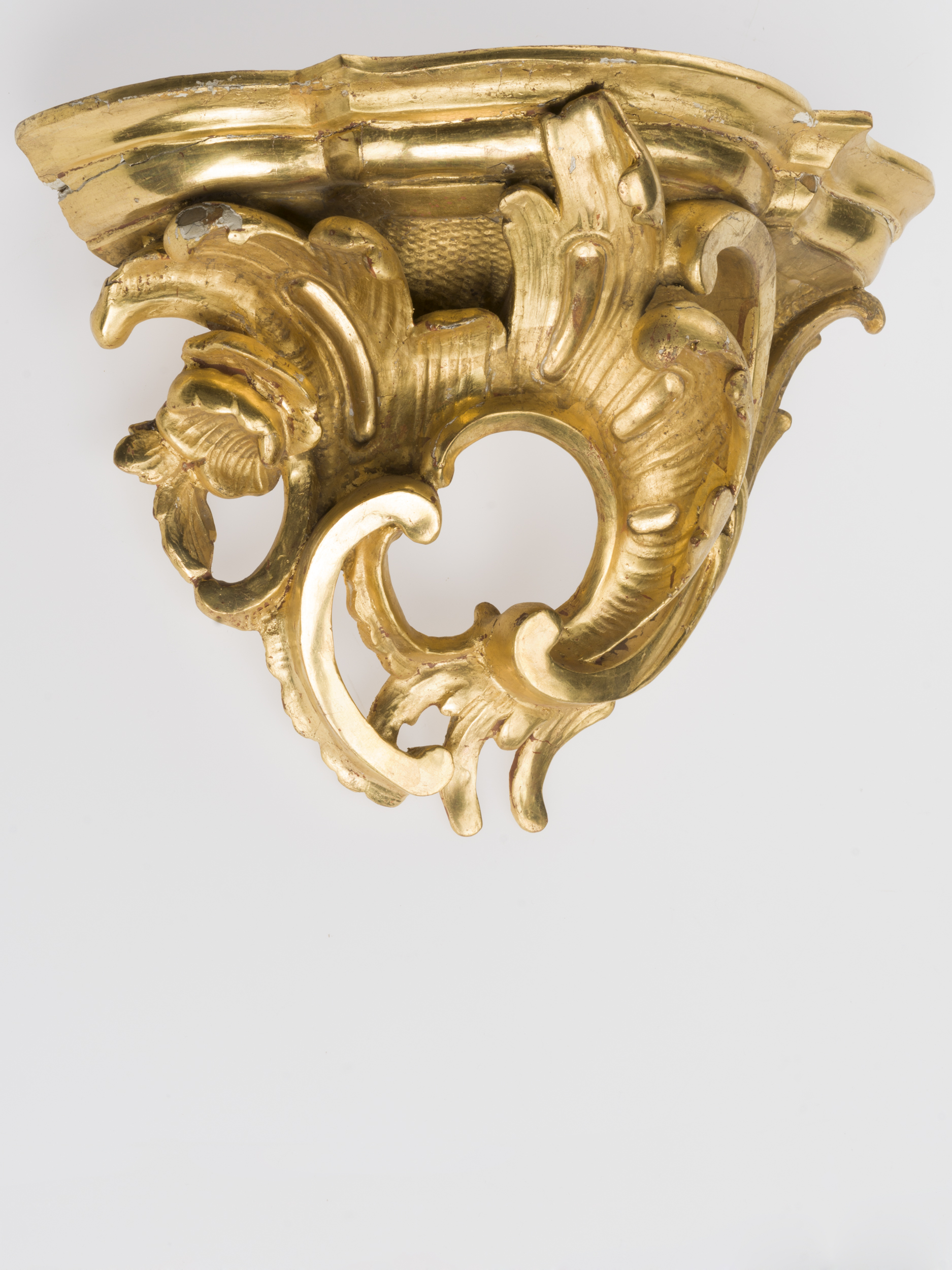 Niewielka konsolka ścienna, w formie rozbudowanej kompozycji z motywem rocaille. Część wspornikowa u góry szersza, zwęża się ku dołowi dając zarys odwróconej piramidy. Składa się z giętkich, mocno ażurowych form, w większości o kształcie ceownicy, tworzących pojedynczy tzw. koguci grzebień. Przy lewej krawędzi umieszczony został pojedynczy wielopłatkowy kwiatek. Całość podtrzymuje blacik o nieregularnym zarysie i podwójnie wklęsło fazowanej krawędzi.
