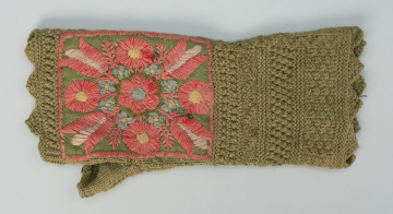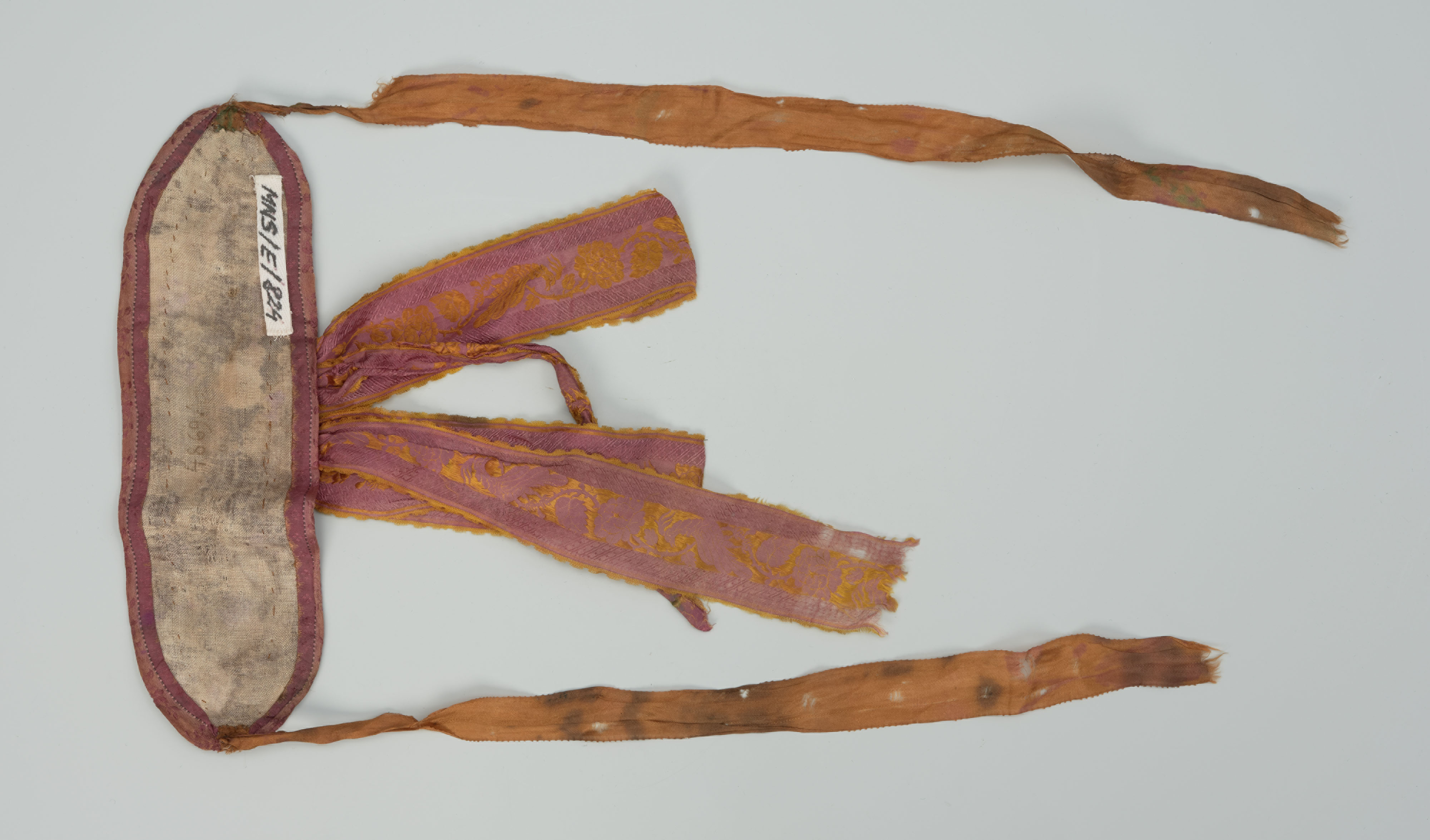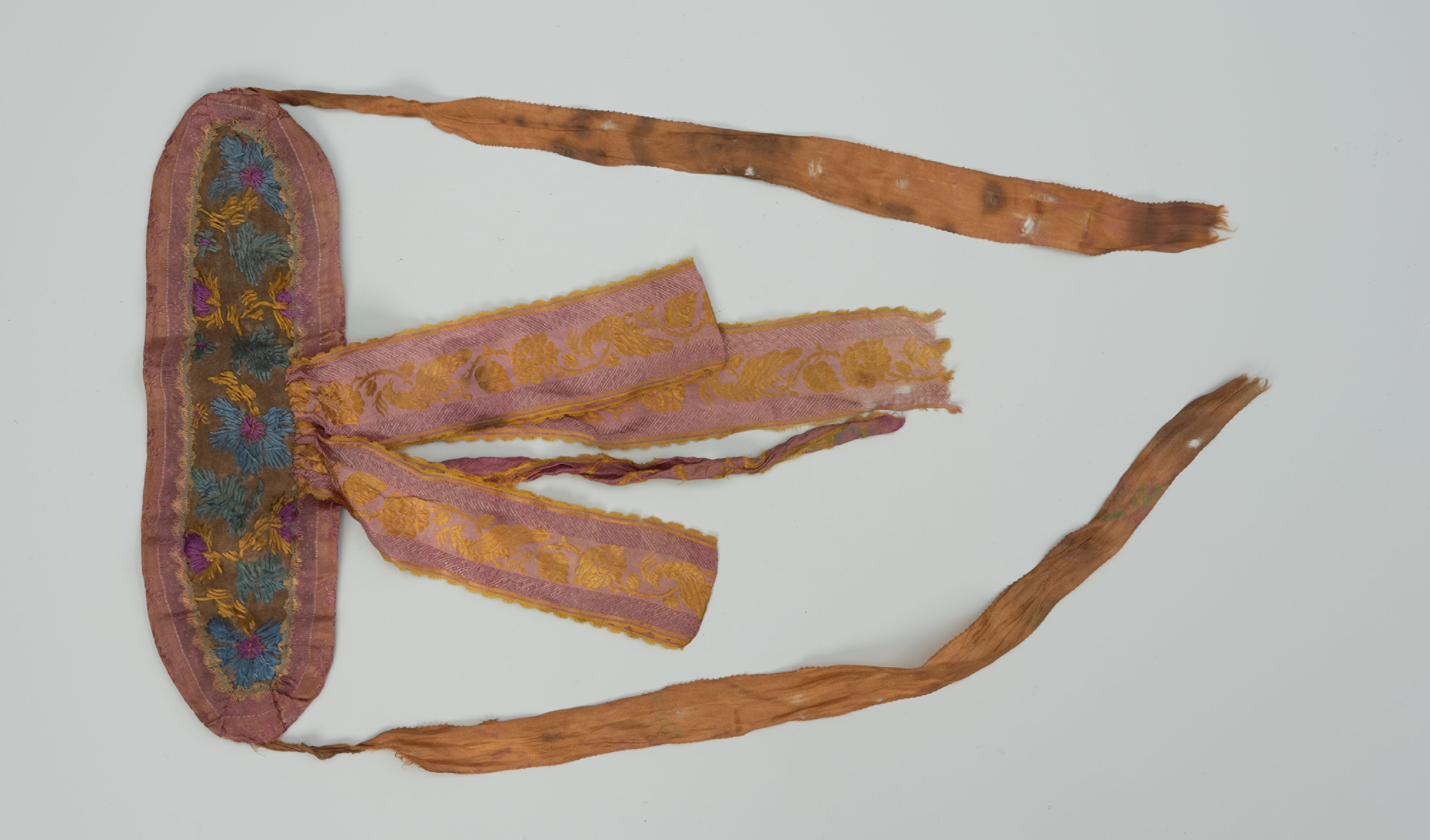 haft płaski kładziony, płótno lniane, wstążka jedwabna, aksamit