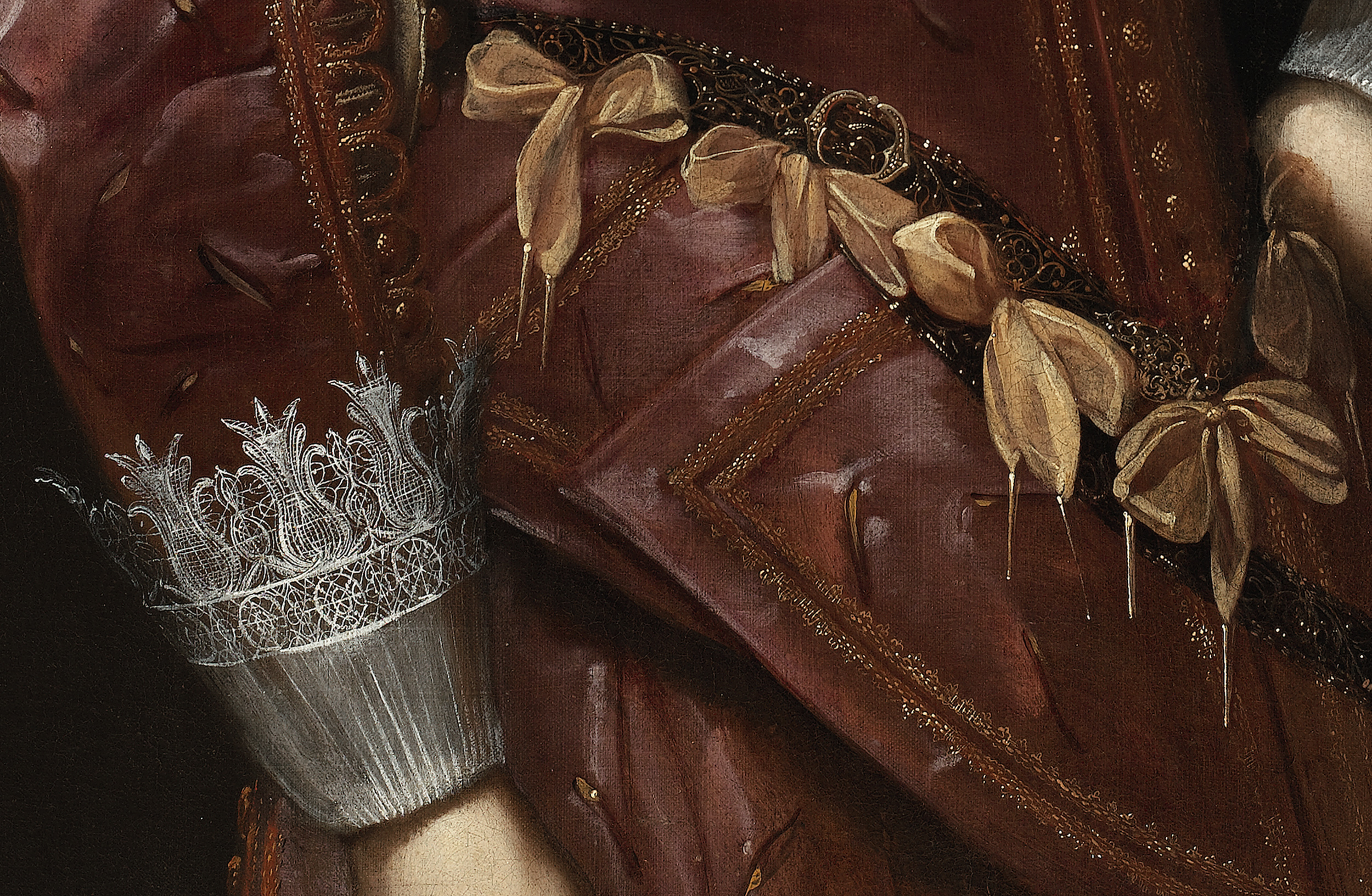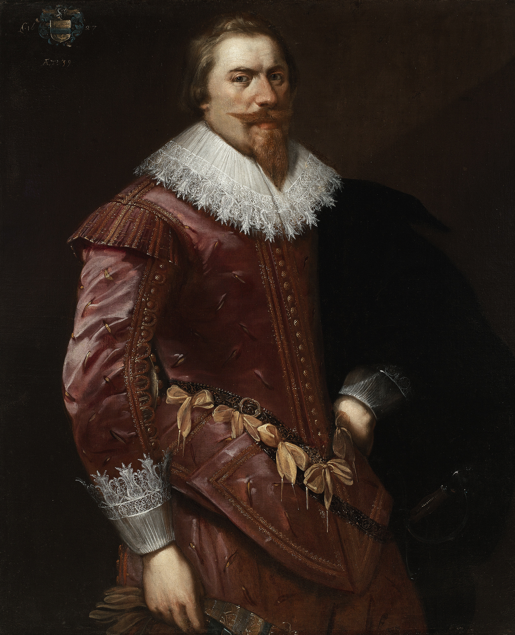 Ukazany w półpostaci mężczyzna nosił się modnie i bogato. Na jego ciemnoróżowy jedwabny strój składa się: zapięty na drobne guziki wams z wydłużonym przodem, z baskinką, żółtymi kokardkami w pasie, z rękawami przybranymi falbaną; oraz marszczone pludry. Wykończenie przy szyi stanowi koronkowy marszczony kołnierz, w podobny sposób ozdobione są mankiety. Przerzucony przez lewe ramię płaszcz odkrywa jedynie część szpady, a w swobodnie opuszczonej prawej ręce portretowany trzyma rękawiczki – wyznacznik wysokiego statusu materialnego i społecznego. Twarz dojrzałego mężczyzny zdobią sumiaste podkręcone wąsy i szpiczasta bródka, zaczesane do góry włosy odsłaniają czoło. Wyważenie między ilością odmalowanych detali, pozą w klasycznym ujęciu eleganta, czy nawet ciemnym tłem wymagały od autora nie tylko zacięcia dokumentalisty, ale i wyczucia dobrego smaku. Szczegóły kostiumologiczne oddane zostały z precyzją tak duża, iż portret może stanowić doskonałą ilustrację mody męskiej XVII-wiecznej Flandrii.