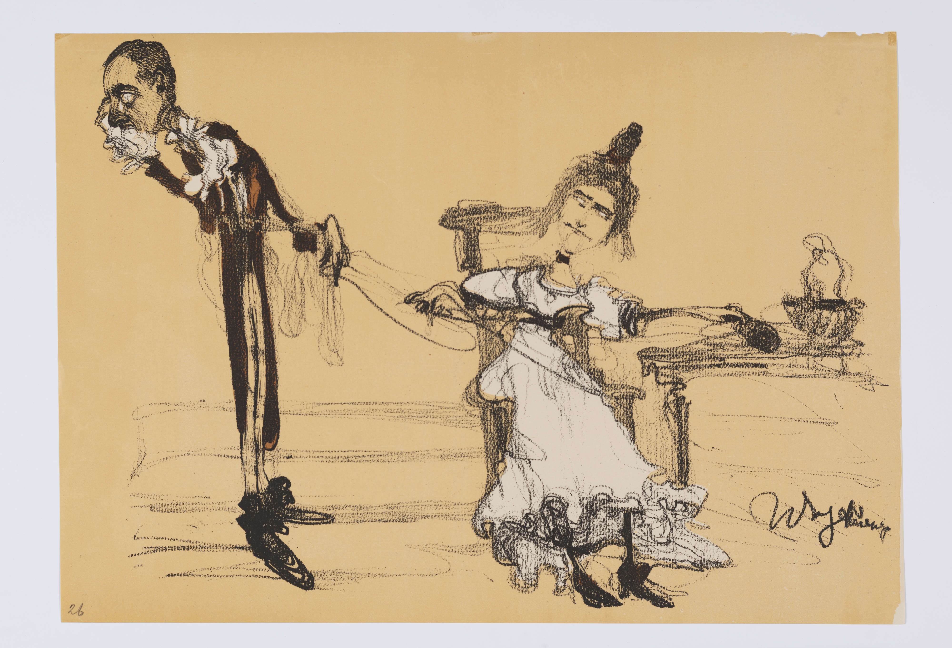 W scenie ujętej satyrycznie, przedstawiającej siedzącą przy stole Klarę i ocierającego łzy Albina, Wojtkiewicz posługuje się charakterystyczną dla karykatury groteską i przerysowaniem, widocznym zwłaszcza w postaci mężczyzny. Zastygłe w swoich pozach, bliskie marionetkom postaci zostały nakreślone typową dla artysty pełną ekspresji, miękką, płynną linią. Wojtkiewicz, należący do najoryginalniejszych artystów Młodej Polski, pierwsze karykatury publikował na łamach „Liberum Veto”, „Chochoła”, „Kuriera Warszawskiego”, „Wędrowca”. Jako karykaturzysta współpracował z kabaretem „Zielony Balonik”, tworząc między innymi zaproszenia na odbywające się w Jamie Michalika spektakle kabaretowe.