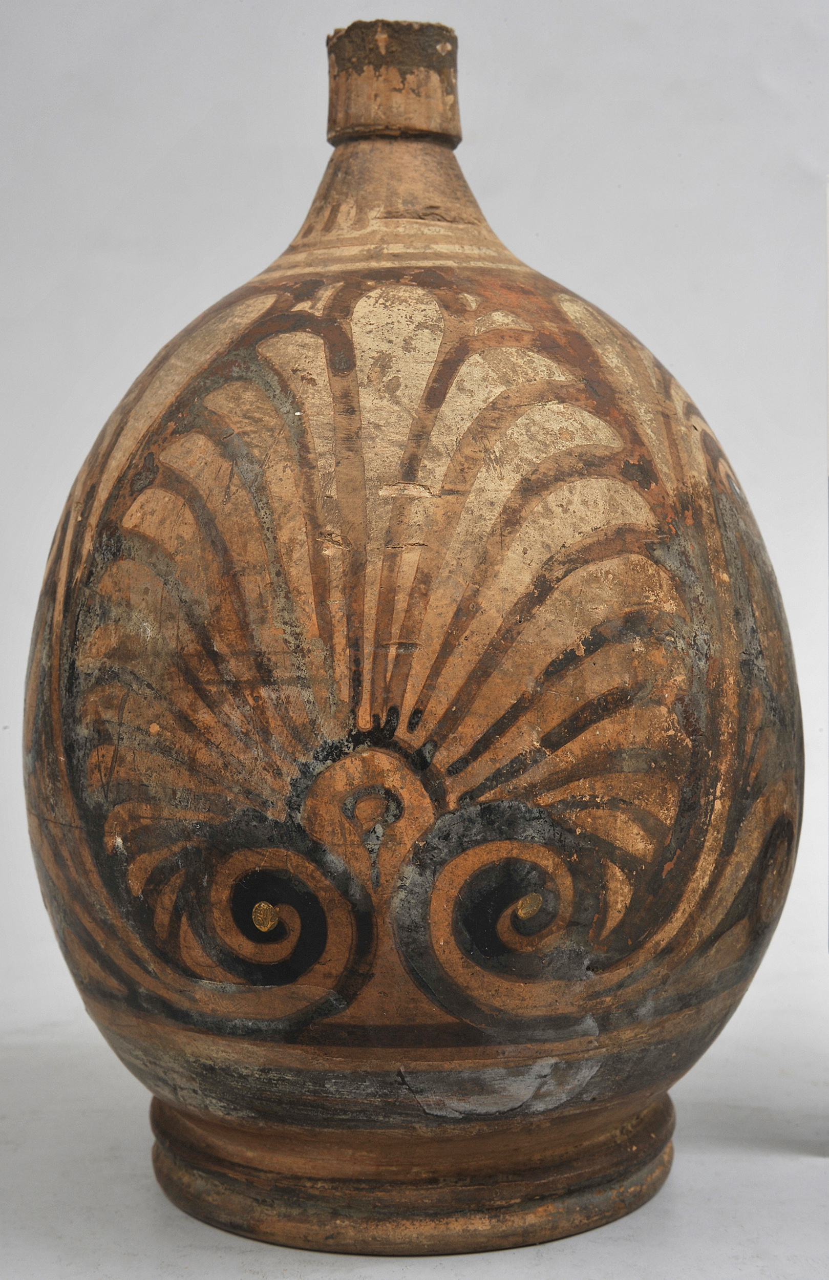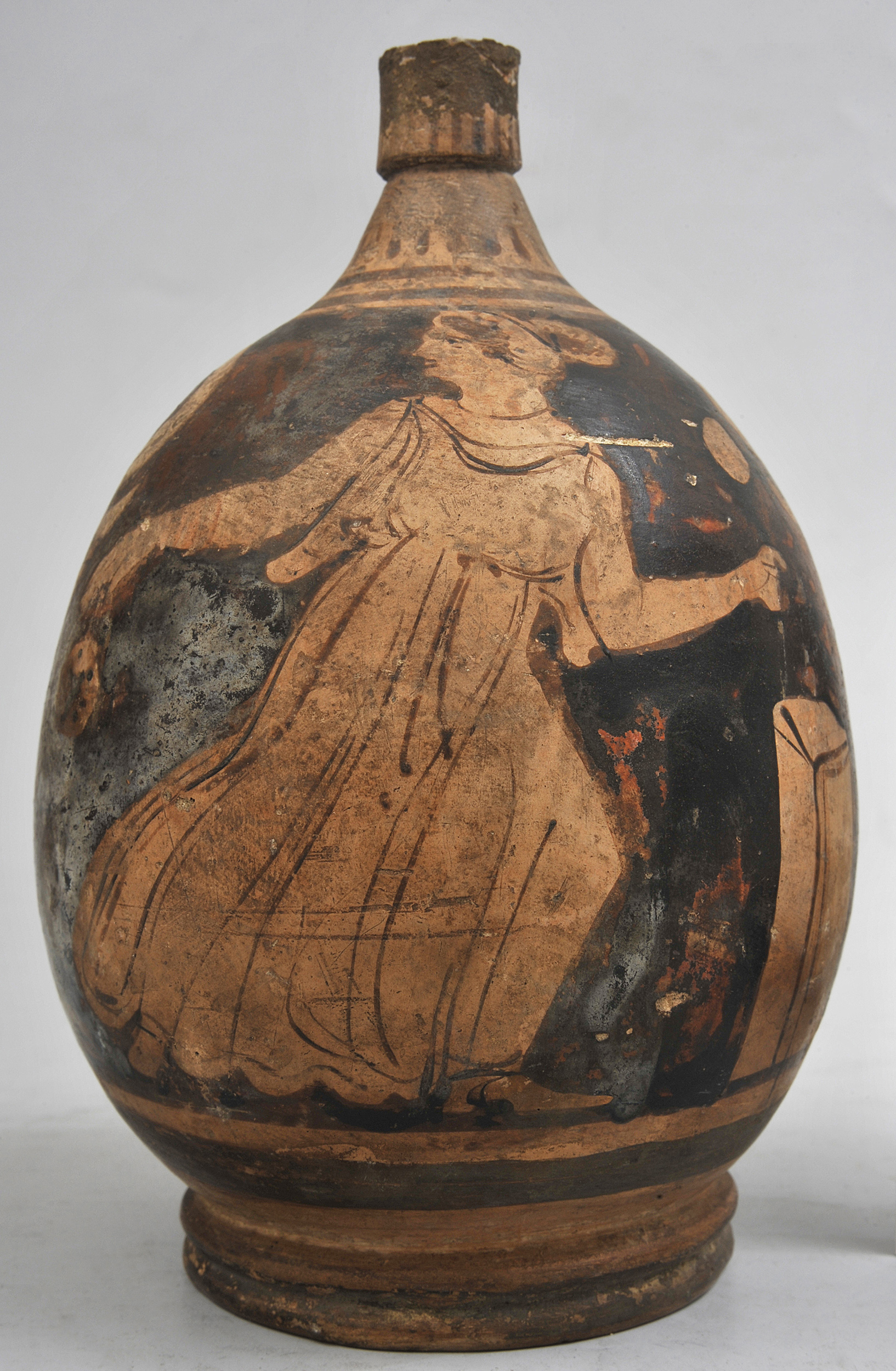 Lekytami nazywa się w ceramice Starożytnej Grecji naczynia, które przypominają dzban, są jednak dużo bardziej wysmukłe, mają walcowaty brzusiec, wąską szyjkę i szeroki wylew. Zabytek wilanowski należy do grupy tzw. lekytów aryballosowych, których kształt jest bardziej przysadzisty, a brzusiec kulisty. Naczynie wilanowskie nie zachowało się do naszych czasów w całości – brakuje mu górnej części szyjki oraz wylewu. Nie możemy wobec tego podziwiać kształtu charakterystycznego dla lekytów, jednak dekoracja wykonana w technice czerwonofigurowej jest wciąż czytelna. W środkowej części brzuśca namalowano kobietę, która zdaje się biec w prawą stronę. Uczesana jest w kok i ubrana w długi, przepasany w talii i spięty na ramionach chiton. Po przeciwnej stronie, pod uchwytem, dekorację uzupełniono o palmetę i wici roślinne, bardzo często pojawiające się motywy w ceramice Starożytnej Grecji.
