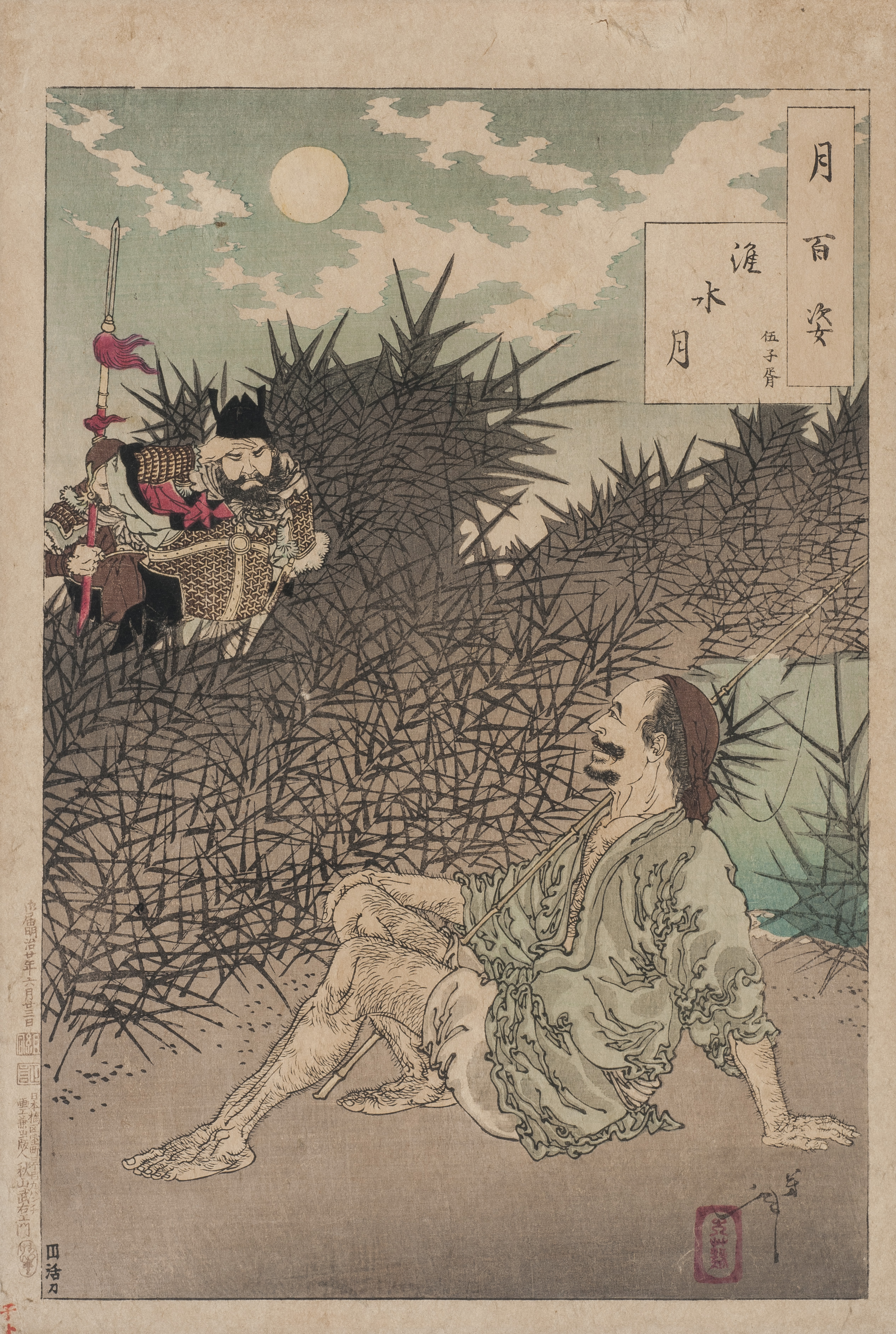 Ta rycina pochodzi z Tsuki hyakushi (Sto widoków księżyca), zbioru 100 drzeworytów nishiki-e (wielobarwnych) w formacie ōban (ok. 25 x 38 cm) autorstwa Tsukioka Yoshitoshi (1839-1892). Ryciny były publikowane partiami przez Akiyamę Buemona w latach 1885-1892. Przedstawiają księżyc towarzyszący ilustracji japońskich i chińskich anegdot, wydarzeń historycznych i mitologii oraz scen z teatru kabuki i nō, a nawet współczesnego Tokio. Wszystkie drzeworyty z cyklu łączy obecność księżyca na każdej z rycin. Autor mistrzowsko stworzył nastrój przy pomocy księżyca i jego poetyckich czy ekspresyjnych możliwości.
