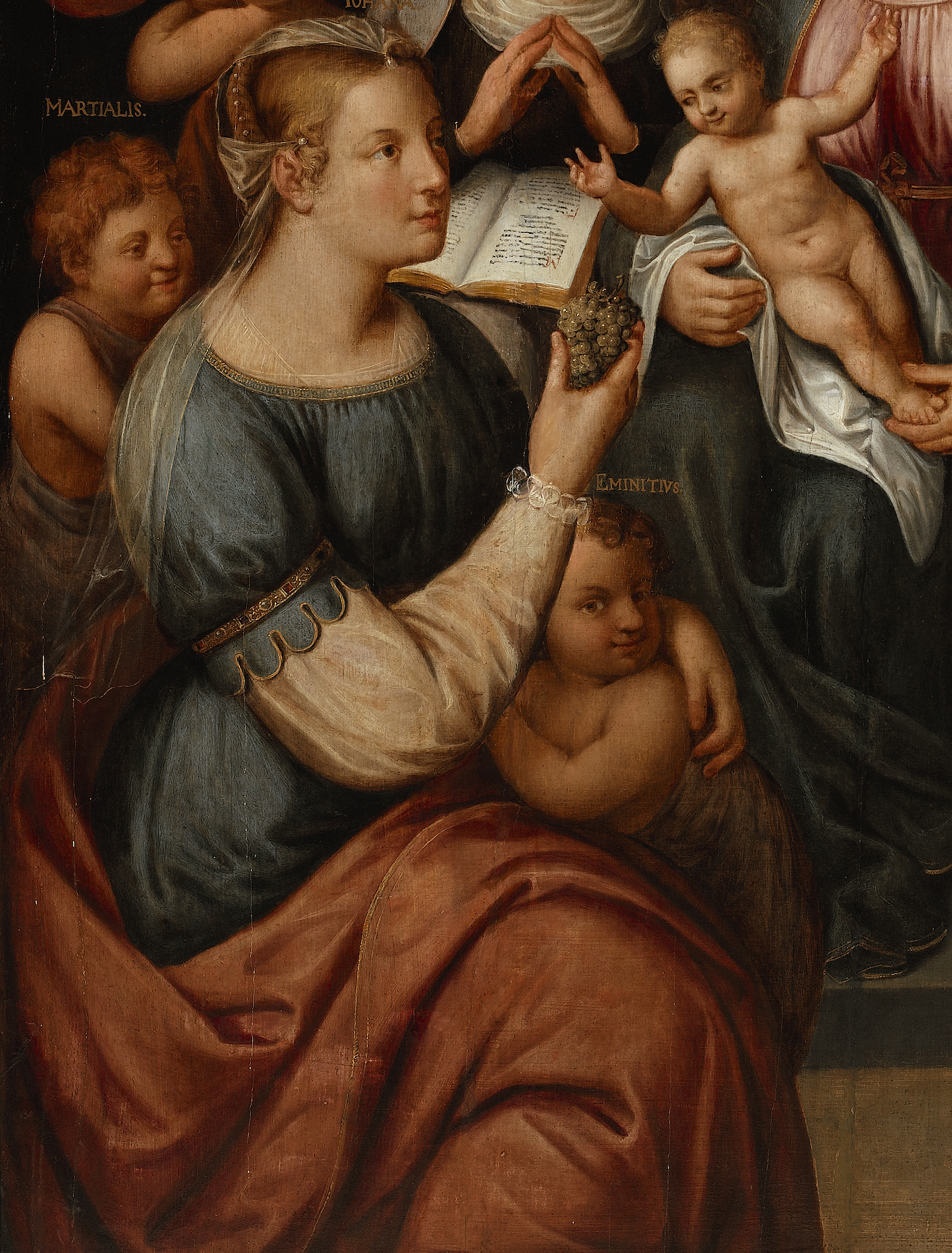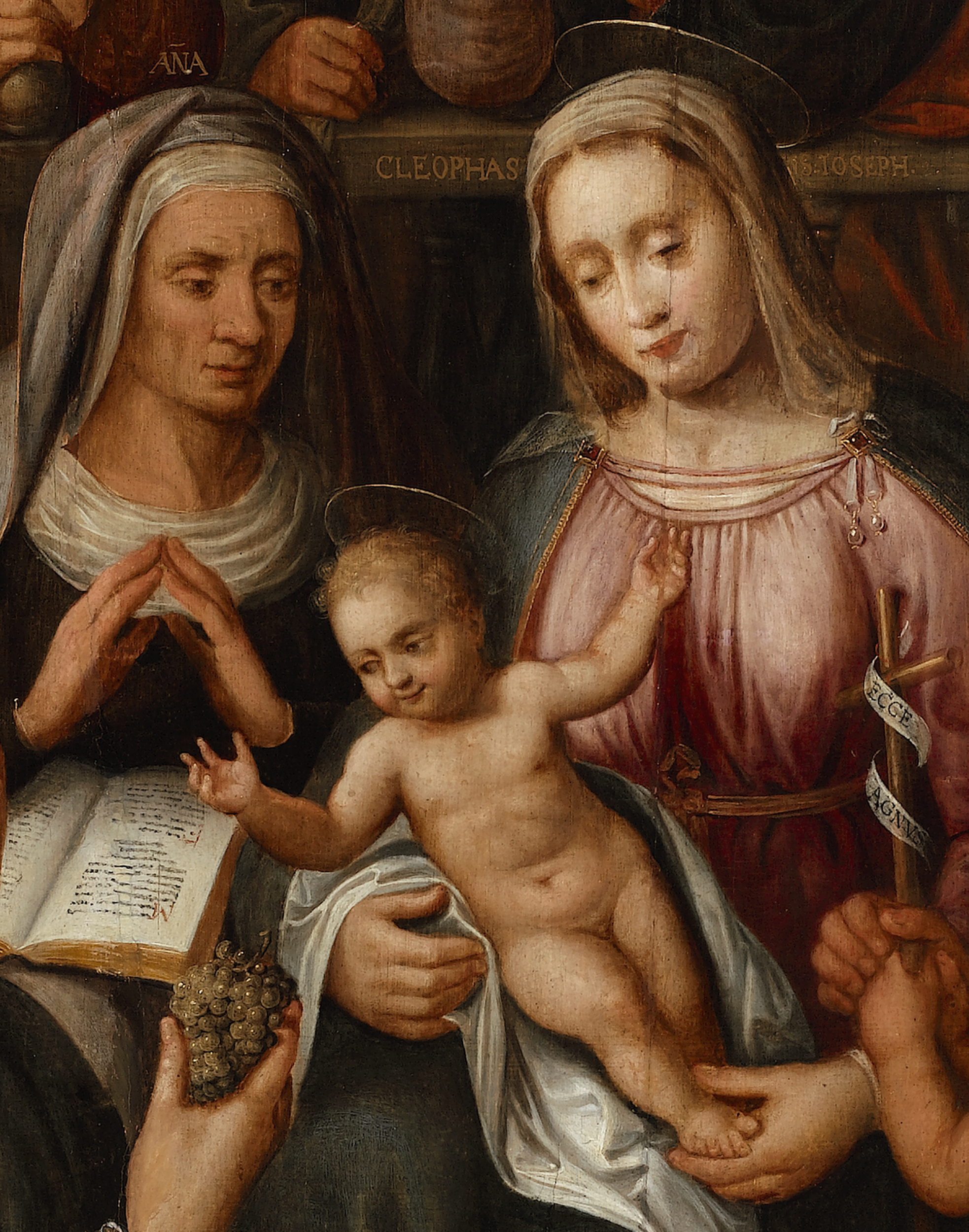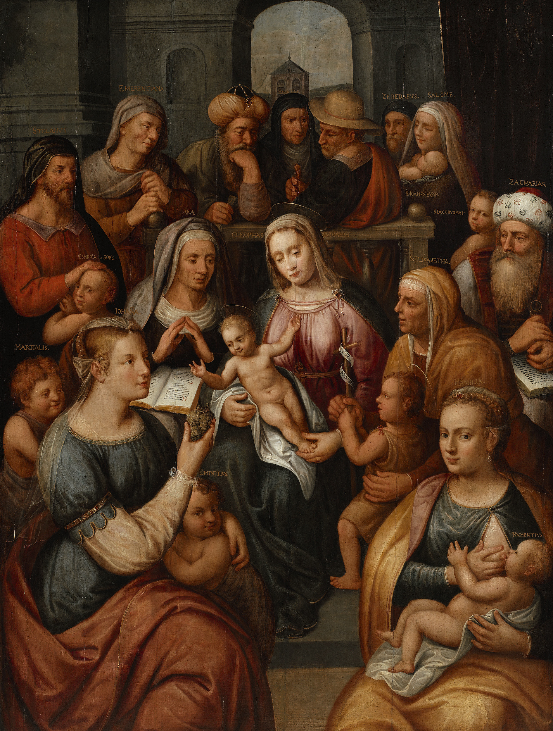 W centrum kompozycji widzimy Maryję trzymającą w ramionach Dzieciątko Jezus. Po ich prawej stronie zasiada Anna, matka Maryi, z otwartą księgą na kolanach. Miejsce po lewej stronie Maryi przypada rodzinie Jana Chrzciciela: on sam ukazany u stóp Jezusa trzyma swój atrybut – krzyżyk opleciony wstęgą z napisem: „Ecce agnus [Dei]”. Jego matka, Elżbieta, pochyla się nad nim, otaczając go ramionami, a ojciec, Zachariasz odziany w strój kapłański, siedzi nieopodal z księgą na kolanach i binoklami w dłoniach. Opiekun Dzieciątka, Józef, ukazany od tyłu na tle arkadowej bramy z widocznym w perspektywie budynkiem, odwraca się zza tralkowanej balustrady w stronę żony i synka. Spośród trzech mężów Anny przedstawiono jedynie Kleofasa, który przybrawszy pozę zamyślenia stoi obok Józefa. Odziany w szaty kapłańskie w prawym ręku trzyma zwój pergaminu. Obok niego stoi jego córka, Maria zw. Kleofasową, żona Alfeusza, a matka Jakuba Młodszego (Mniejszego), Barnaby, Szymona Zeloty, Judy Tadeusza (apostoła) i Jozesa. Trzecią córkę Anny, Marię Salomeę, widzimy za plecami Józefa, u boku męża Zebedeusza, z którym miała dwóch synów: Jana Ewangelistę, którego tuli w ramionach, i stojącego nieco poniżej Jakuba, zw. Starszym lub Większym. Za postacią Anny widzimy jej rodziców, Emerentię i siódmego z kolei jej męża, Stolanusa, głaszczącego po główce jej młodszą siostrę Esmerię (matkę Elżbiety, babcię Jana Chrzciciela). Krąg rodzinny zamykają zajmujące pierwszy plan obrazu: Joanna, która siedząc między Marcjanem i Eminicjuszem, podaje Jezusowi kiść winogron, i Mamilia, z Numencjuszem przy piersi, kierująca wzrok wprost na widza.
