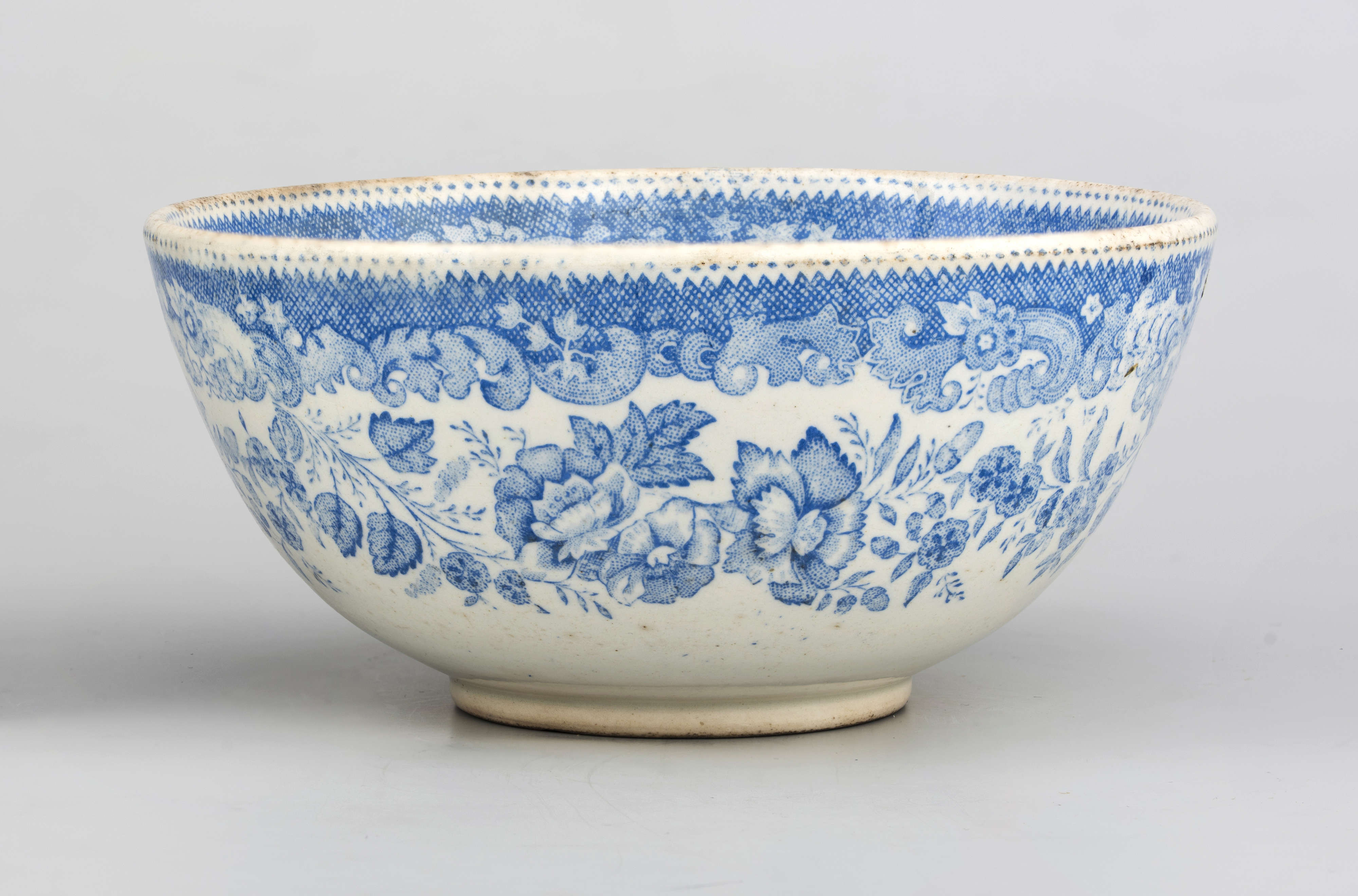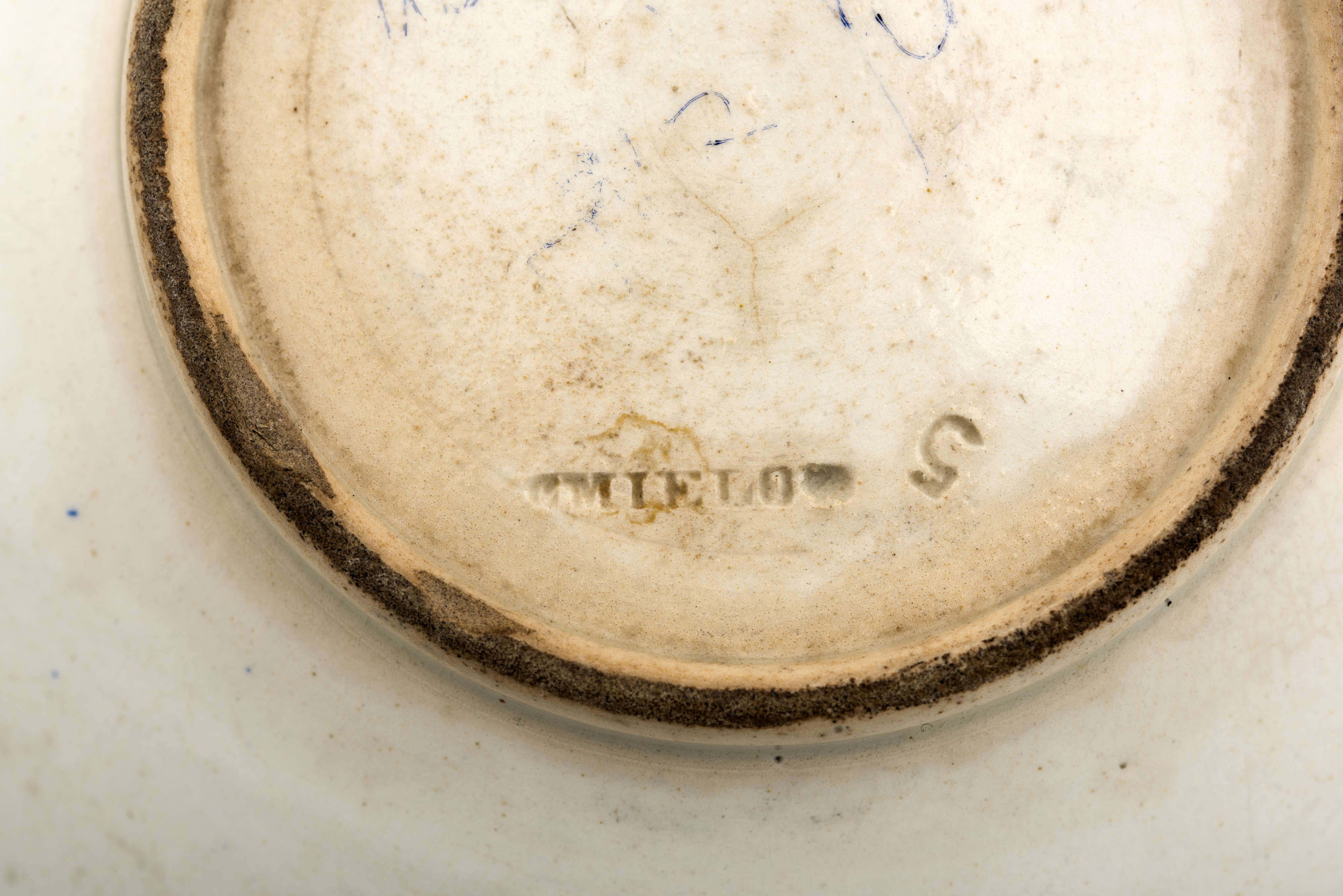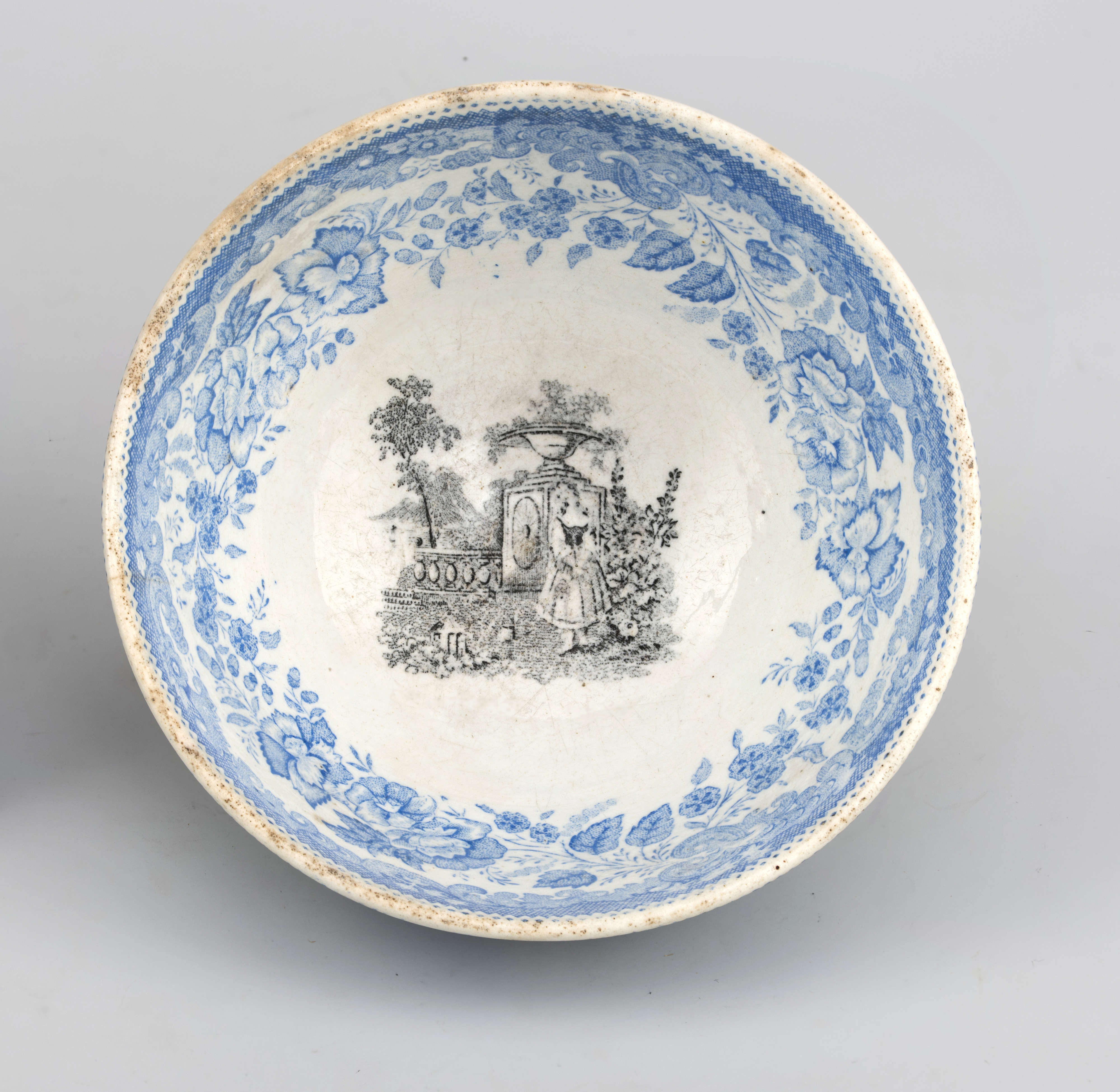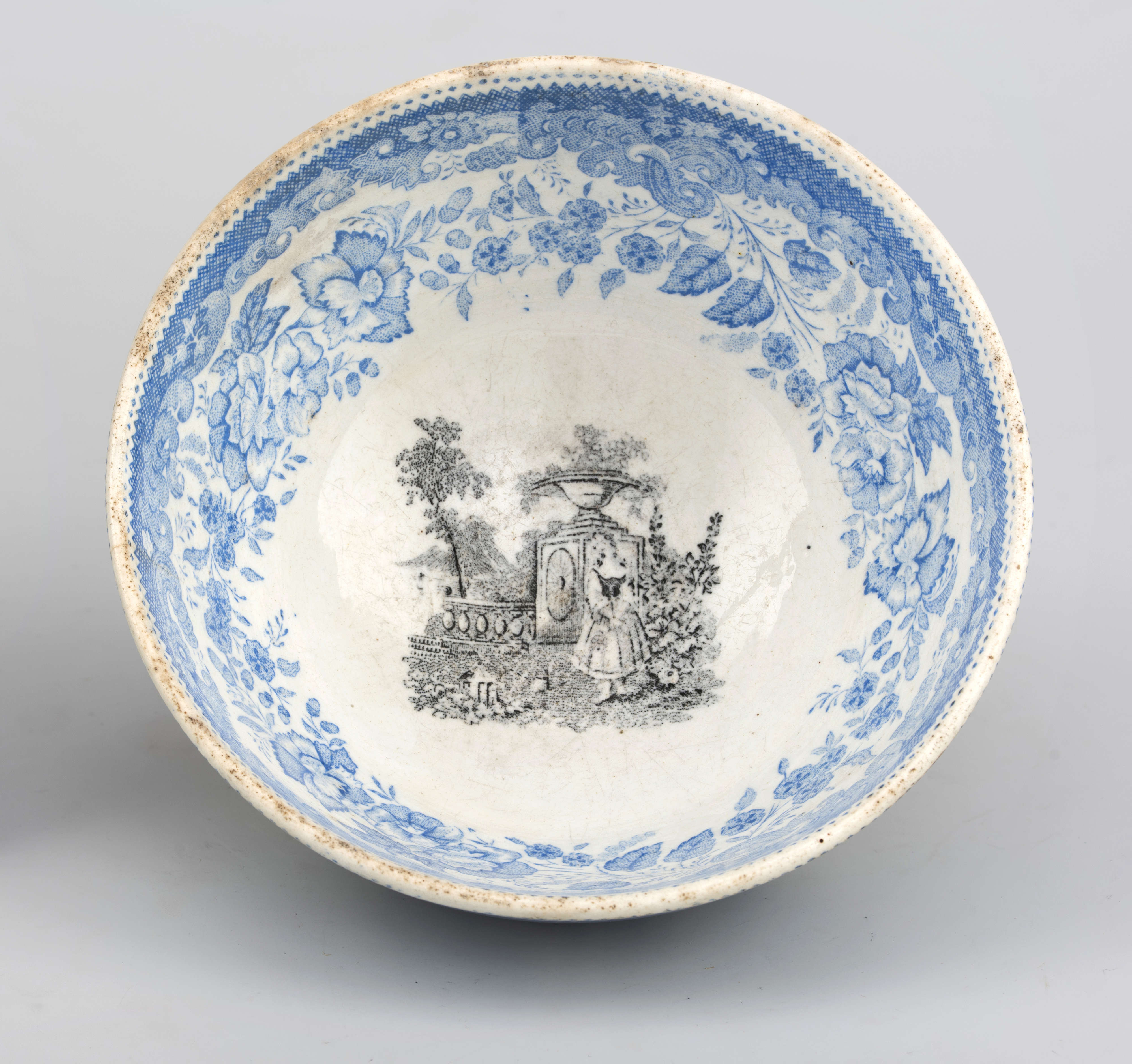 W manufakturze wytwarzano naczynia, którym nadawano zdobienia inspirowane wzorami fajansów angielskich o przyjętym i popularnym wówczas układzie dwubarwnym. Nie dziwi zatem fakt, iż zdobienia na półmiskach, talerzach, ażurowych koszyczkach czy dzbankach i sosjerkach odwoływały się do motywów roślinnych oraz sielankowych scenek rodzajowo-pejzażowych w kolorze czarnym. Półkolista miseczka na niskiej, okrągłej stopce od strony zewnętrznej została pokryta nadrukiem w kolorze błękitnym z wzorem wolut i ukwieconych gałązek róży i goździków. Natomiast w lustrze naczynia można dostrzec scenę rodzajową przedstawiającą młodą dziewczynę w ogrodzie z elementami małej architektury, w kolorze czarnym.