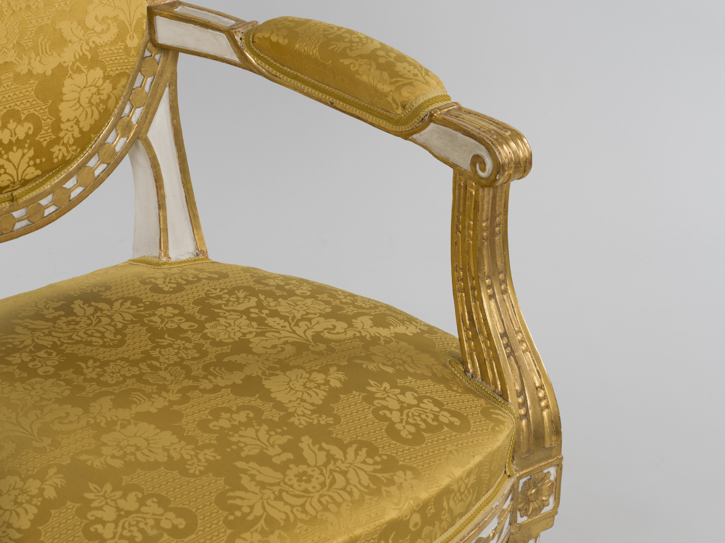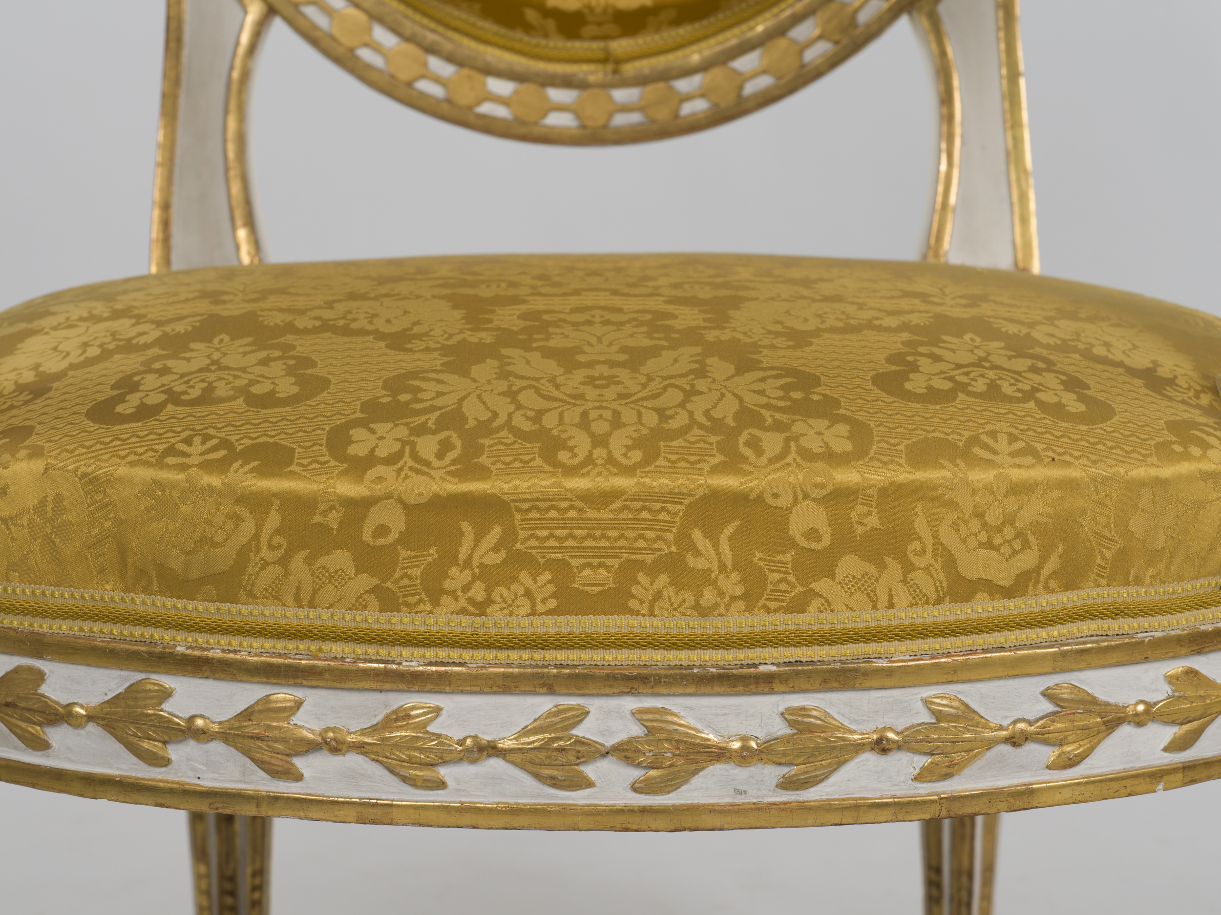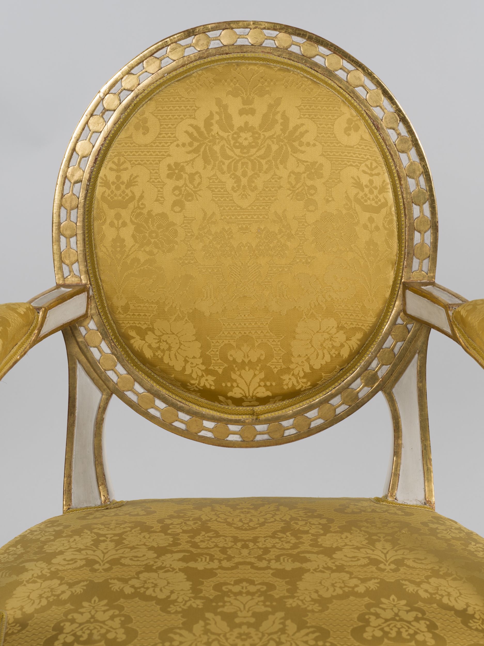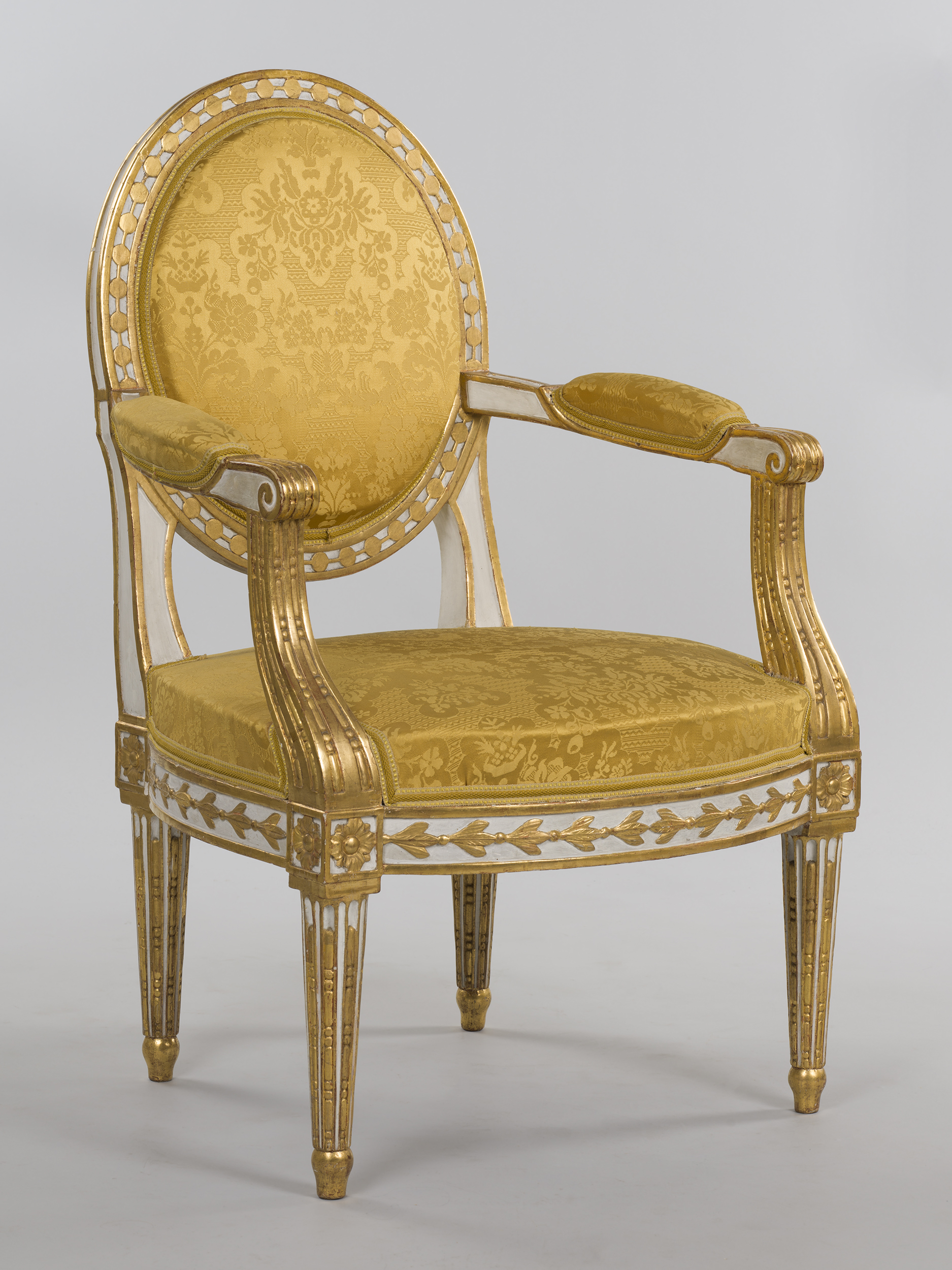 Klasyczny fotel typu „foteuil medaillon” na czterech zwężających się ku dołowi nóżkach. Poręcze częściowo tapicerowane zakończone niewielką wolutą. Ich lekko wygięte podparcia stanowią jedność konstrukcyjną z przednimi nogami. Powierzchnia polichromowana biało stanowi tło dla rzeźbionych i złoconych dekoracji. W oparciu pleców motyw nieco rozsuniętych, połączonych perełek; na bokach i przodzie kargi kampanule, w kanelowanych oparciach poręczy i nogach motyw astragalu. Oparcie pleców, siedzisko i poręcze tapicerowane, pokryte współczesną tkaniną.