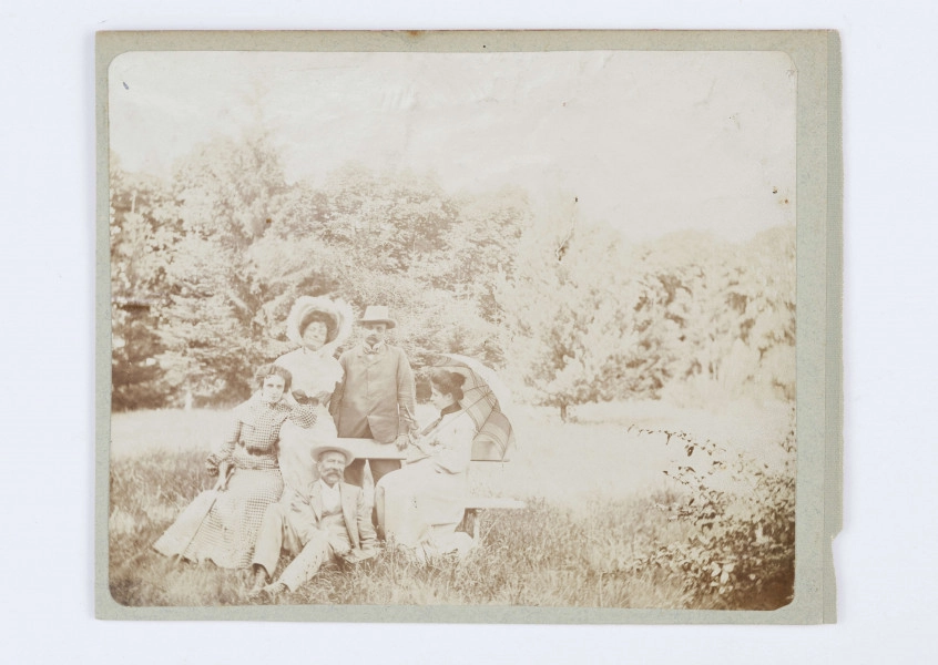 Grupa osób w parku nałęczowskim (m.in. Julia Dąbrowska)